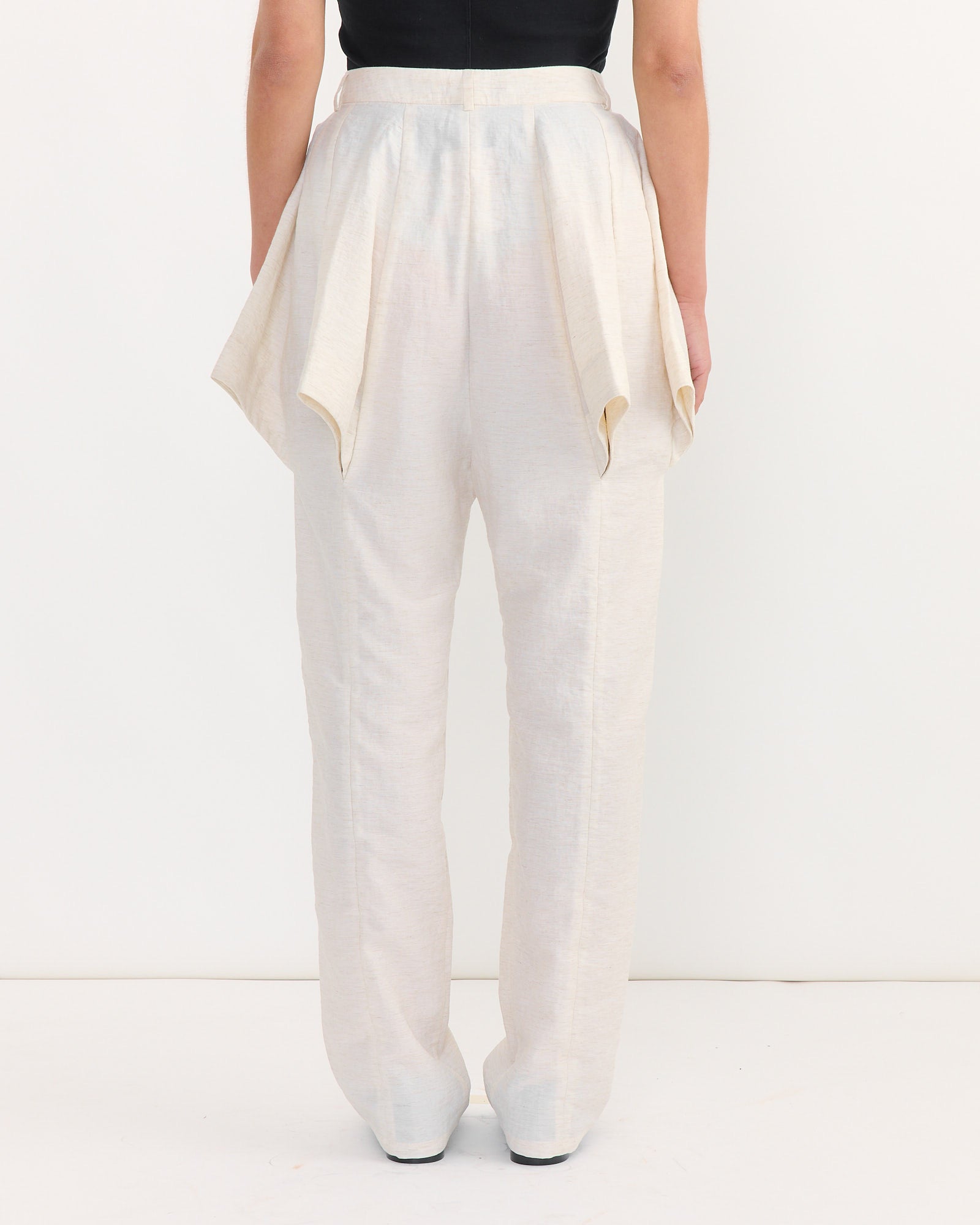 The J. Kim Lazzat Sculptural Trouser in Linnen Beige is crafted with seamless tailoring from a textured, wrinkled fabric. This relaxed-fit style merges traditional trouser construction with sculptural wedge-inspired panels and contrast cutouts. Finished with side seam pockets and a concealed zip.