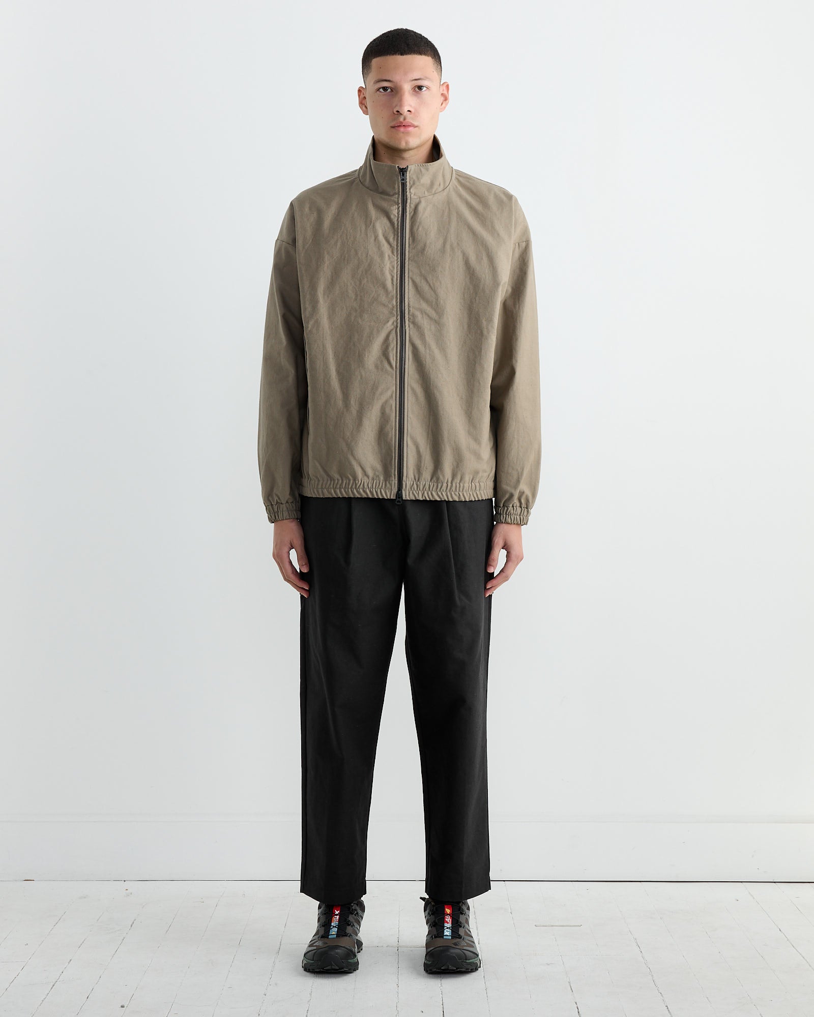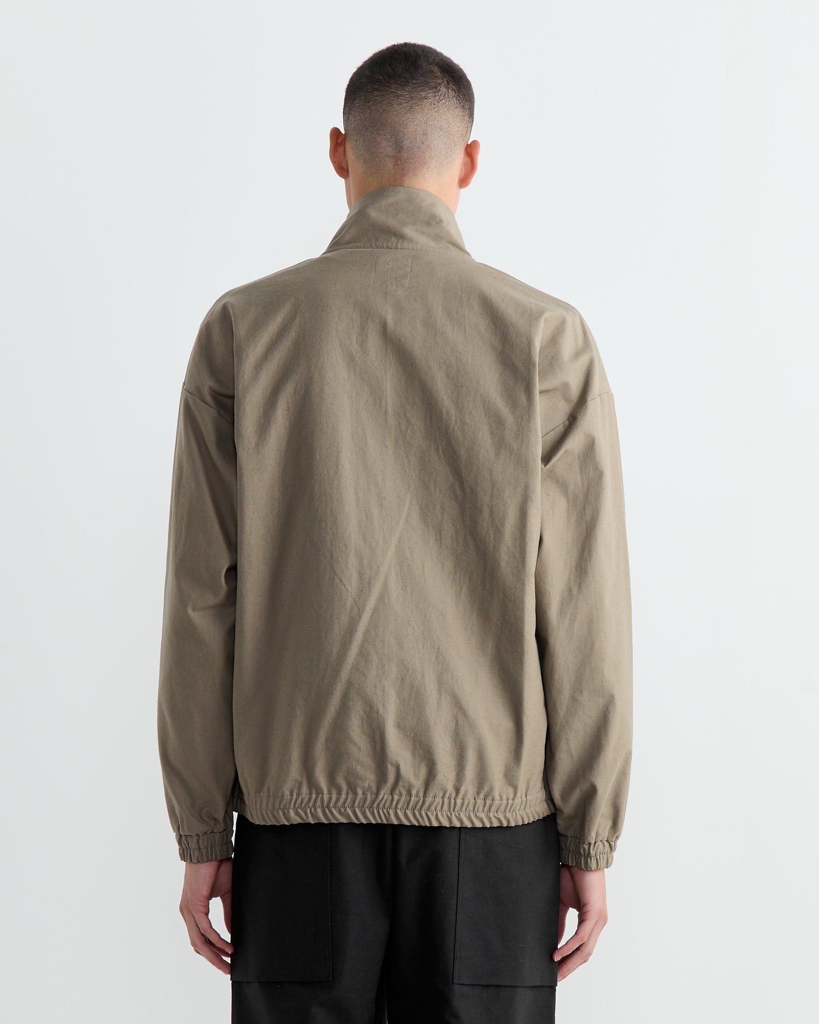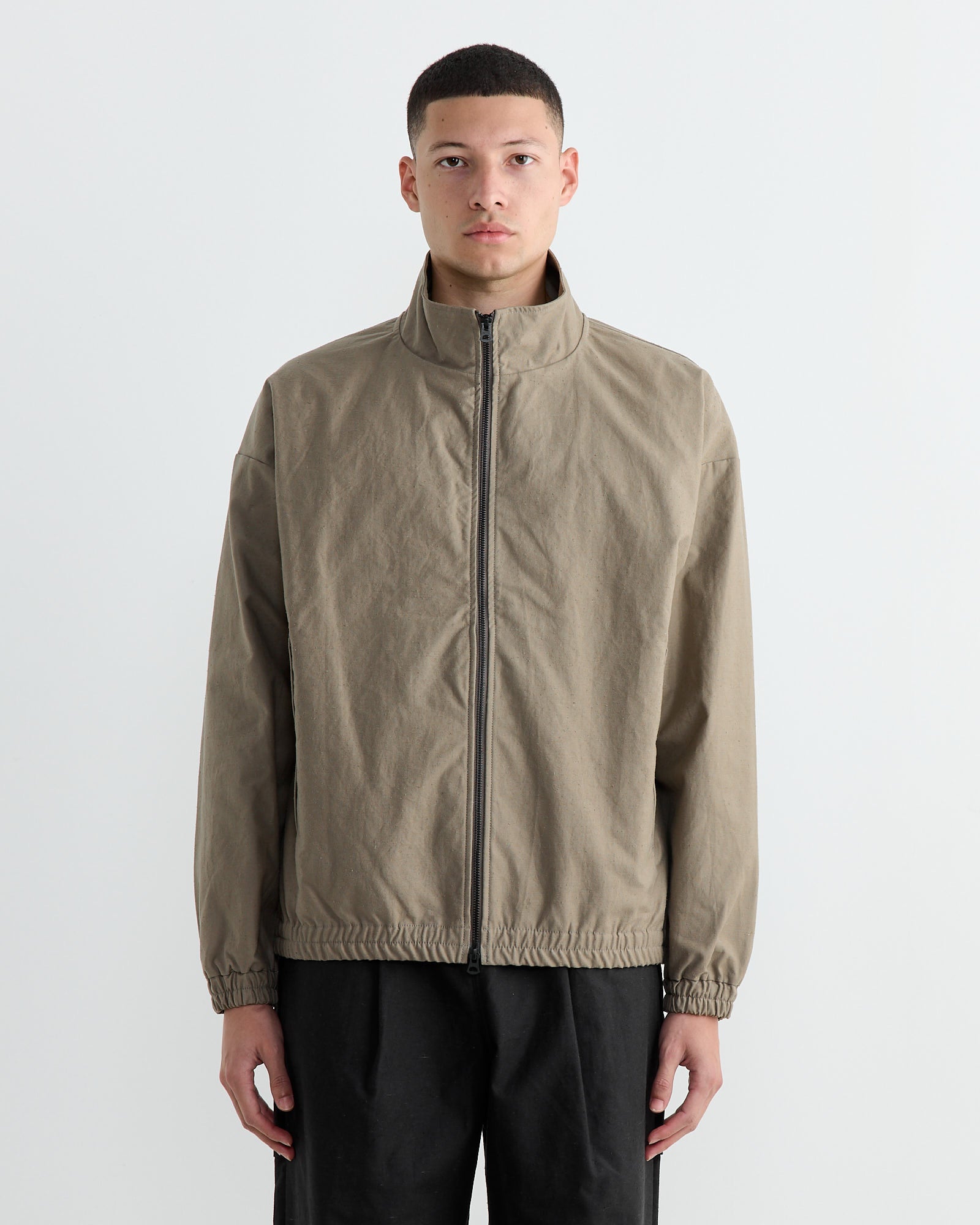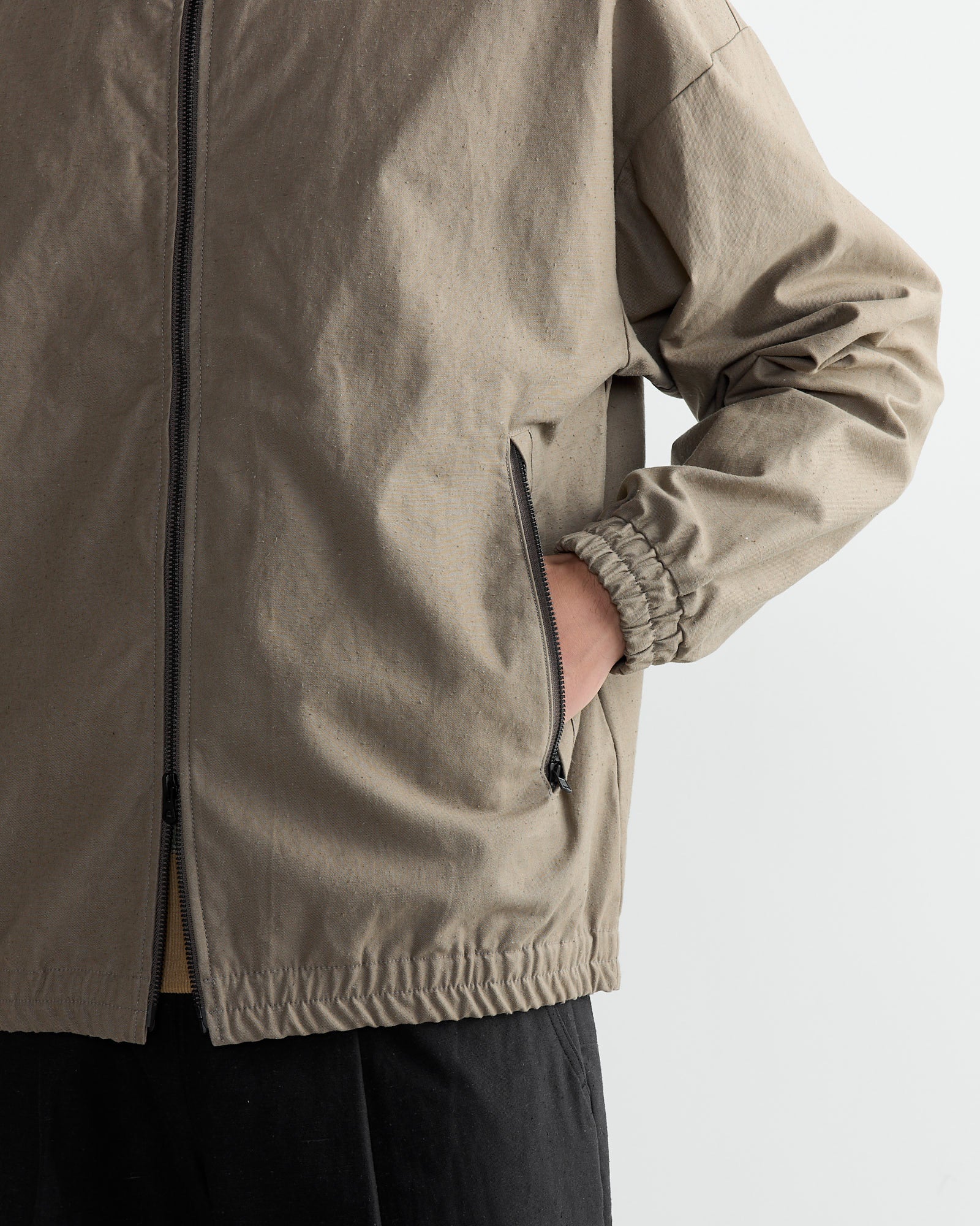The Jackman Back Nep Bullpen Jacket in Sepia offers a relaxed fit with a stand-up collar and drop shoulders. It features elastic shirring at the cuffs and hem, and a large zippered pocket for easy access.