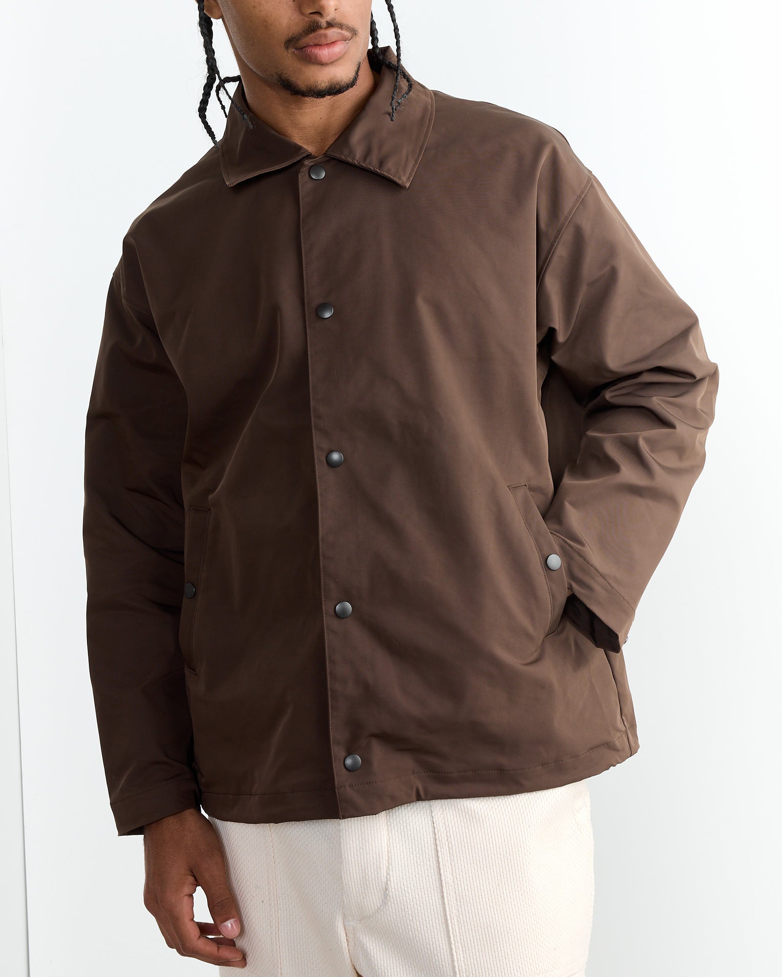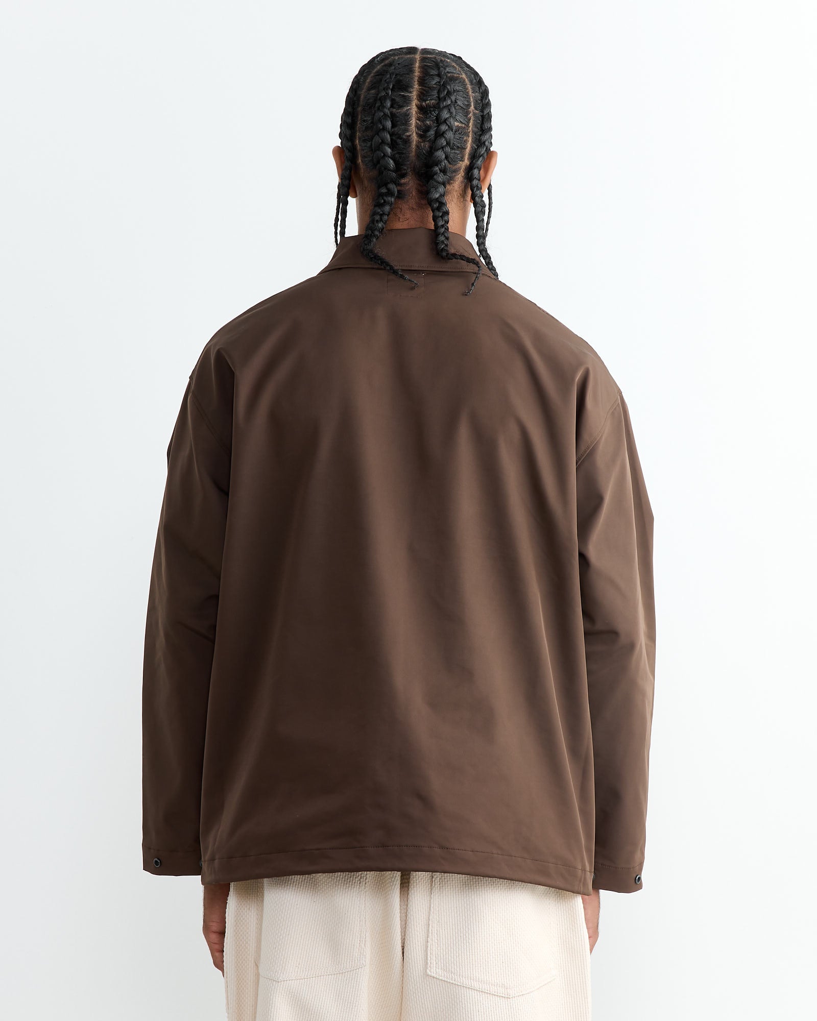 The Jackman OX Coach Jacket in Brown is a modern take on the classic coach jacket, featuring a boxy silhouette with roomy armholes for comfort. Crafted from densely woven polyester Oxford fabric, it offers a subtle luster and durability. The jacket includes metal dot buttons on the front, pockets, and cuffs, adding a timeless touch.