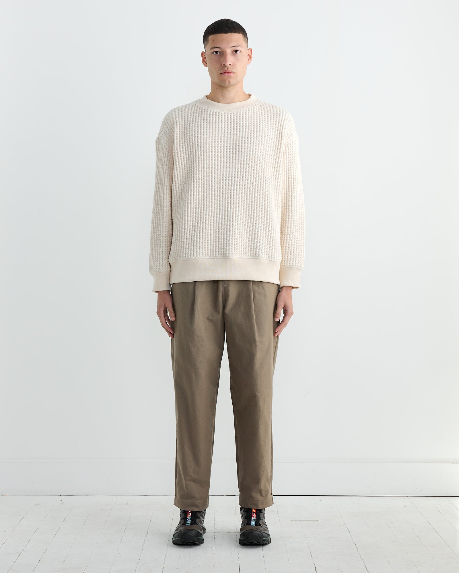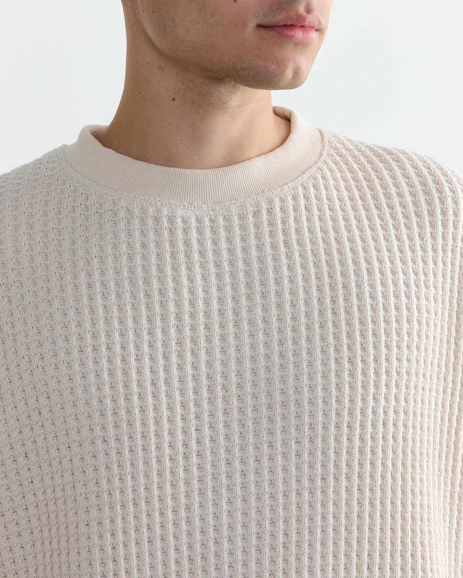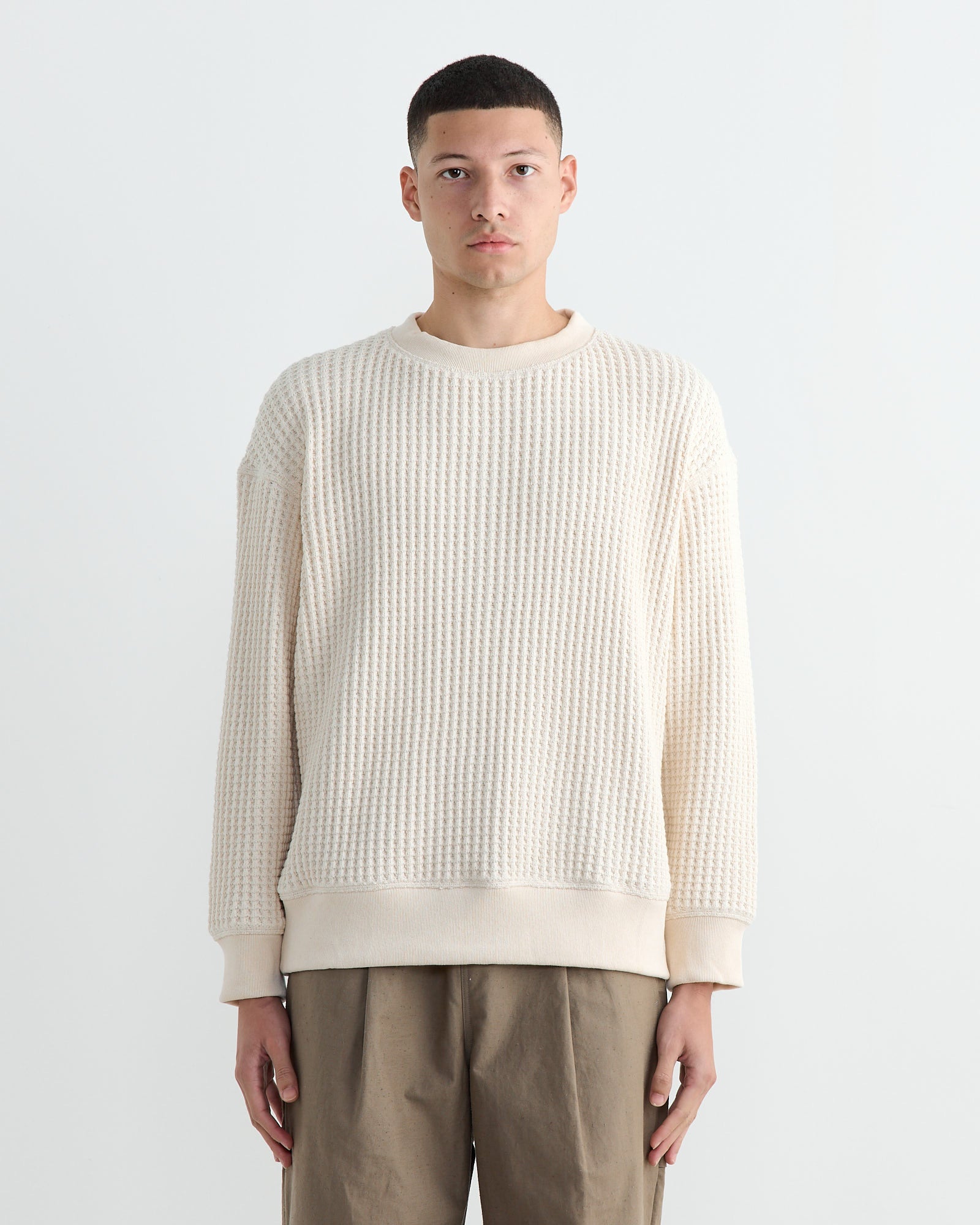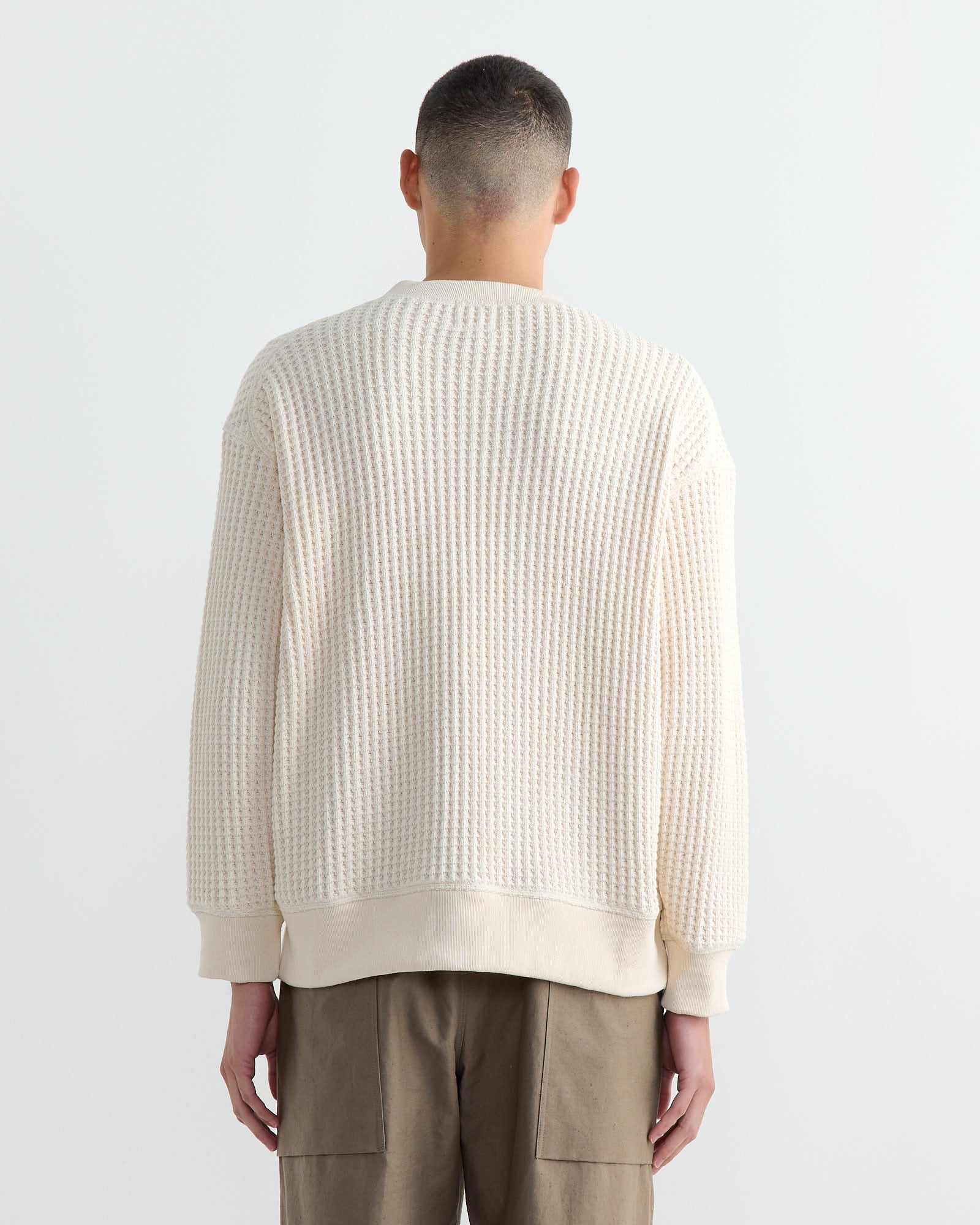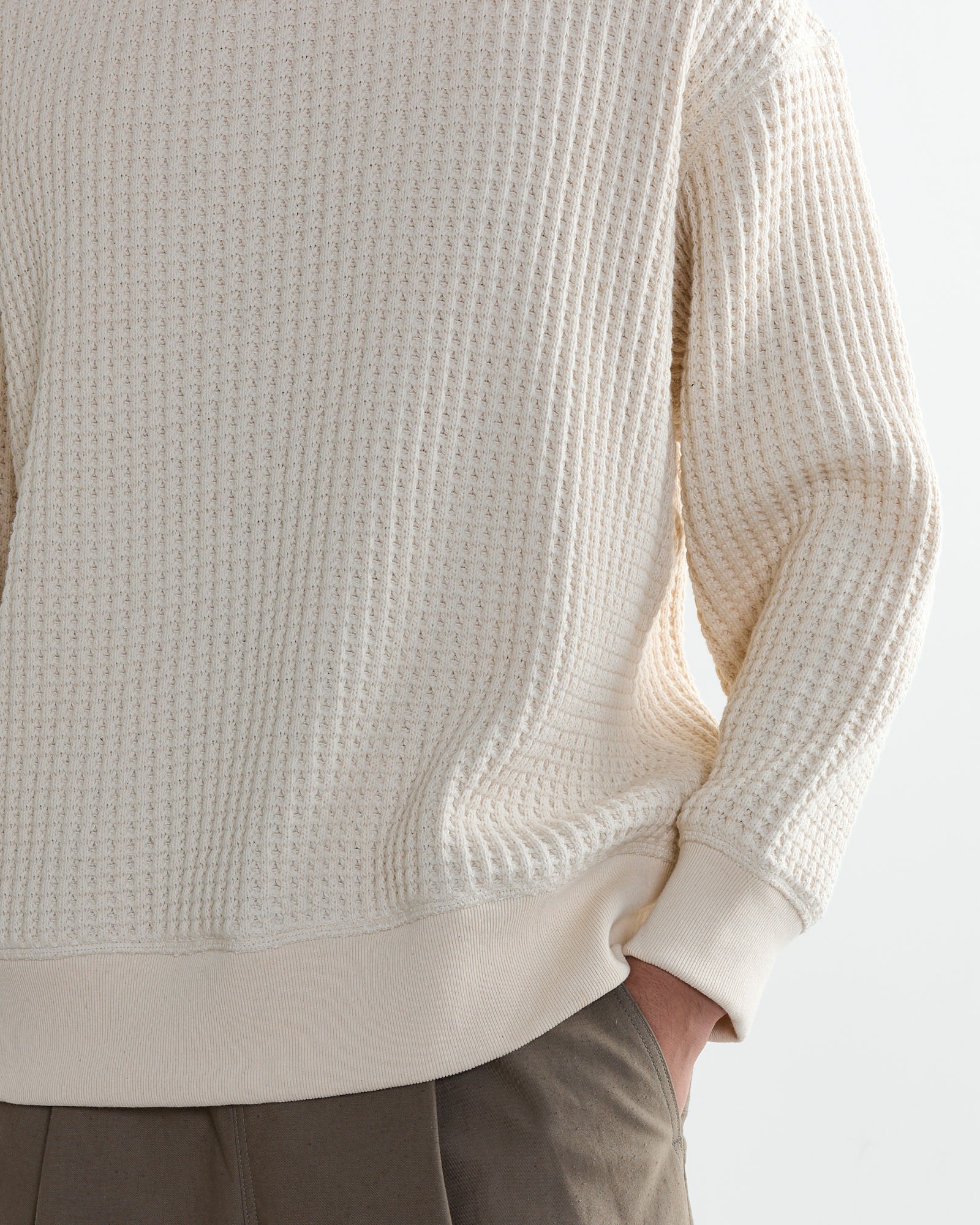 The Jackman Waffle Crewneck in Ivory is crafted from 100% cotton using a rare 5-gauge jacquard knitting machine, traditionally employed for wool, resulting in a lightweight yet thick waffle texture. This design offers a fluffy, bulky feel with a warm appearance, featuring a shallow front drop for a vintage-inspired look. The garment is carefully sewn to maintain the material’s natural texture.