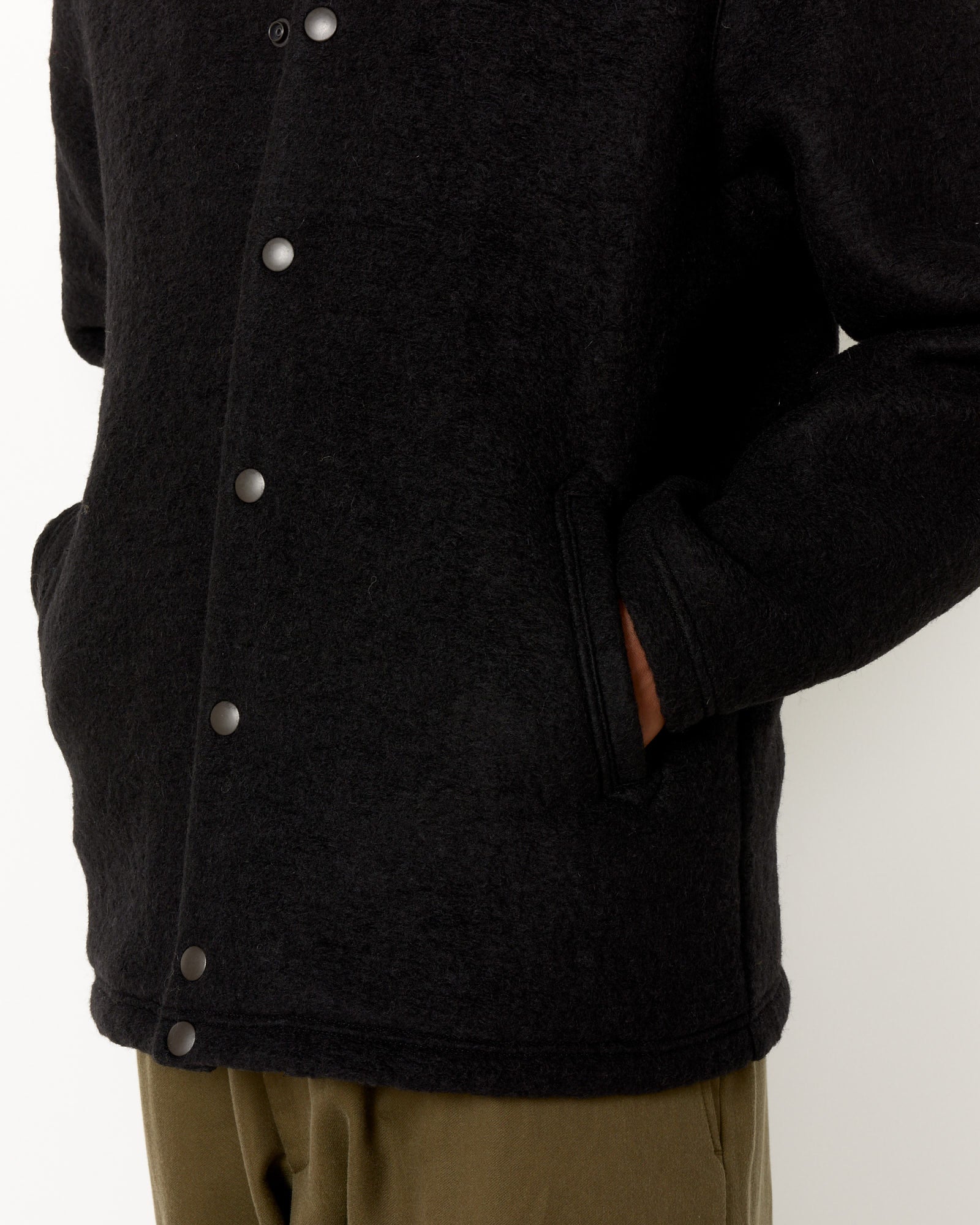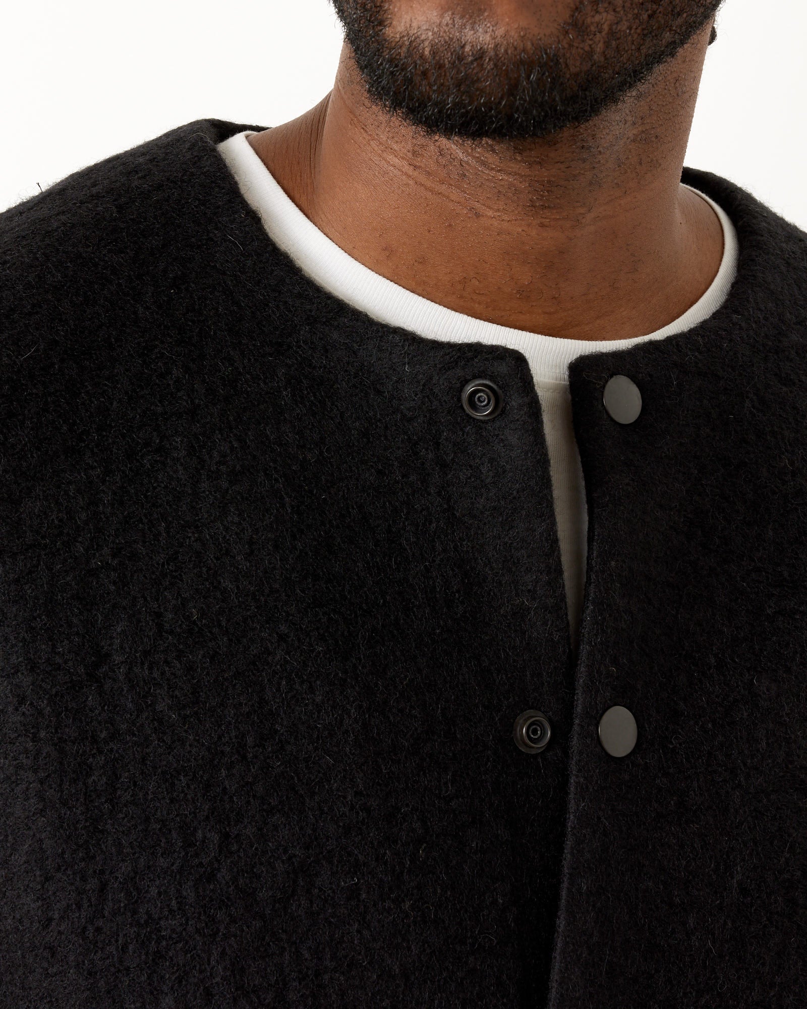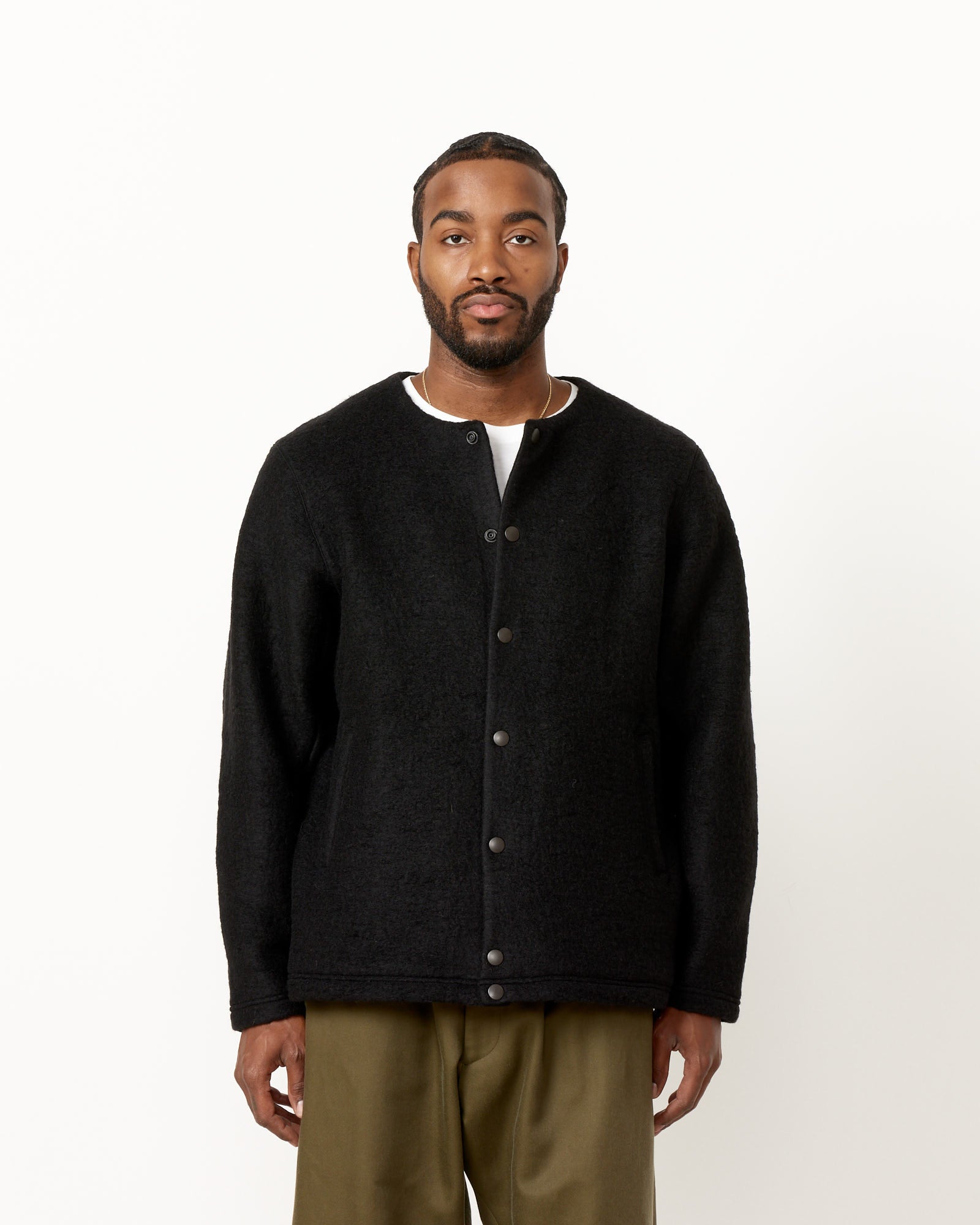 Jackman's Wool Collarless Jacket is a versatile garment that can be worn as a comfortable outer or mid-layer with a soft feel. Done without a collar, it features brass snaps, hand warmer pockets, and a straight silhouette.