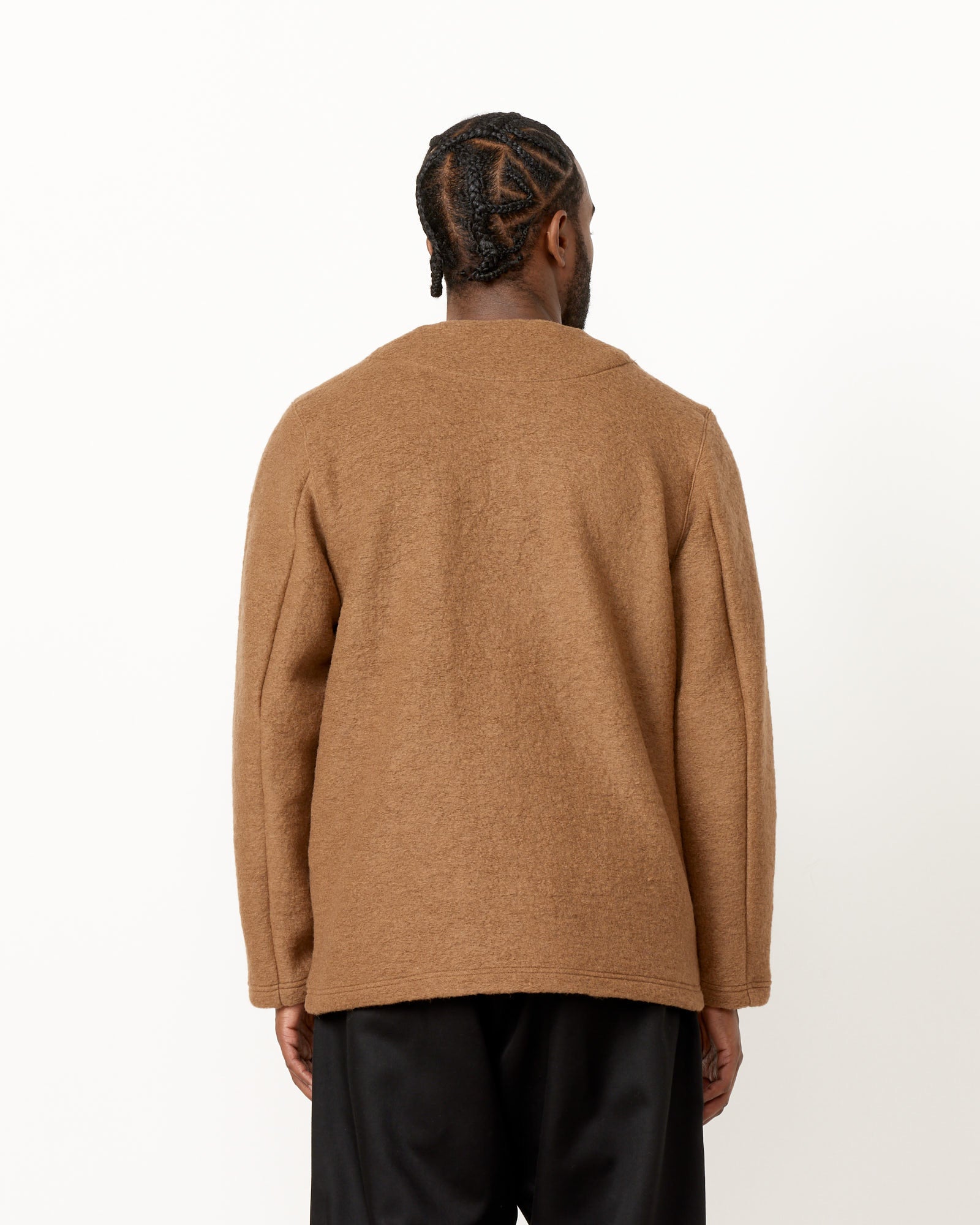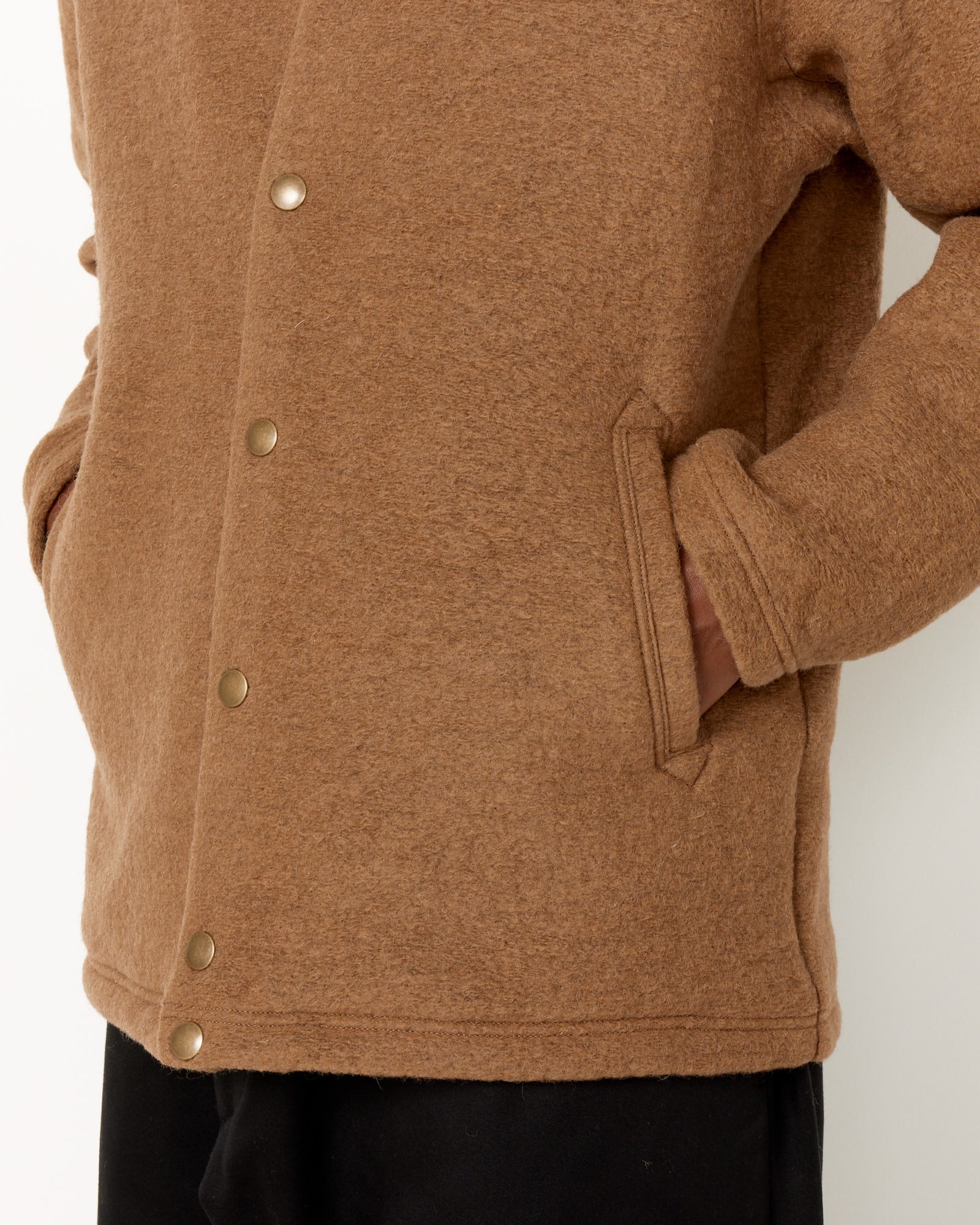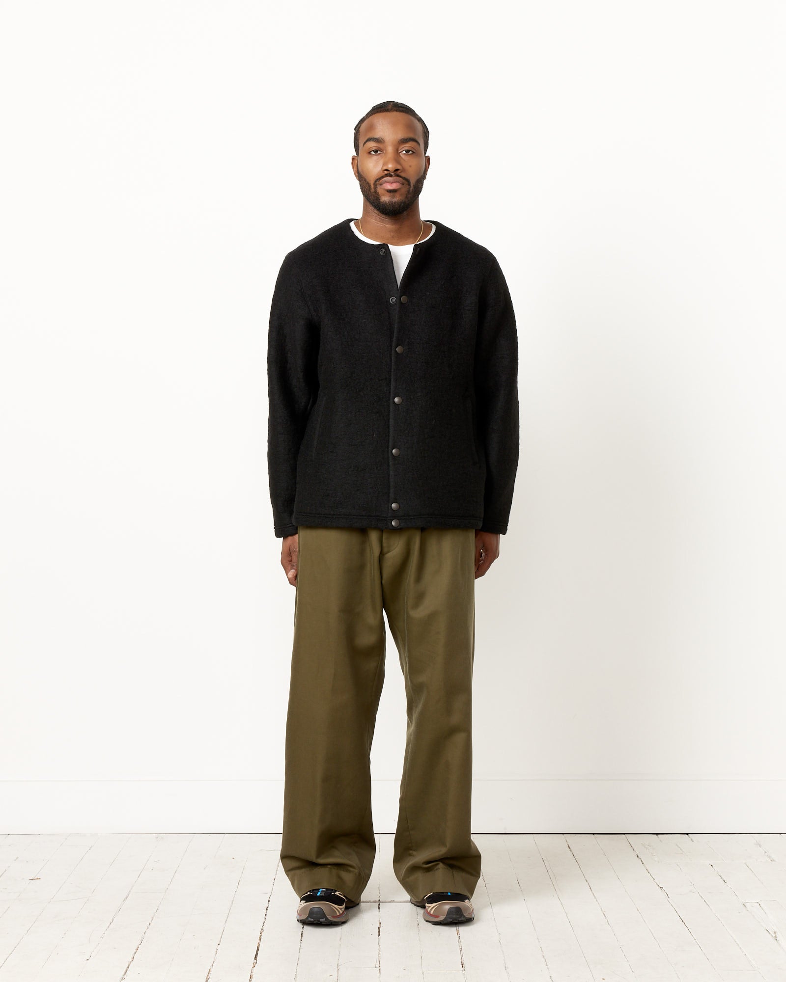 Jackman's Wool Collarless Jacket is a versatile garment that can be worn as a comfortable outer or mid-layer with a soft feel. Done without a collar, it features brass snaps, hand warmer pockets, and a straight silhouette.