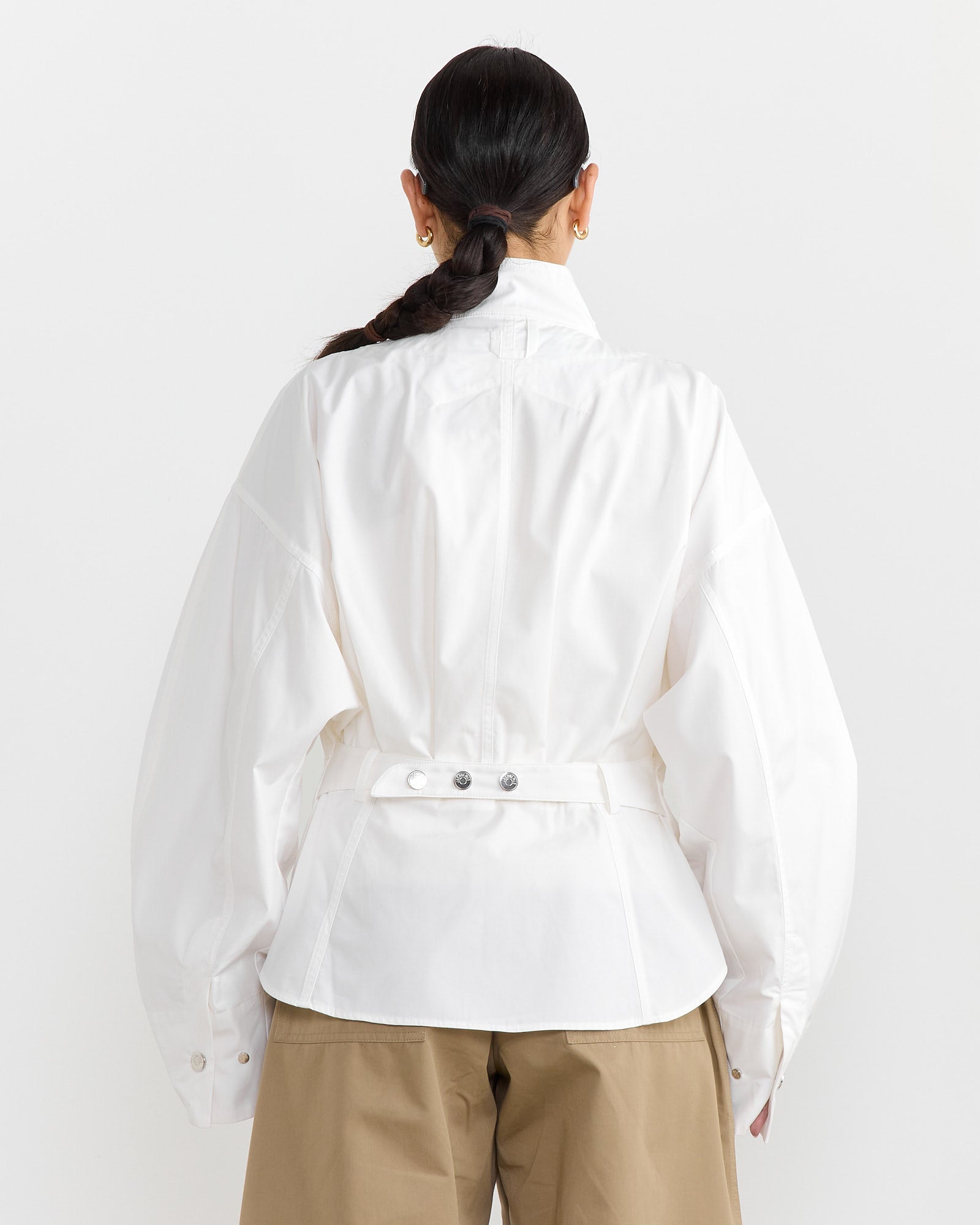 The Jacquemus La Chemise Ciro Shirt is a structured cotton shirt featuring a concealed front closure and a back strap detail with decorative buttons. Its clean lines and tailored fit make it a versatile addition to any wardrobe.