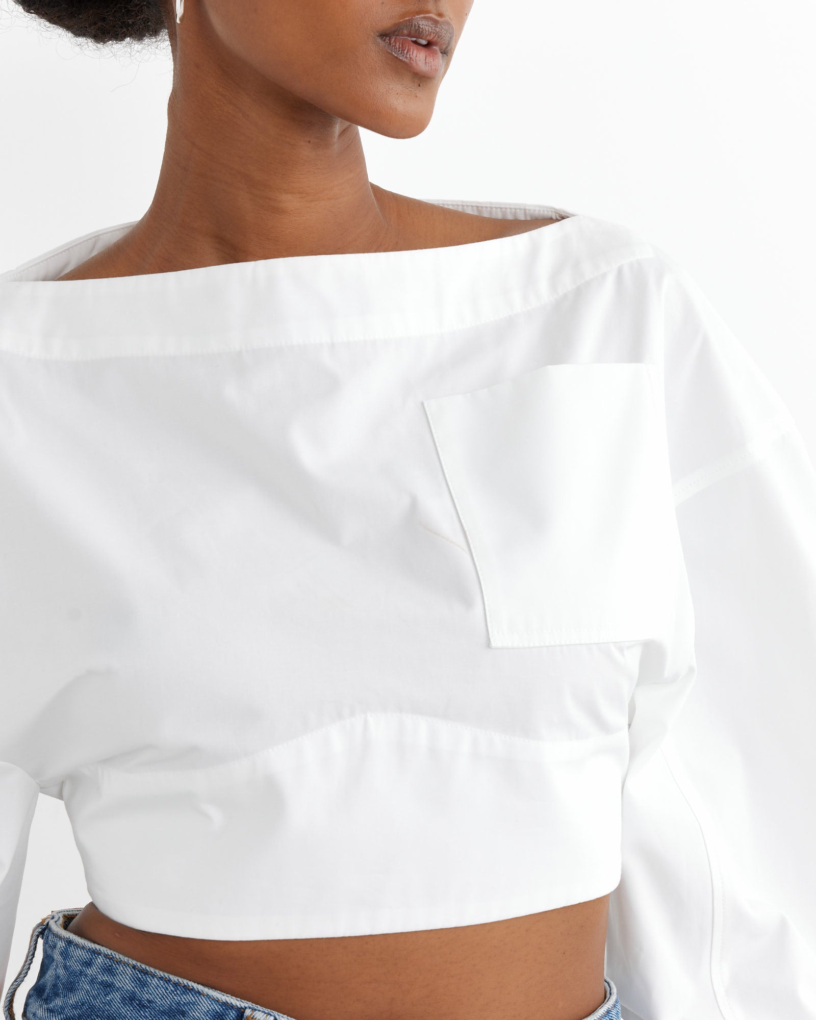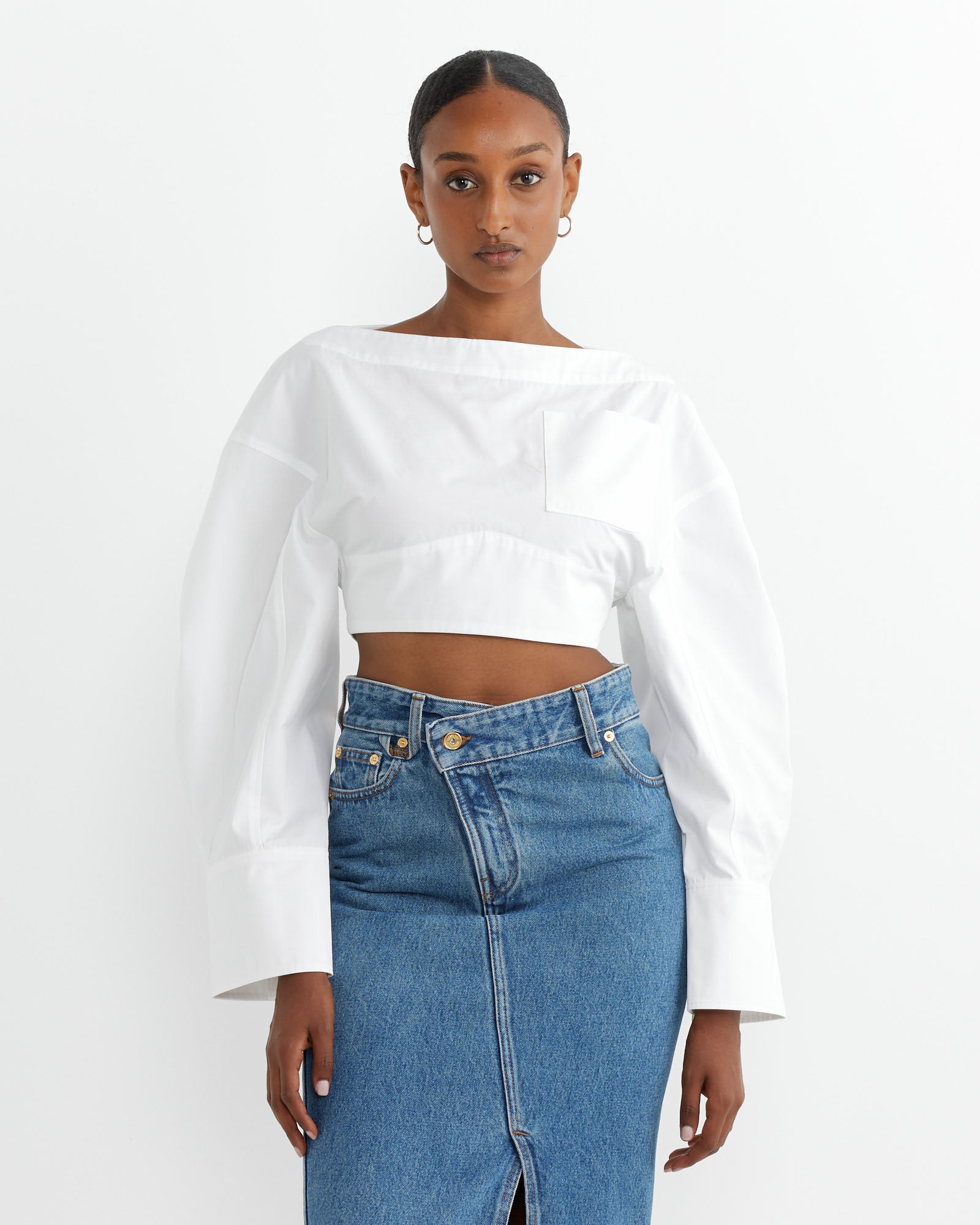 A sculptural shirt crafted from French cotton, Jacquemus' Le Haut Casaco Top features curved long sleeves that are wide and elongated, a belted hem with adjustment at the back, and a surplice open back.