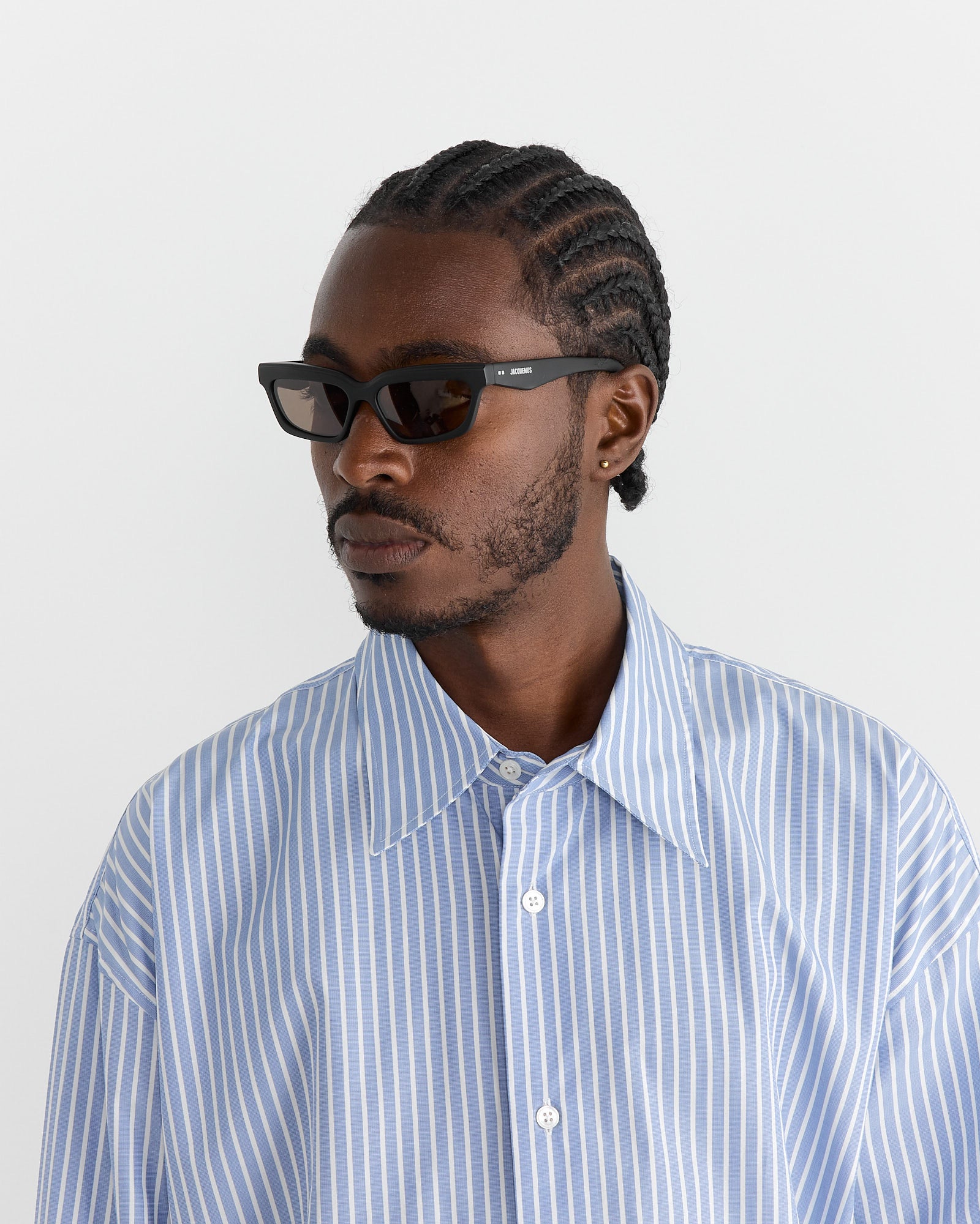 The Jacquemus x Linda Farrow Salon Sunglasses in Matte Black/Silver/Grey are crafted from black acetate with a sleek rectangular silhouette. Paired with grey-tinted lenses, they provide 100% UV protection while maintaining a refined, modern aesthetic. A collaboration that merges Jacquemus' bold design with Linda Farrow's eyewear expertise, these sunglasses are a versatile statement piece.