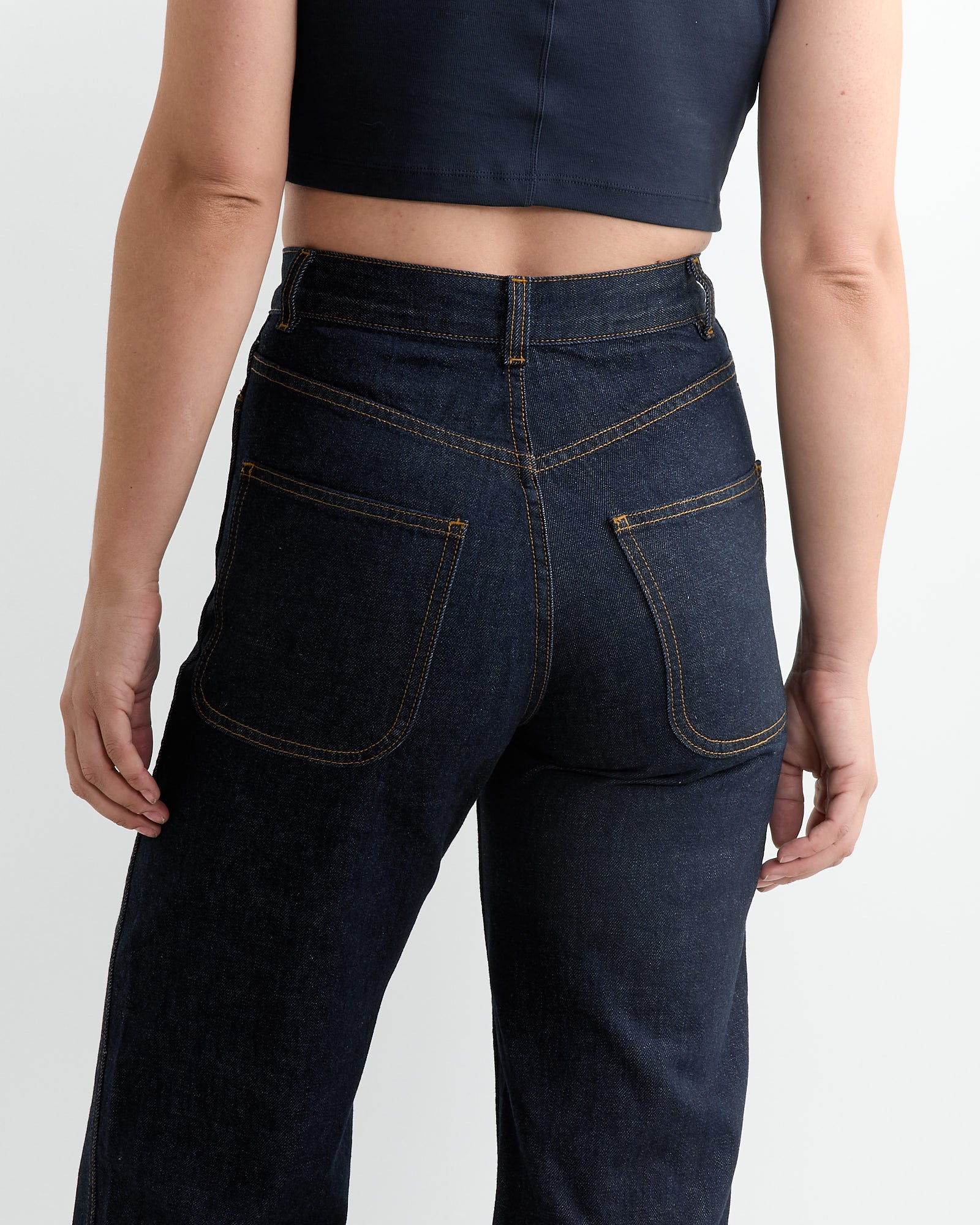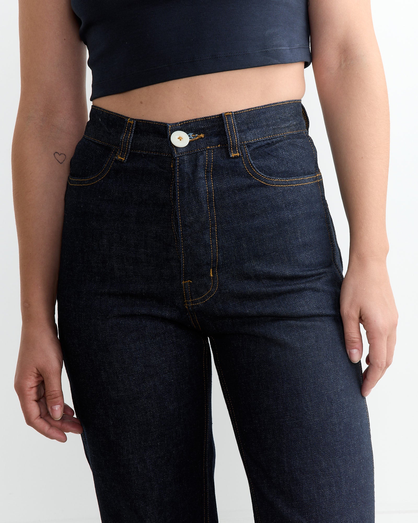 The Jesse Kamm 225 Jeans in Dark Blue with Gold Stitching are high-waisted, plain-front jeans featuring a straight leg and four-pocket construction. Crafted from 13 oz Japanese denim, they offer a structured fit that molds to your body over time.