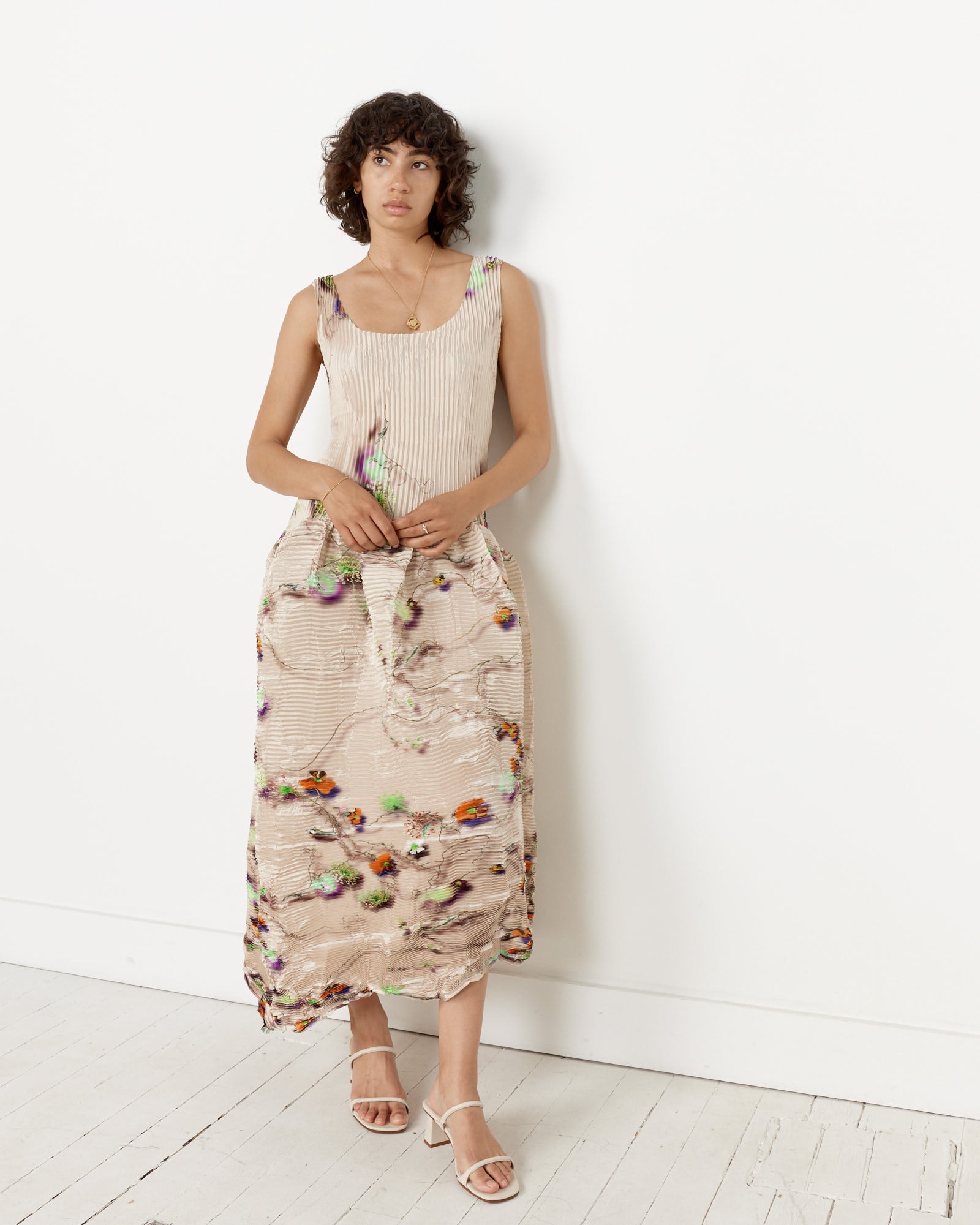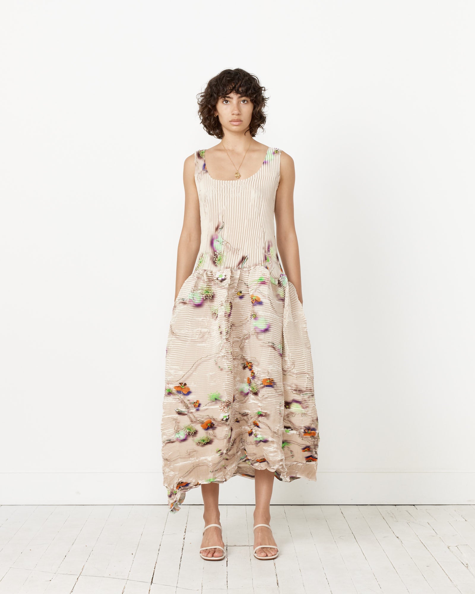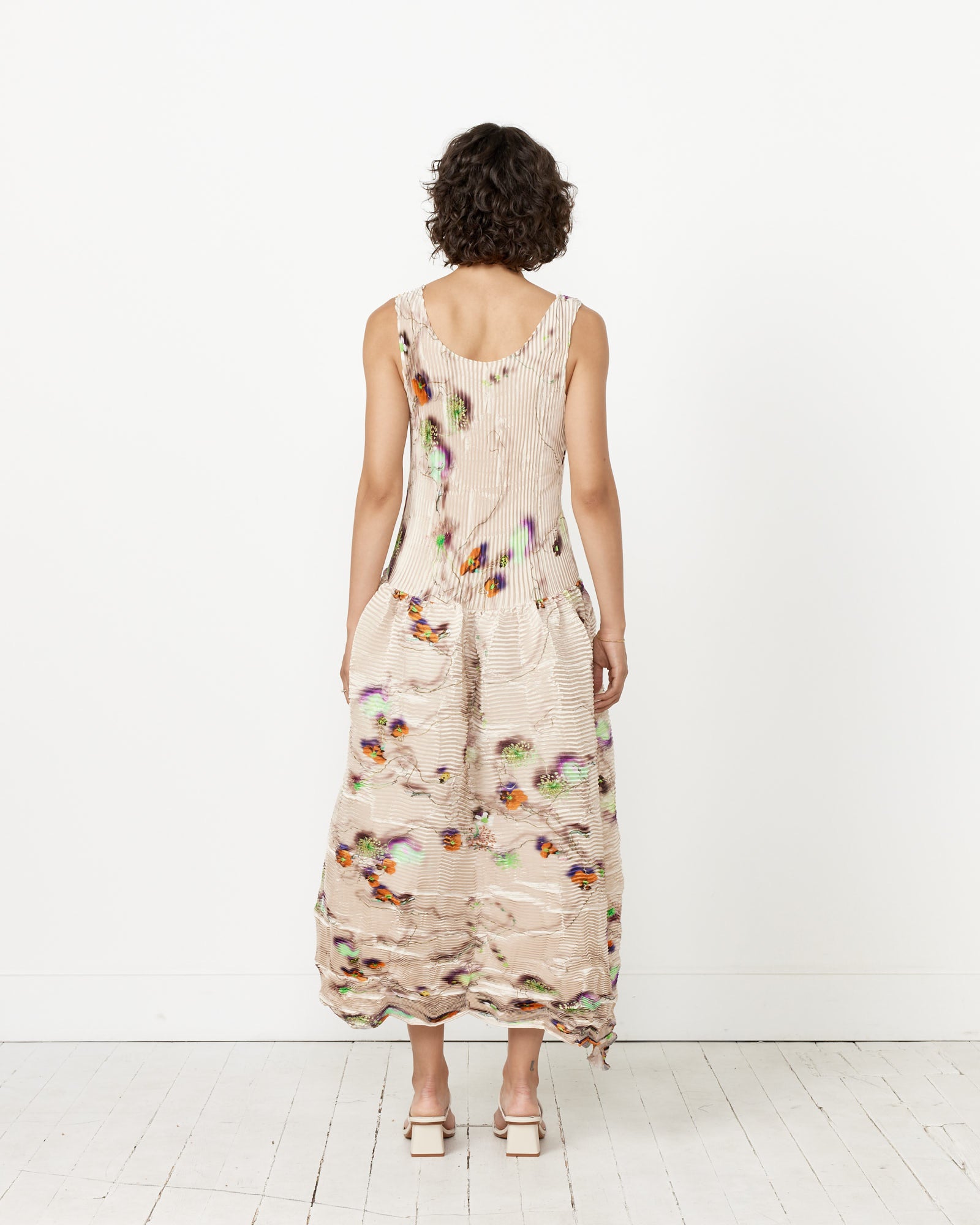 A unique dress combining a two-step garment-pleating process with a crushing technique, resulting in an exceptional texture, Julia Heuer's wrinkle-resistant Luna Dress is adorned in an exclusive in-house designed print, cut in a relaxed fit, and features a drop waist with a flounced skirt and hidden pockets.