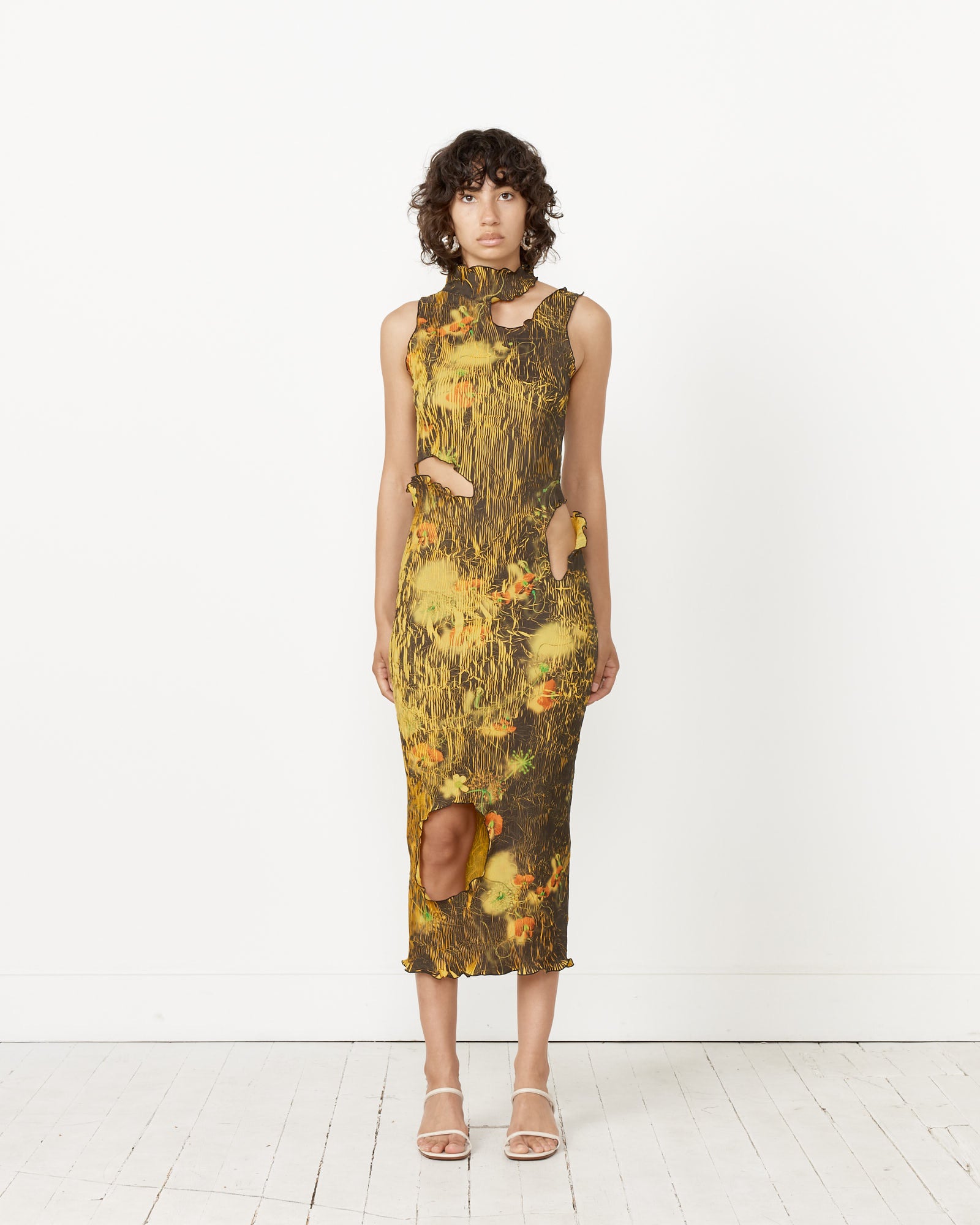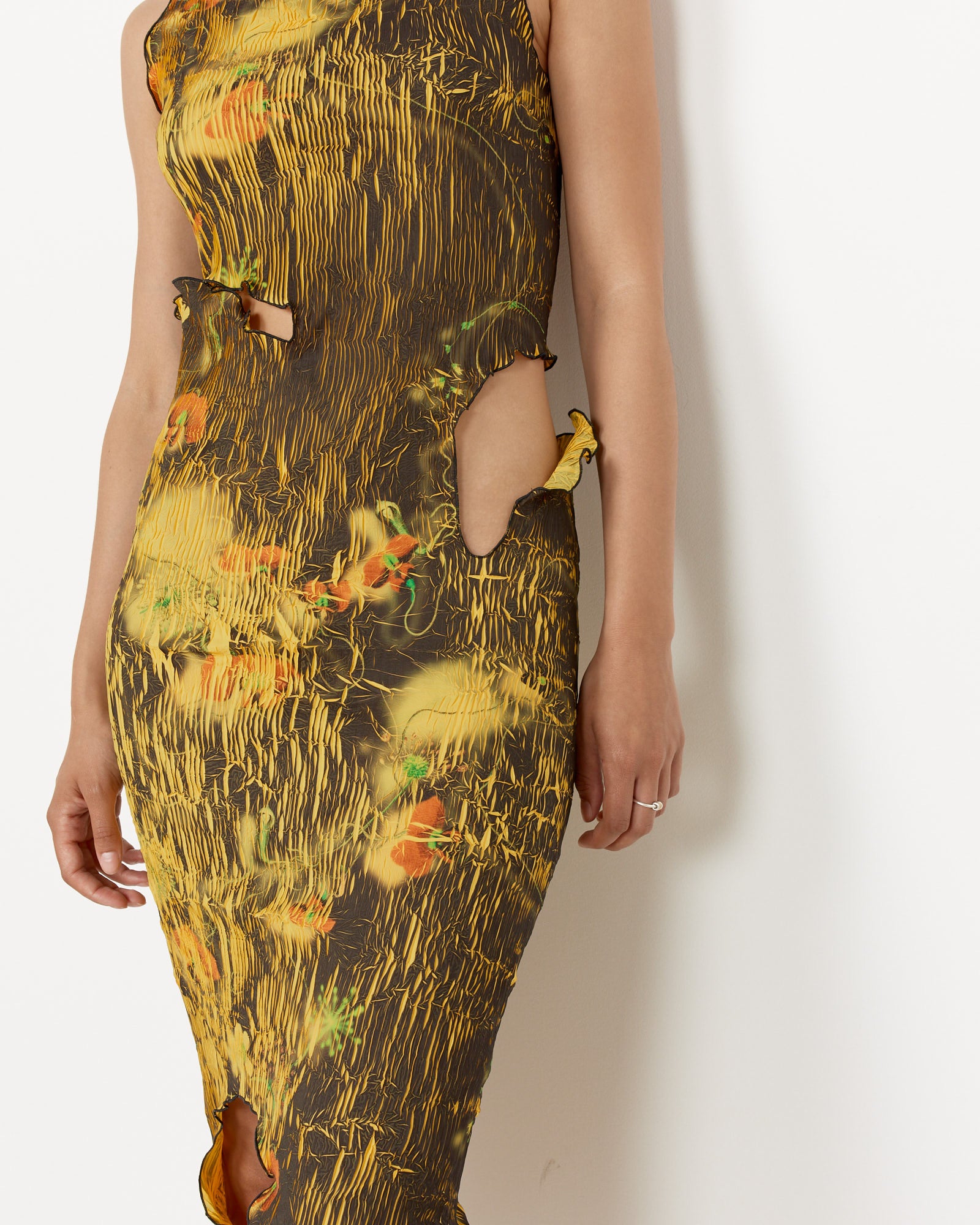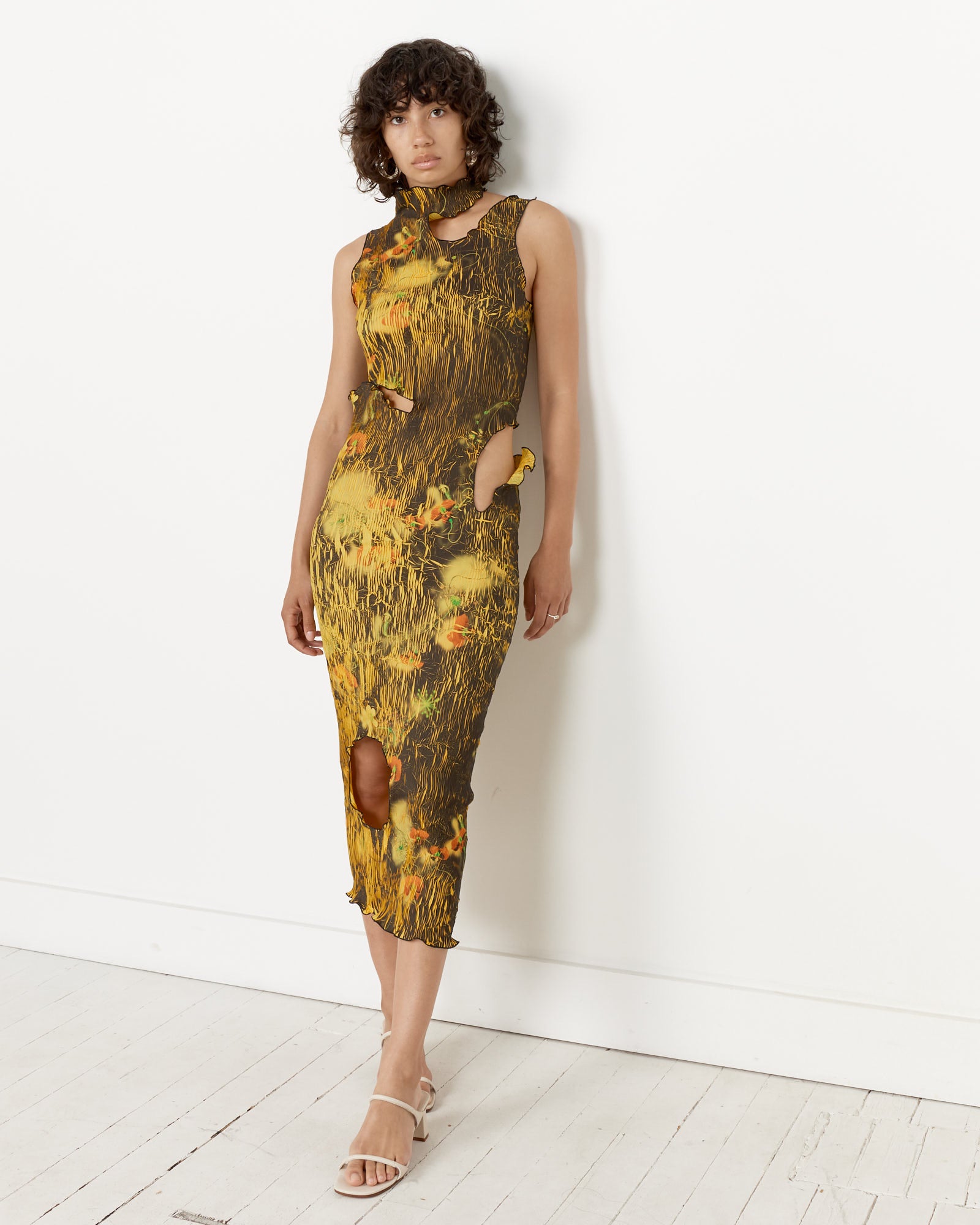 Julia Heuer's captivating Tiago Dress features an exclusive, in-house design printed over a lightweight garment-pleated polyester with cut-out detailing and lettuce-edge trim.
