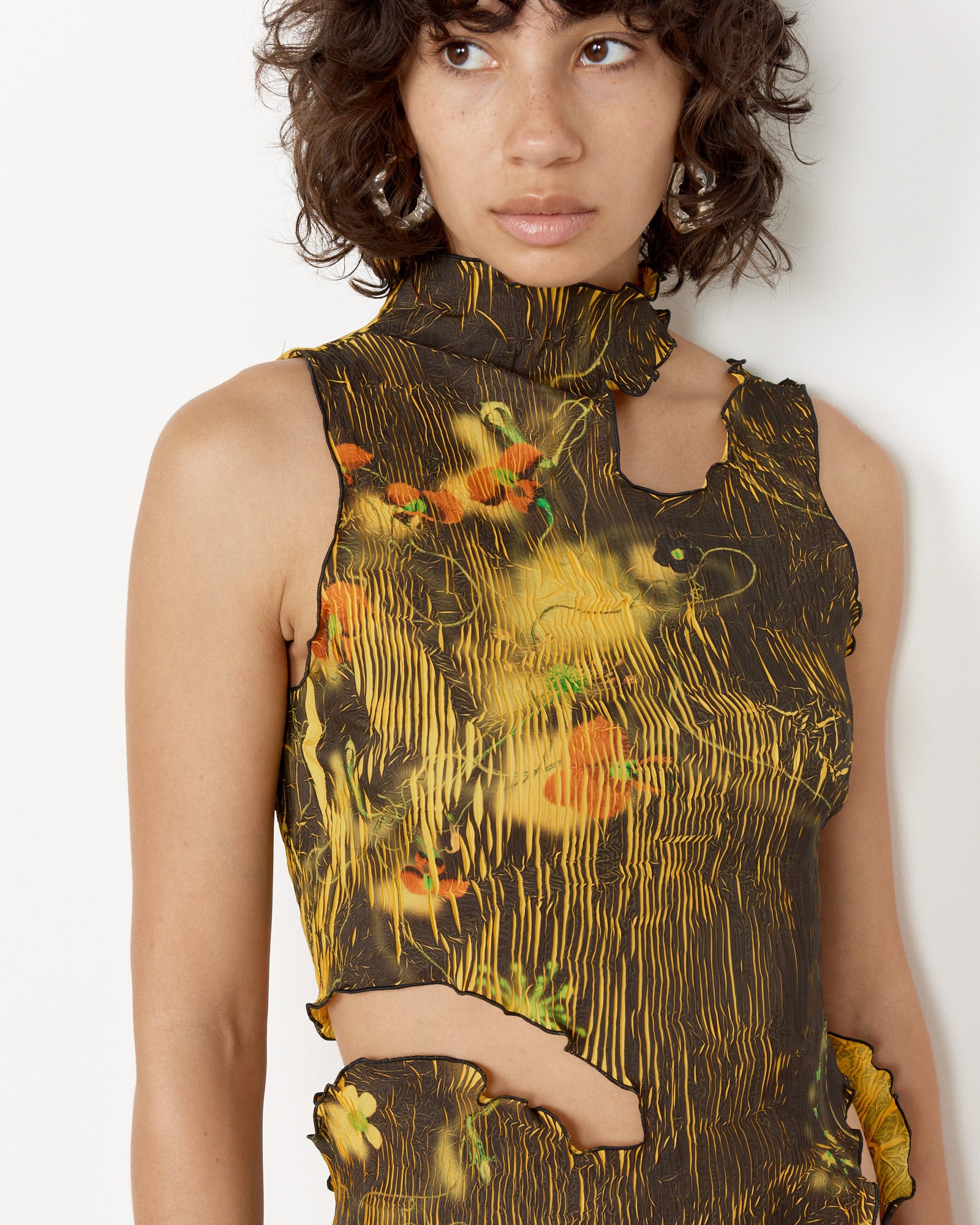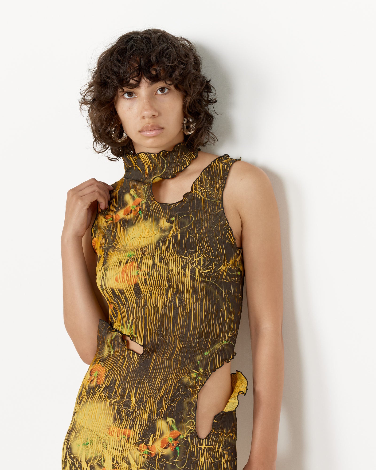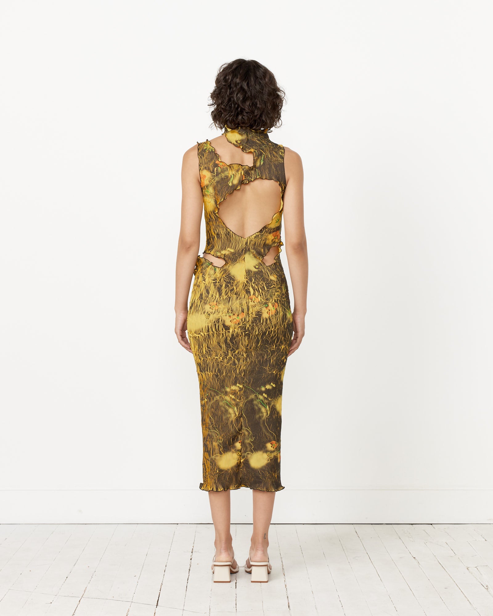 Julia Heuer's captivating Tiago Dress features an exclusive, in-house design printed over a lightweight garment-pleated polyester with cut-out detailing and lettuce-edge trim.