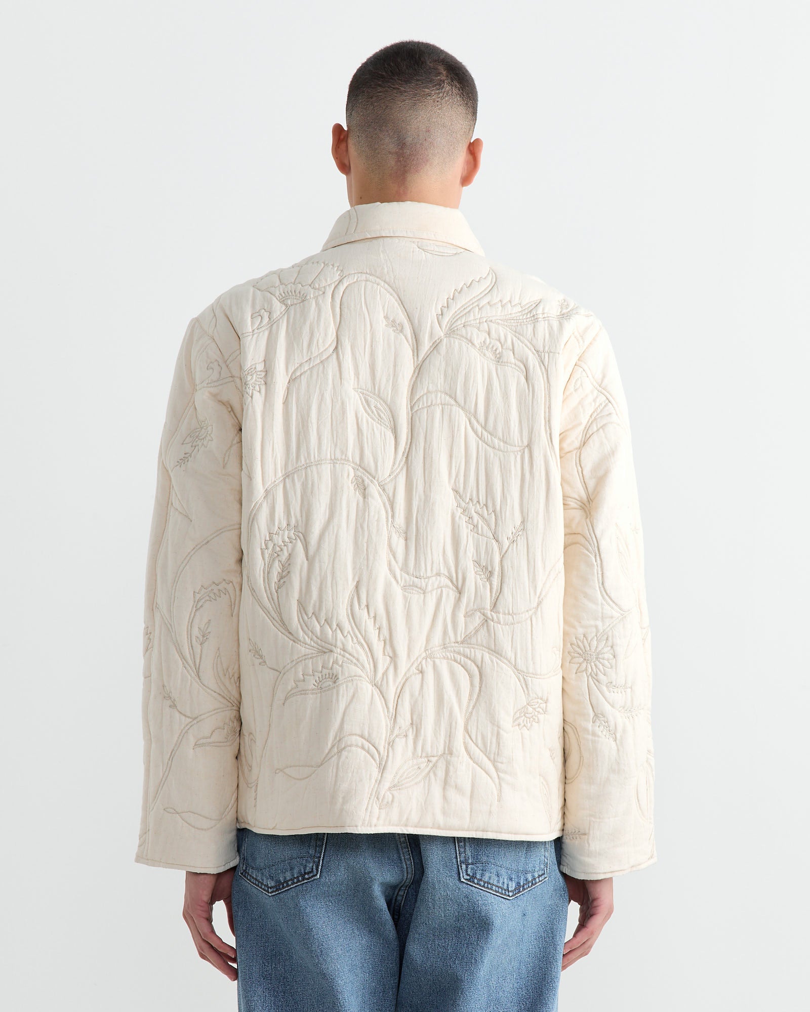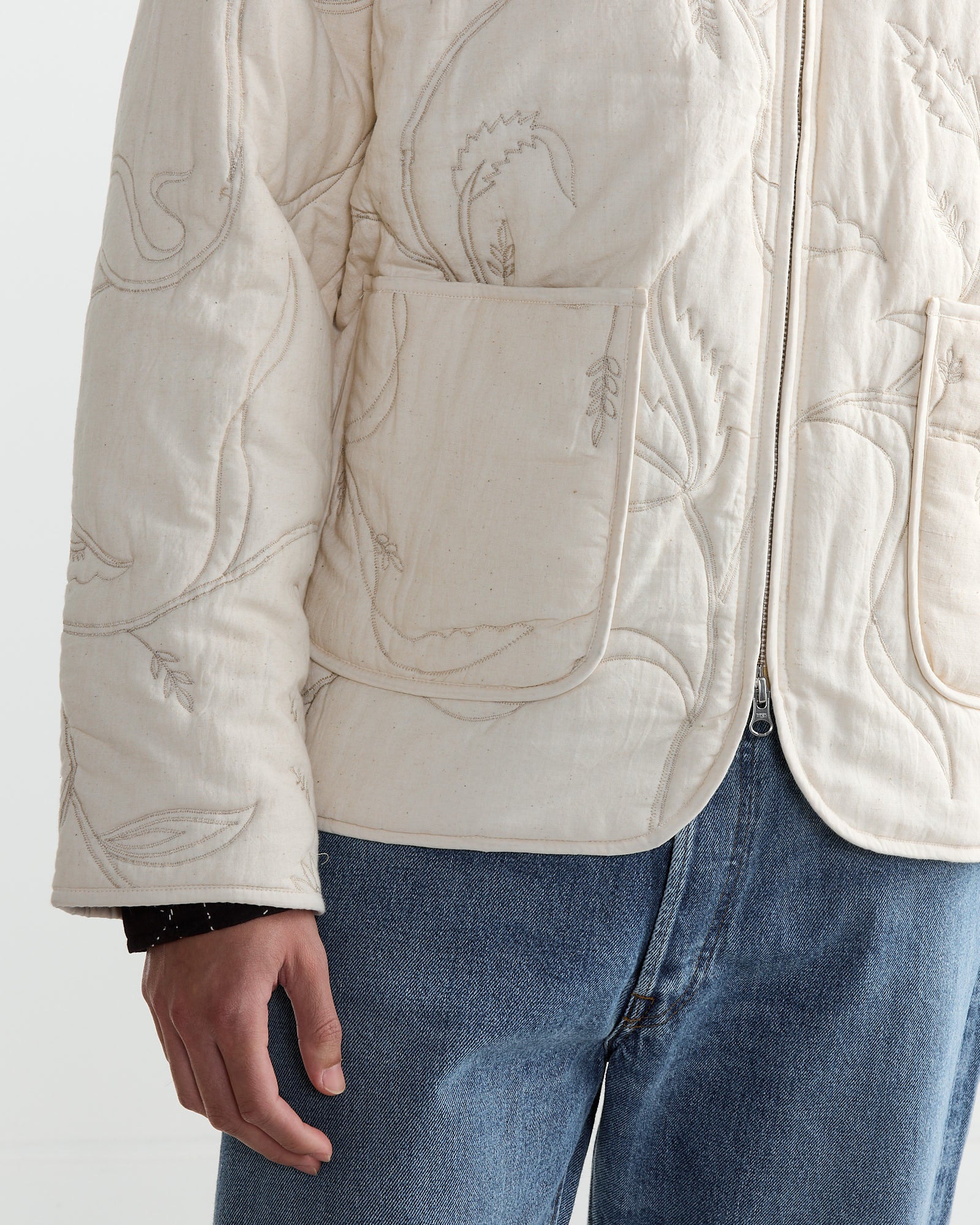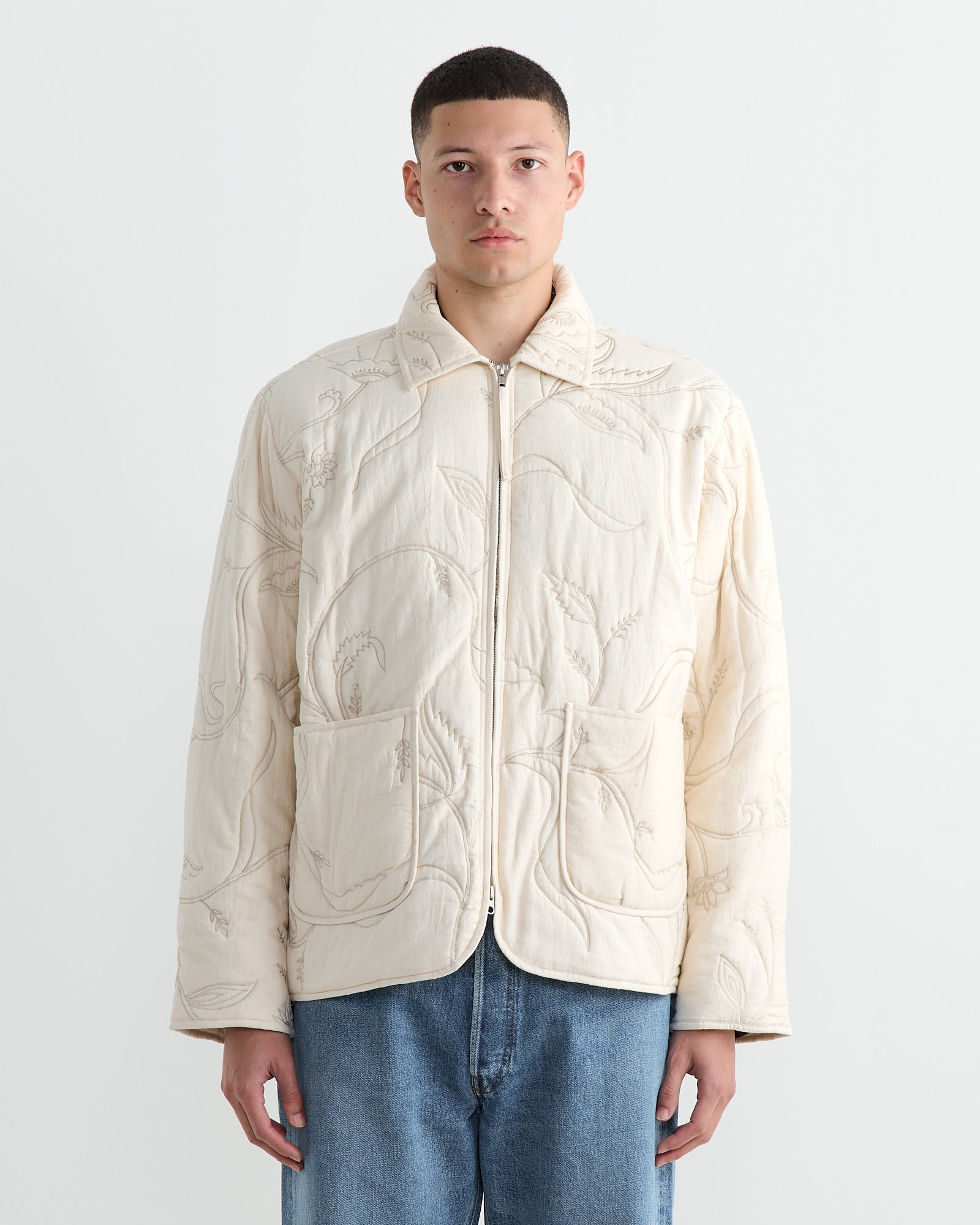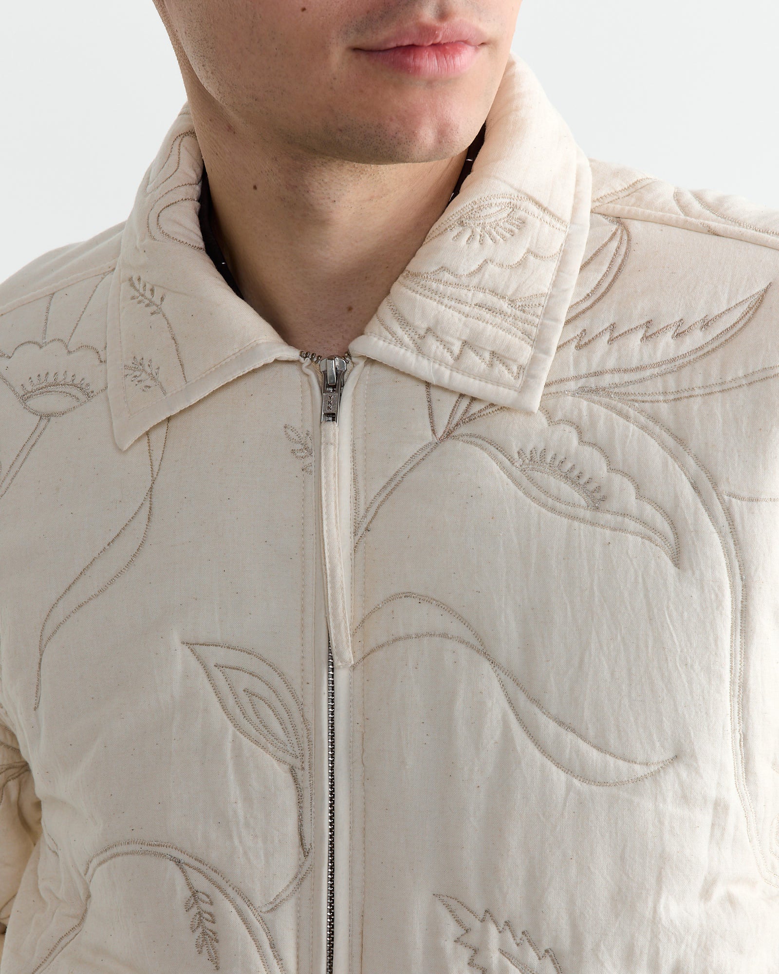 The Kardo Amardeep Jacket in Natural is a relaxed-fit, two-way zip jacket featuring binding details. Crafted from 100% cotton herringbone weave, this medium-weight fabric offers a warm touch and is responsibly dyed.