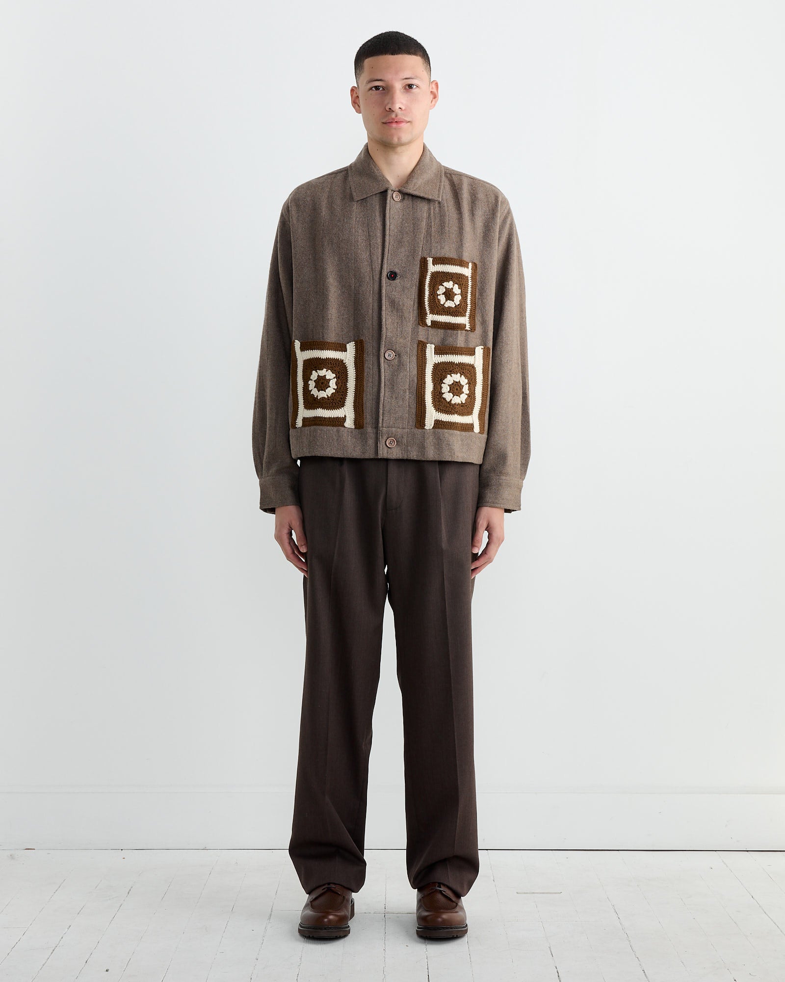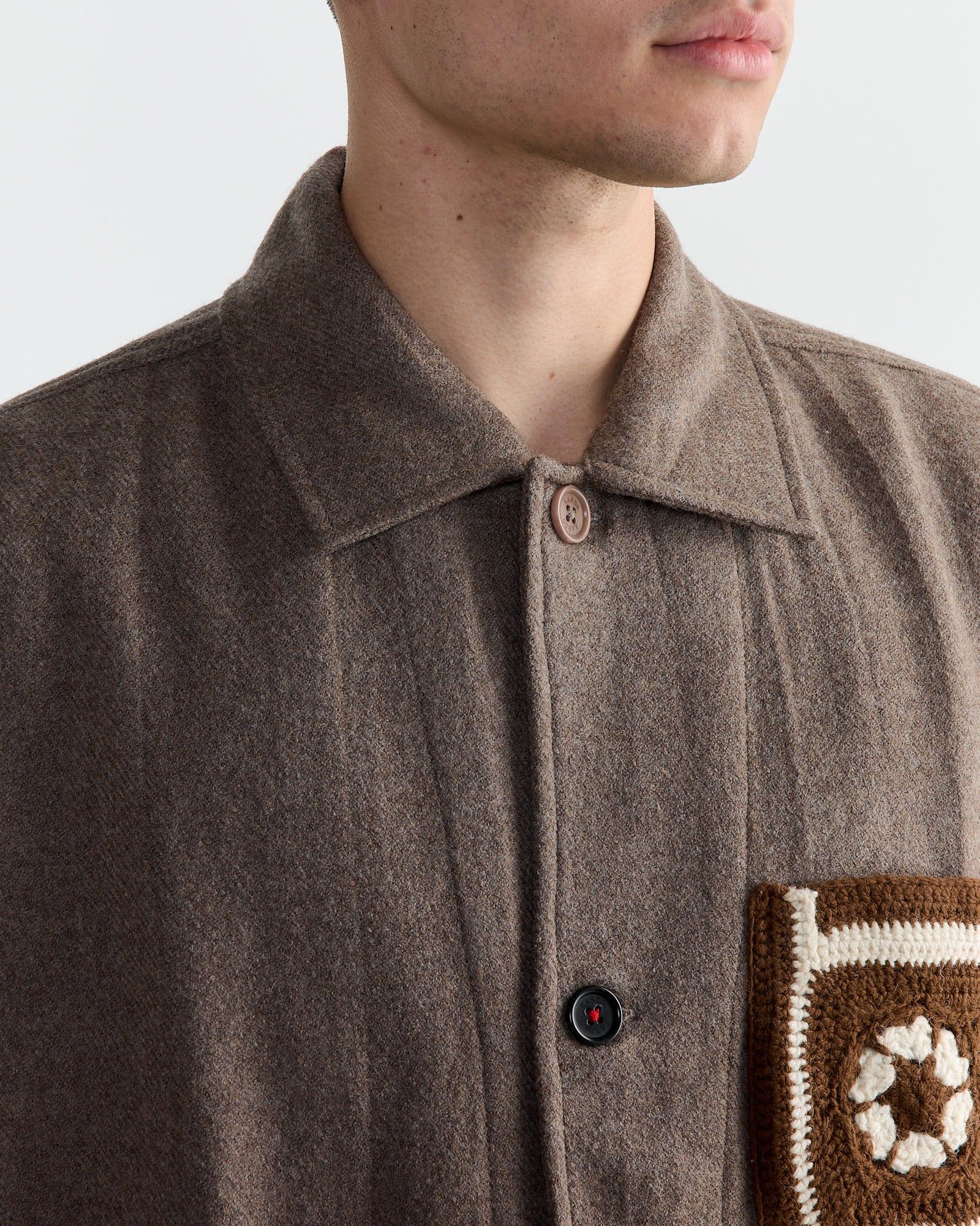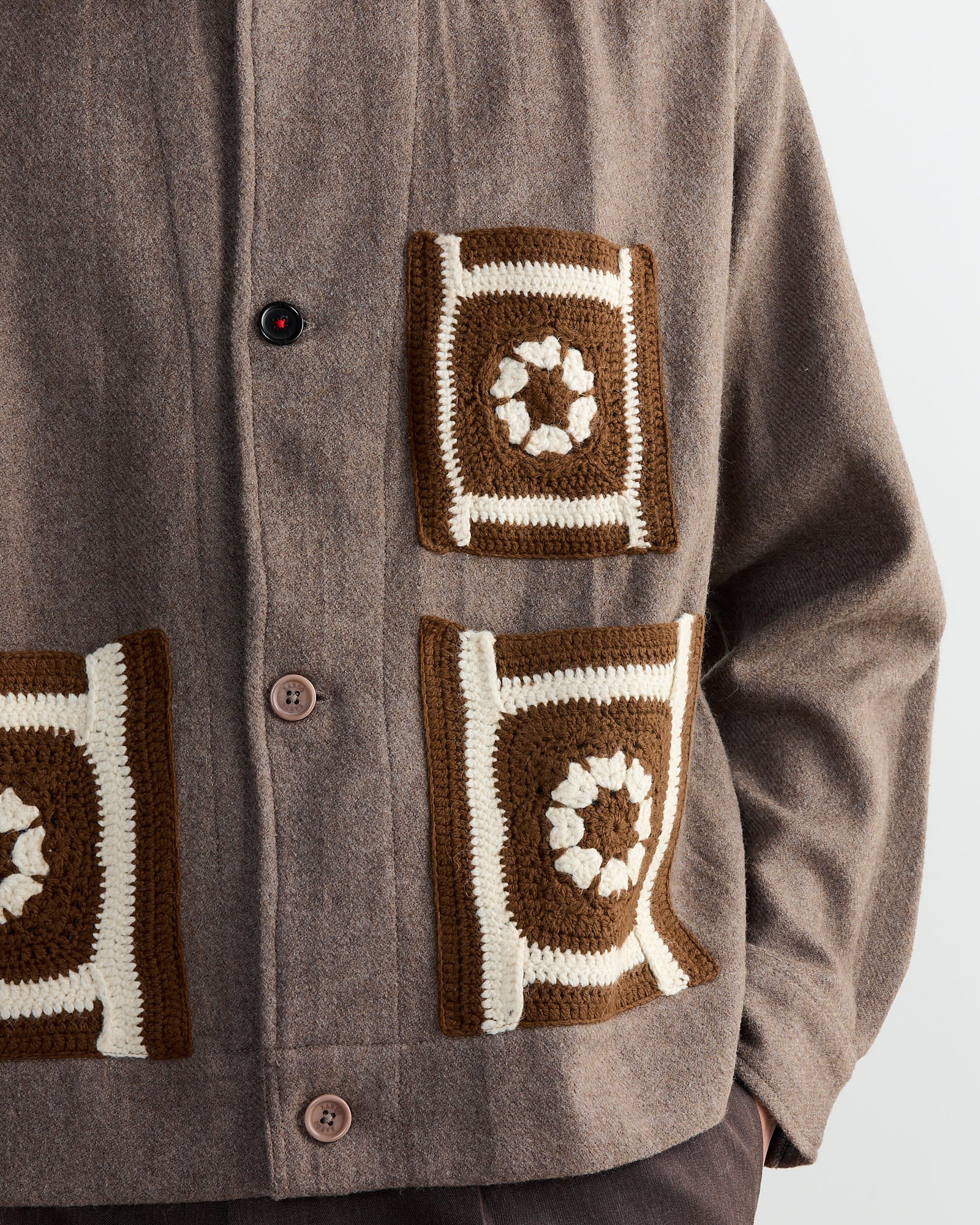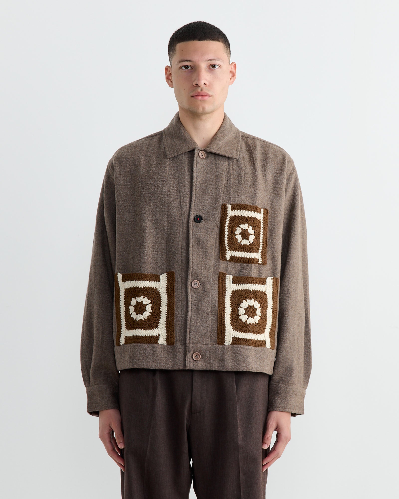 The Kardo Bodhi Jacket in Multi features a classic button-up design with a boxy silhouette and a spread collar. Handwoven in India, this jacket is crafted from upcycled cotton scraps, showcasing a patchwork technique that highlights Kardo's focus on sustainable craftsmanship.