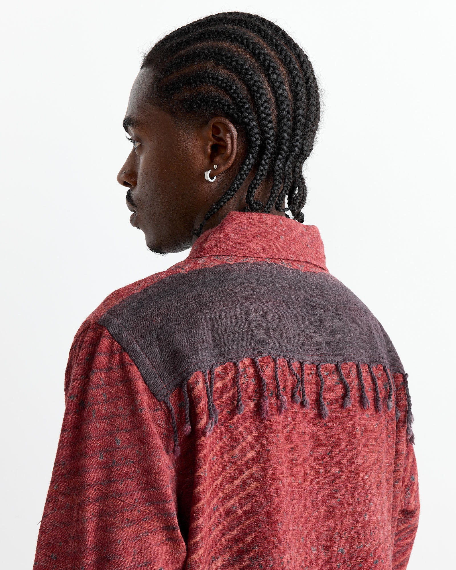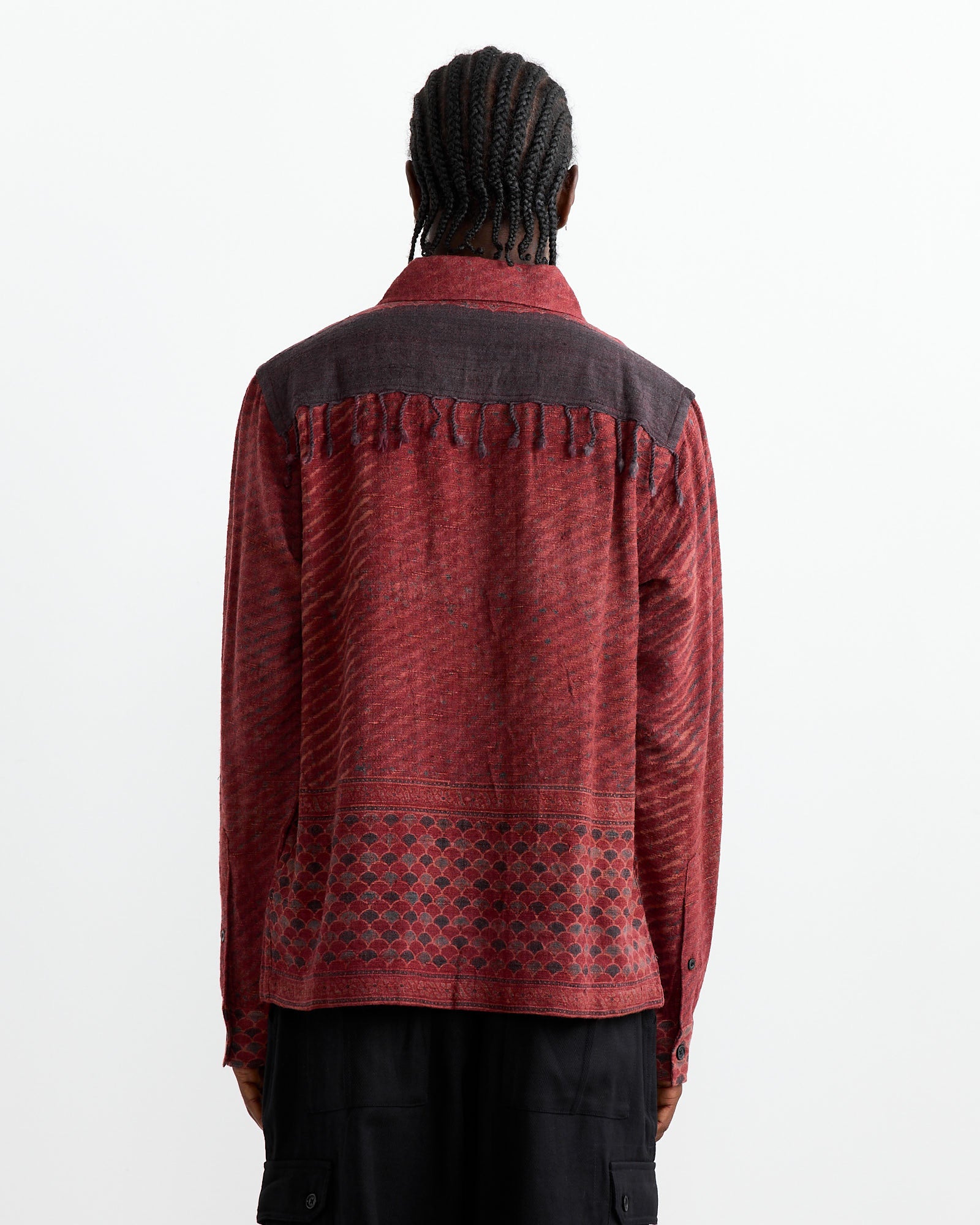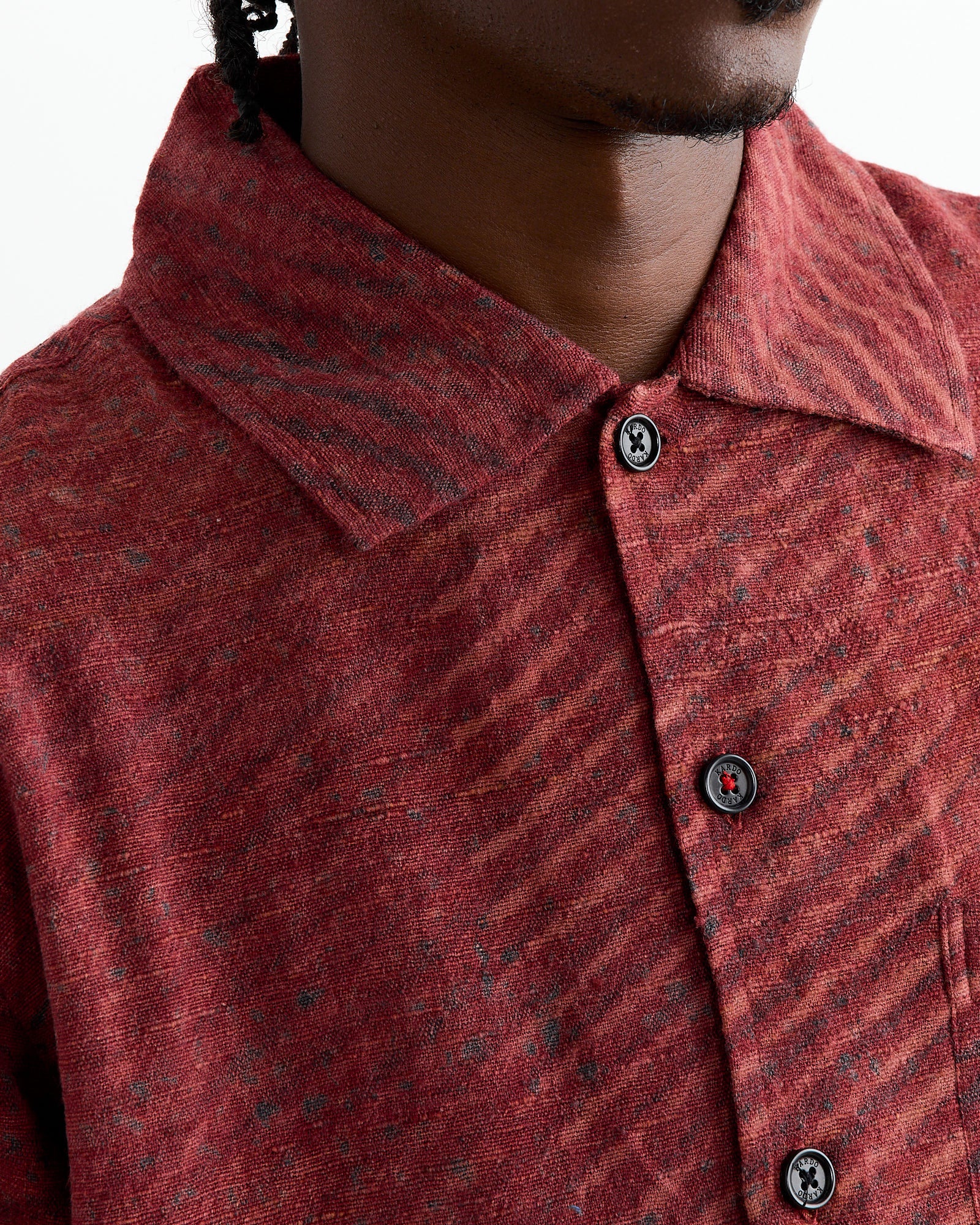 The Kardo Gianni Shirt in Red showcases a blend of traditional Indian techniques. Made from 50% silk and 50% wool, the fabric is handwoven in Bhagalpur, Bihar, and block printed with natural dyes in Ajrakhpur, Gujarat. It features a relaxed fit, corozo nut buttons, fringe details, and a convertible collar, all hand-finished by a single tailor.