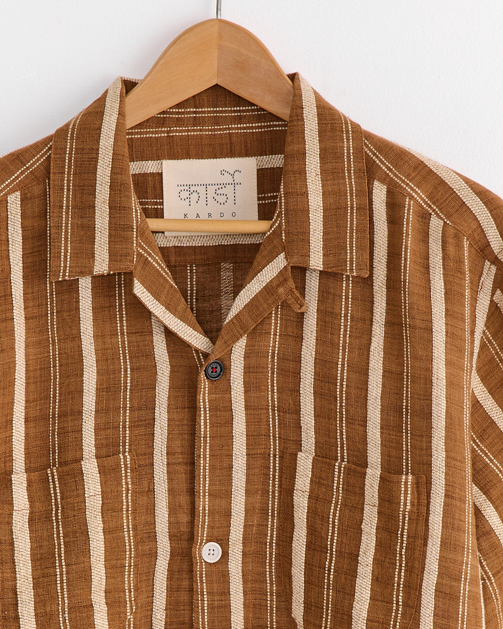 The Kardo Pedro Handwoven Shirt in Nutshell is an oversized camp collar short sleeve shirt featuring four front pockets. It’s made from handloom cotton woven by master artisans, often using naturally dyed yarns. Subtle imperfections in the fabric are part of its handwoven character and highlight the craftsmanship behind each piece.