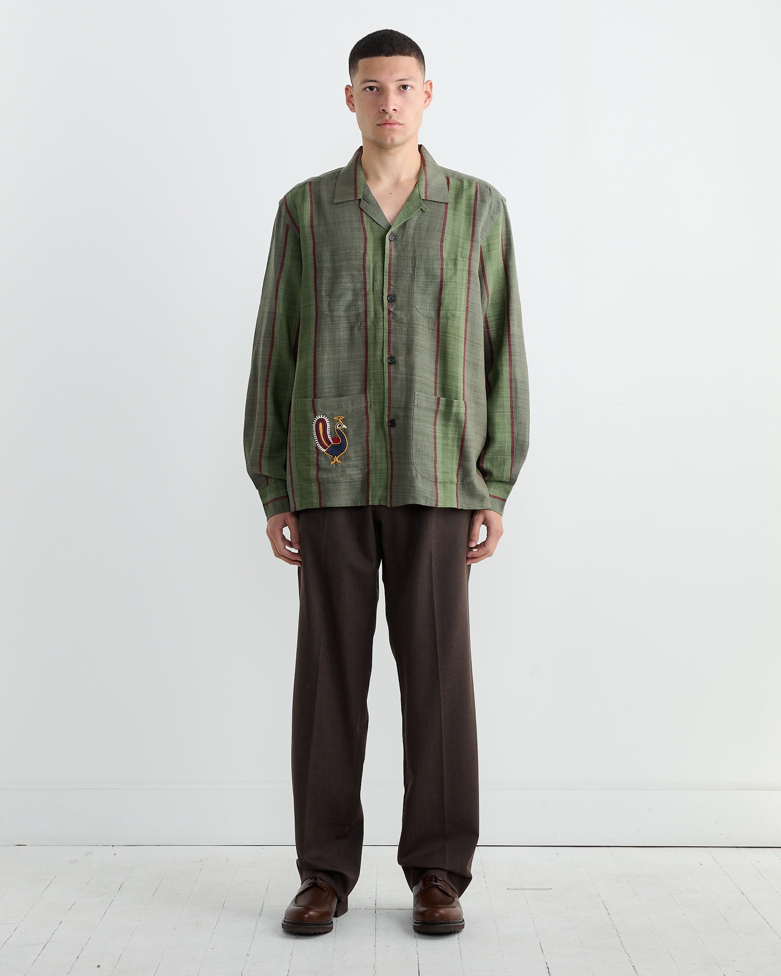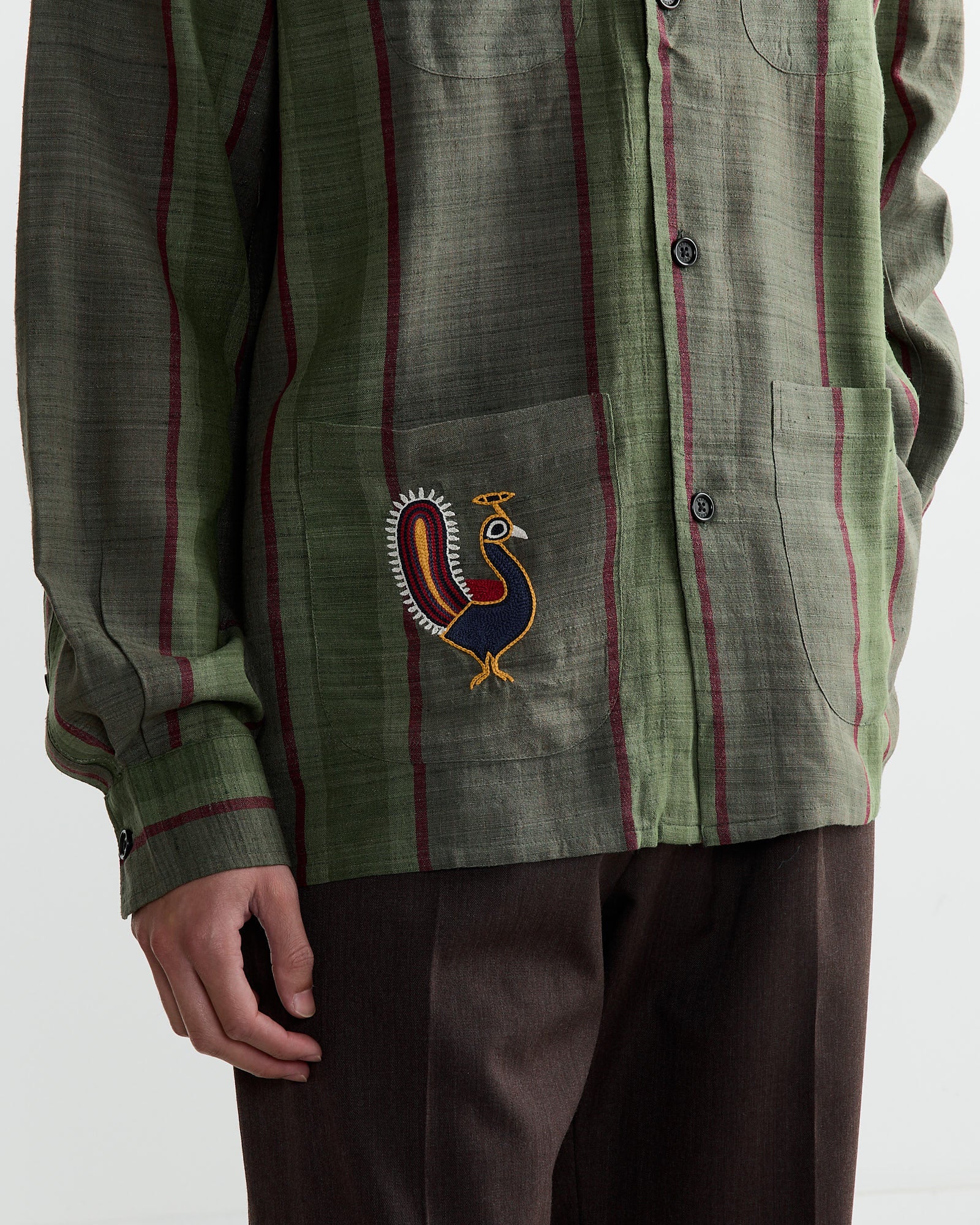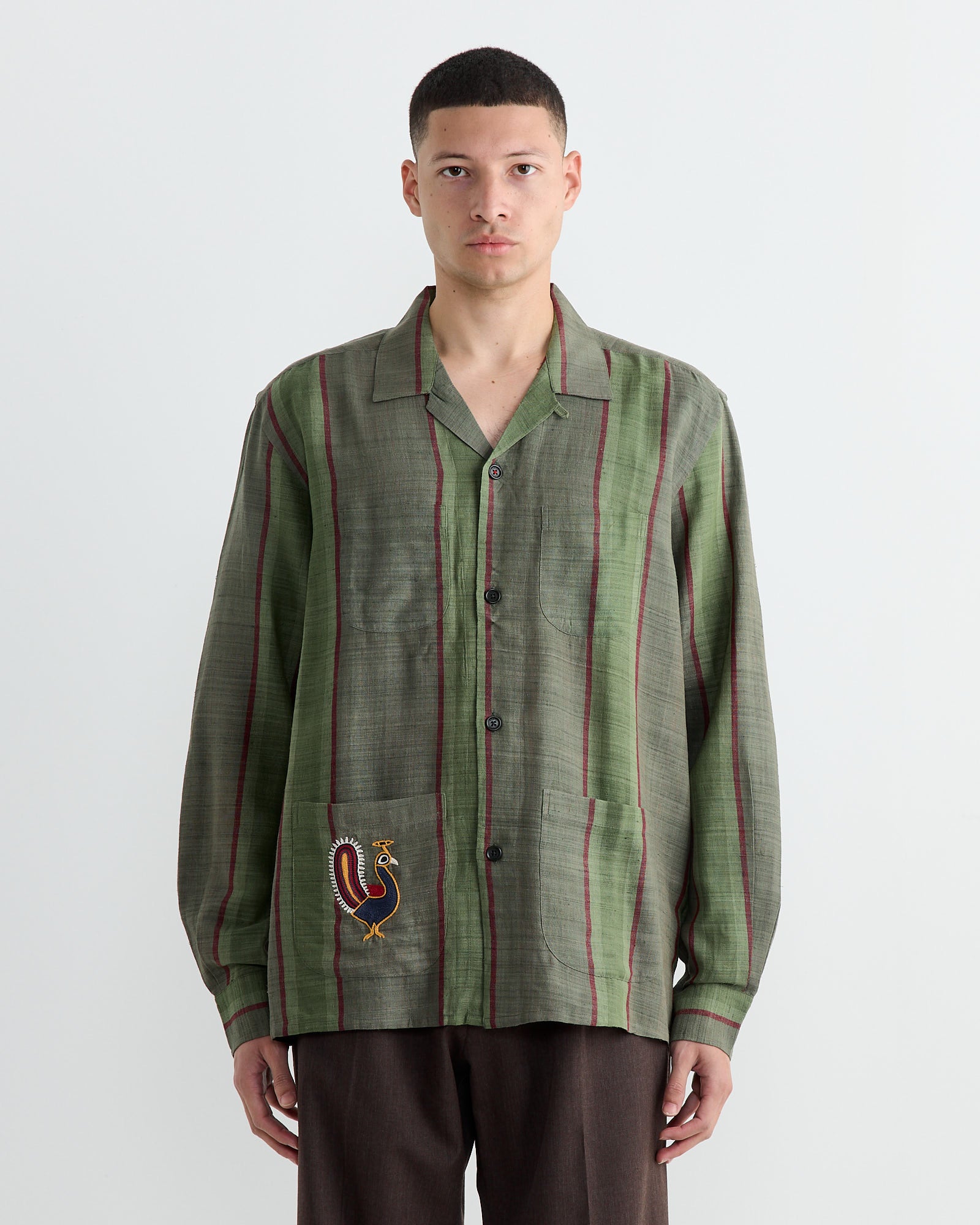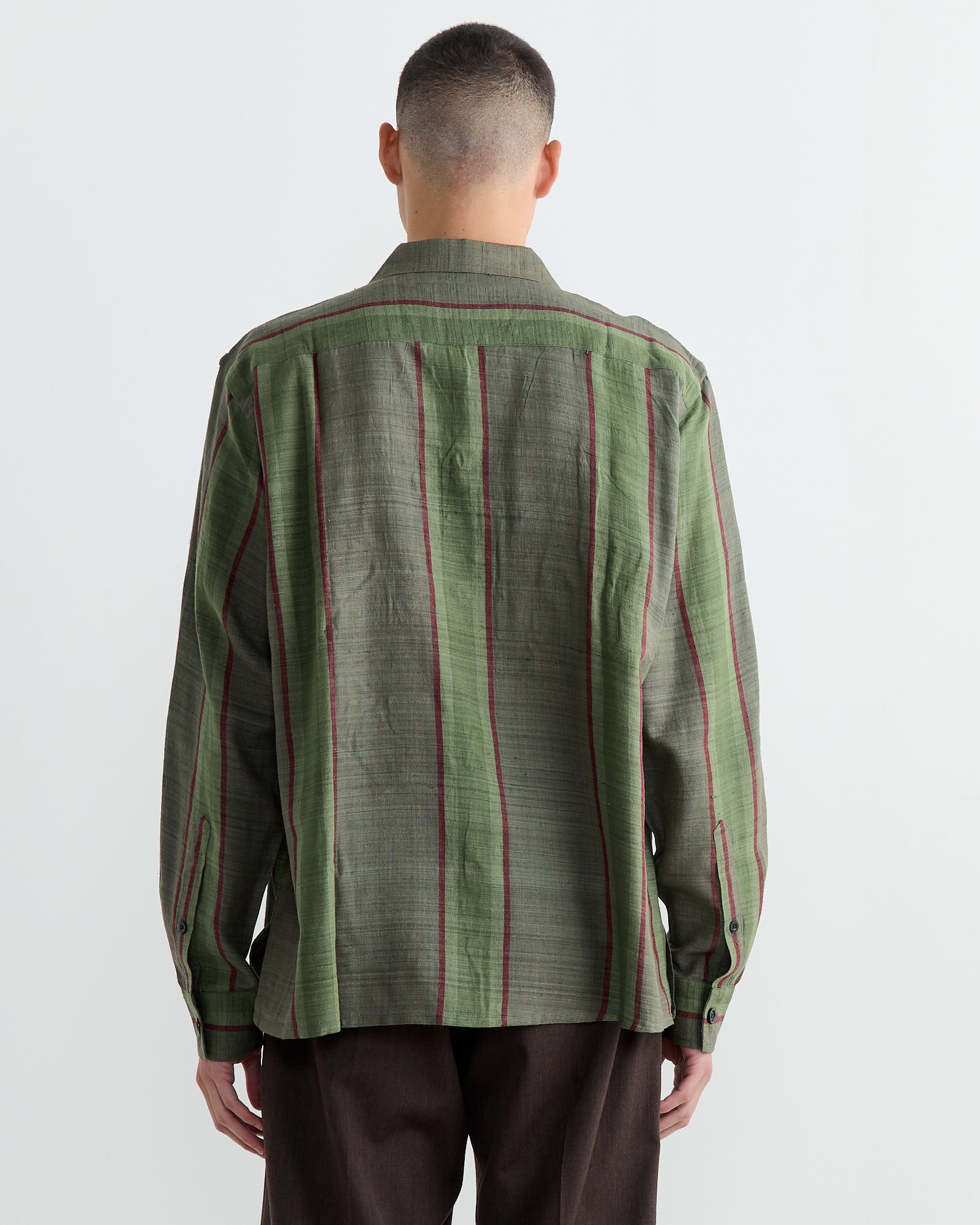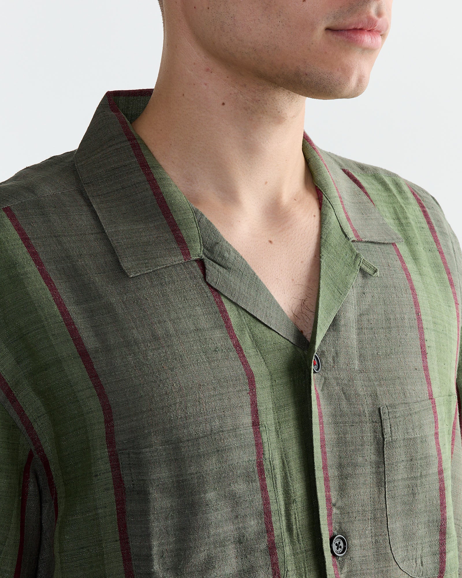 The Kardo Pedro Shirt in Moss Green is an oversized, long-sleeve shirt featuring a camp collar and four patch pockets. Crafted from 100% matka silk, it offers a soft texture between cotton and cashmere. The yarn-dyed stripe patterns are handwoven by a master weaver in Bengal.