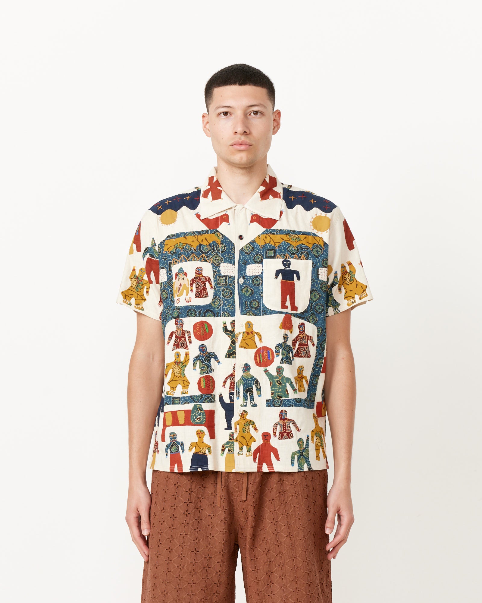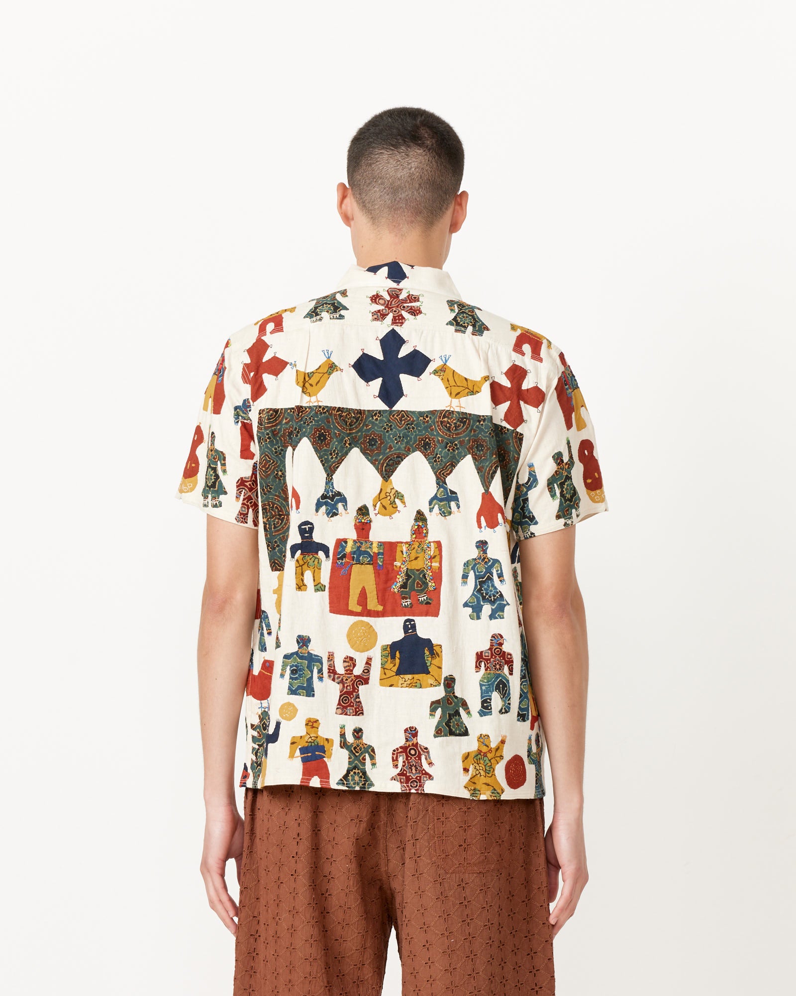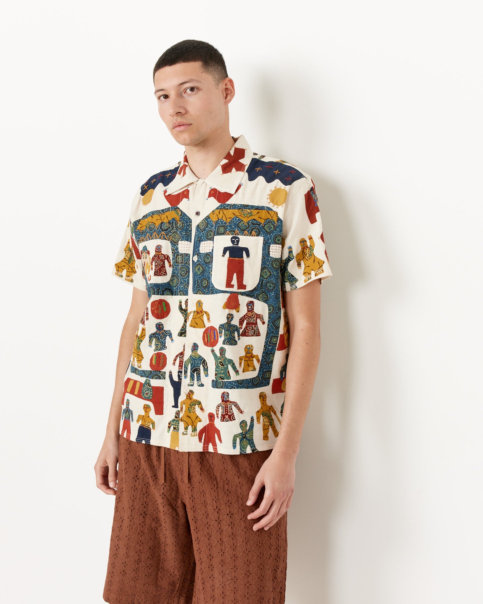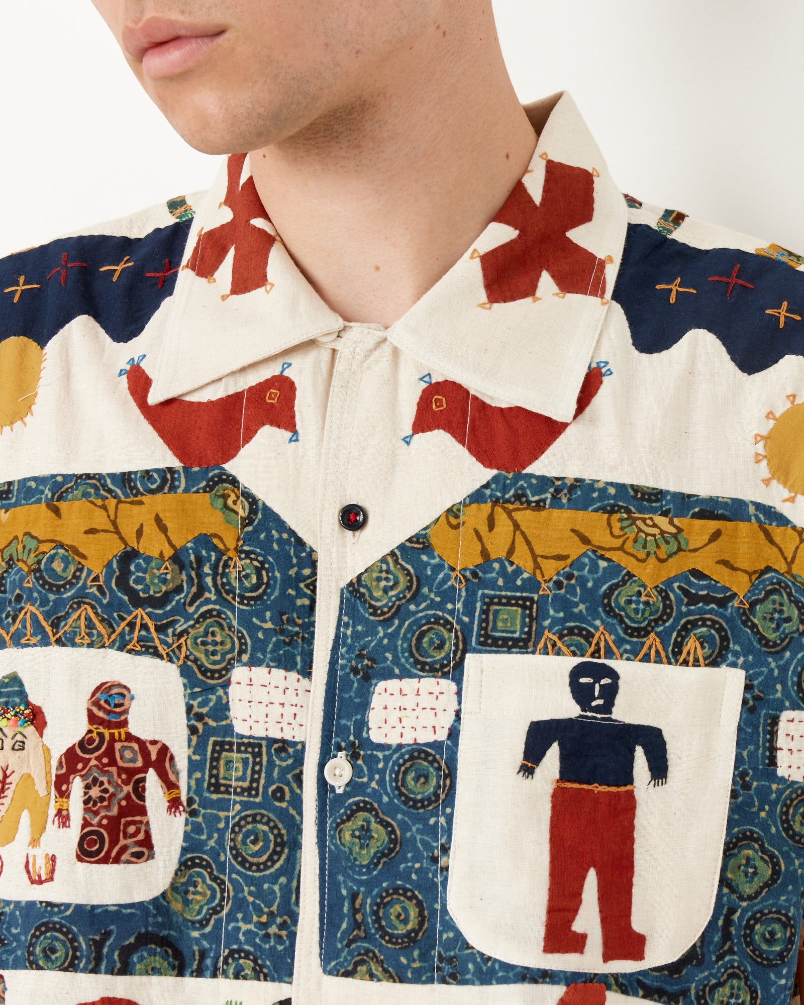 Kardo's boxy-fitting Rabari Chintan Shirt features hand appliqué and hand embroidery work from members of the Rabari community. Originally nomadic travelers, some of the community have settled in Kutch, Gujarat where the women of the community work with Kala Raksha, a grassroots social enterprise that is dedicated to preserving traditional arts.