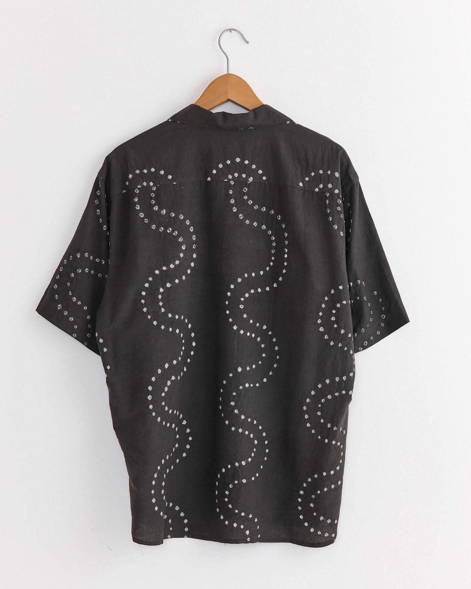 The Kardo Ronen Shirt in Bandhani Charcoal is an oversized short sleeve camp collar shirt featuring a hand-dyed Bandhani pattern. This centuries-old resist dye technique involves intricately tying sections of fabric before dyeing, creating unique patterns with natural dyes. The process is slow and highly skilled, resulting in one-of-a-kind variations in each piece.