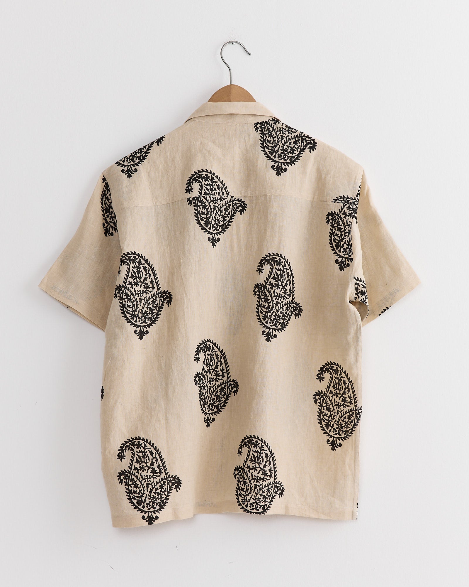 The Hand Block Camp Shirt from Kartik Research is crafted using traditional Indian hand block printing techniques, featuring a paisley motif in the Harda/Black colorway. Designed with a relaxed fit, it has a camp collar and short sleeves for an effortless look.