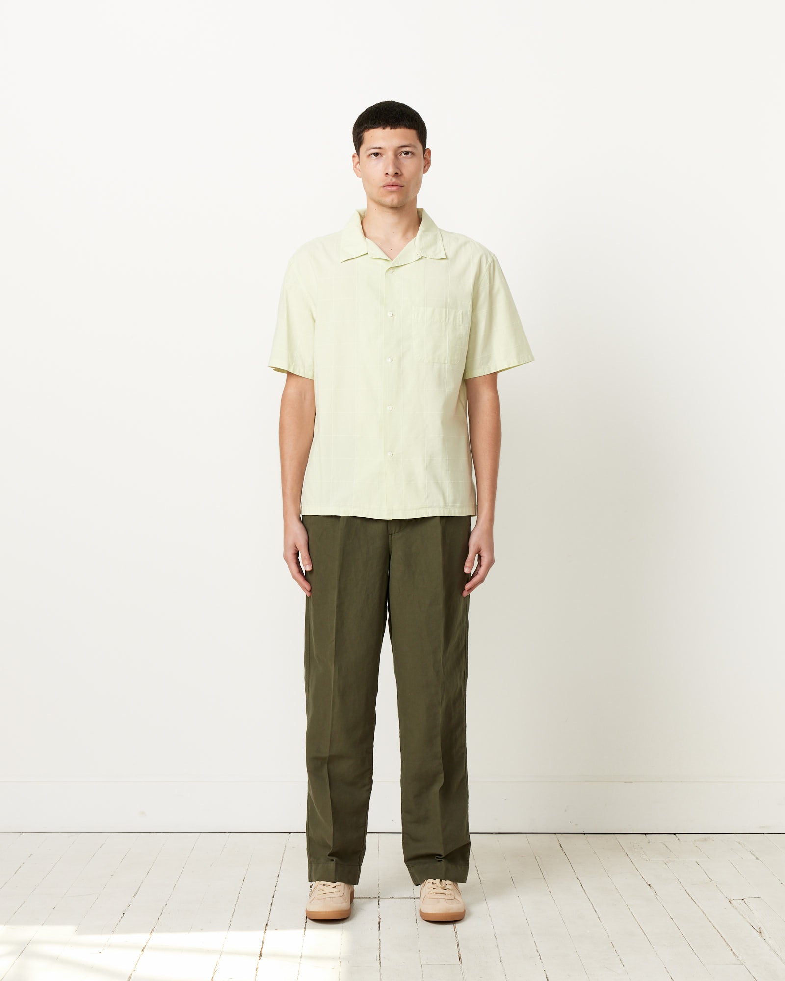 Knickerbocker's Director Shirt pairs classic camp shirt details and silhouette with a breathable, lightweight cotton fabric woven with a subtle pattern.