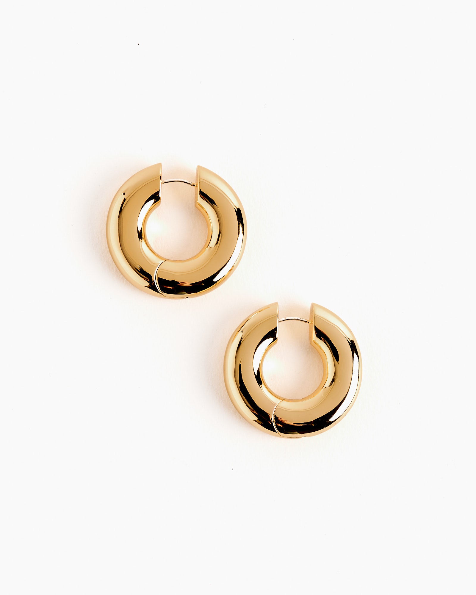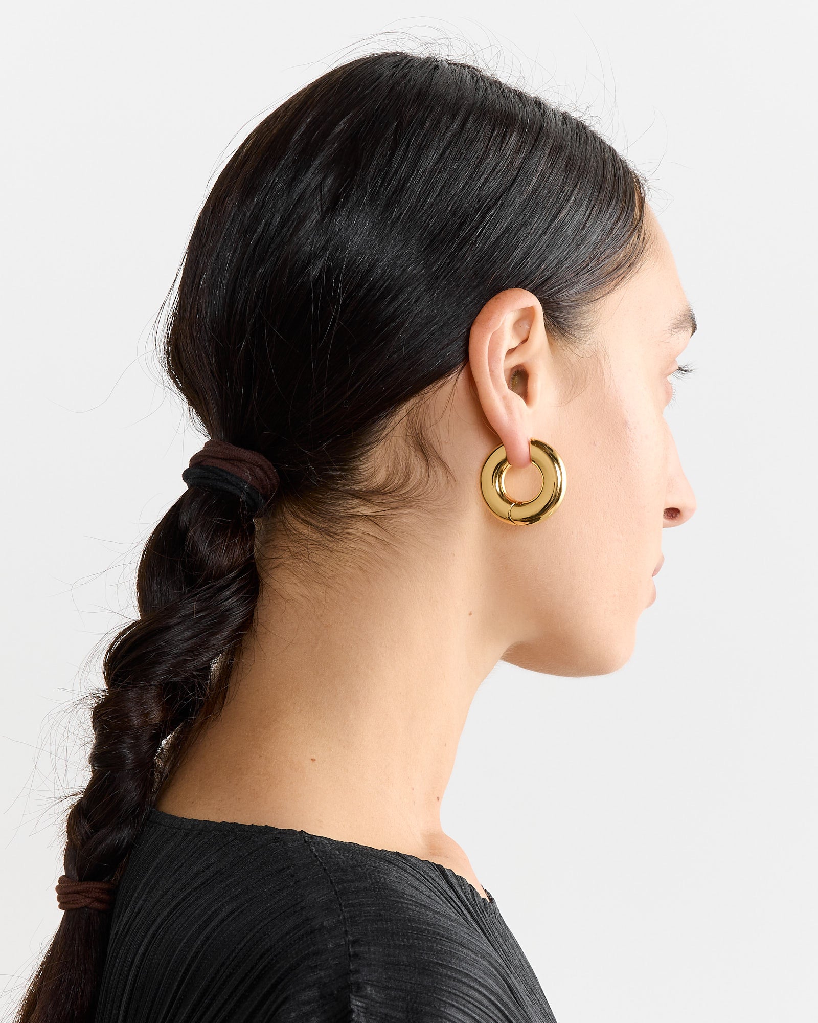 The Laura Lombardi Large Terra Hoops are a bold accessory that adds a touch of elegance to any ensemble. Crafted from 14k gold-plated brass, these hollow hoop earrings feature a hinge closure mechanism for easy wear.