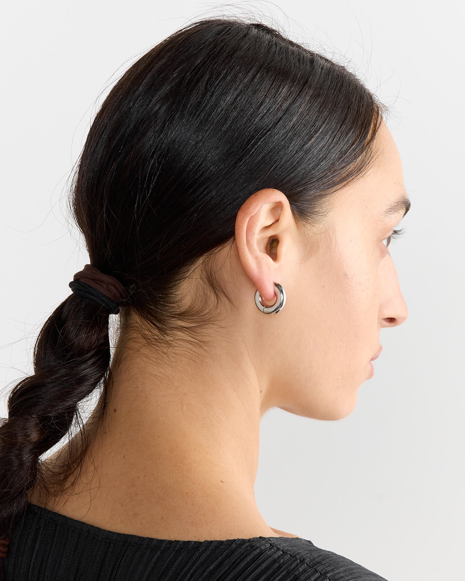 The Laura Lombardi Medium Terra Hoops in rhodium-plated brass are a refined accessory that adds a touch of elegance to any ensemble. These solid round hoop earrings feature a hinge closure mechanism for secure and comfortable wear.