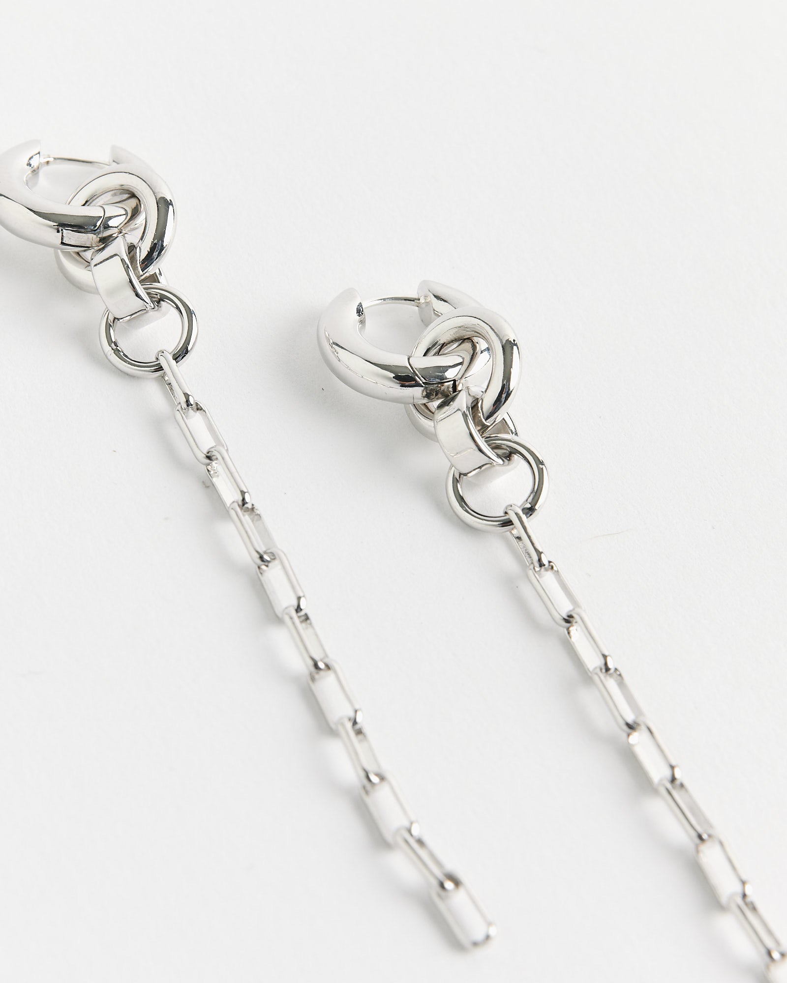 Laura Lombardi Silver Pezza Earrings in Rhodium Plated Brass feature interlocking circular components with a thin rectangular chain drop. The hoop earring has a click closure, and the drop is removable for versatile styling.
