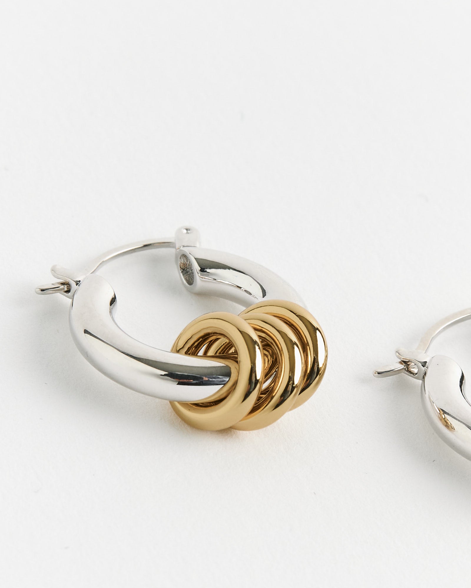 Laura Lombardi Two Tone Fillia Earrings in Rhodium Plated Brass feature small, hollow hoops with petite circular charms. The charms are removable for versatile styling.