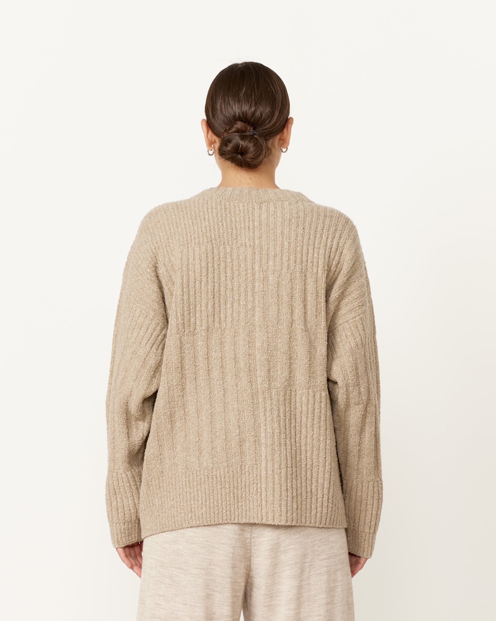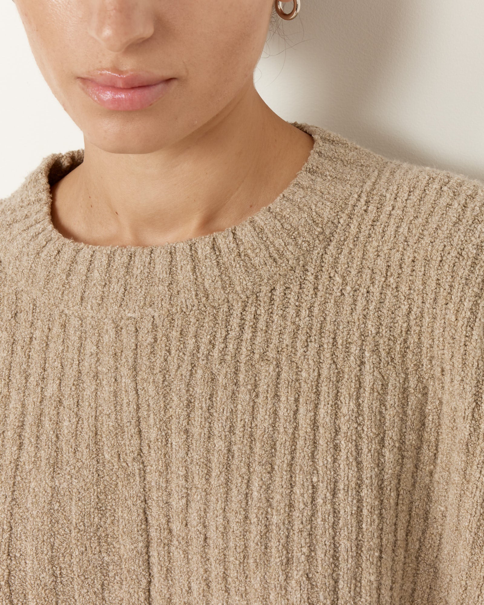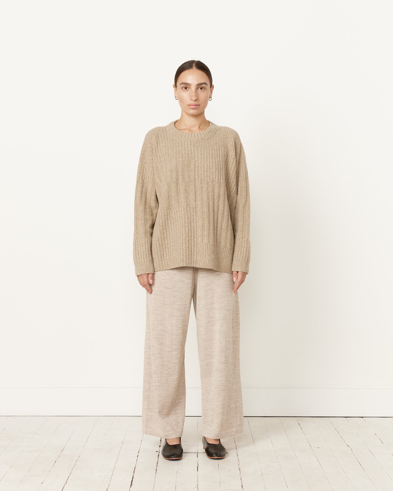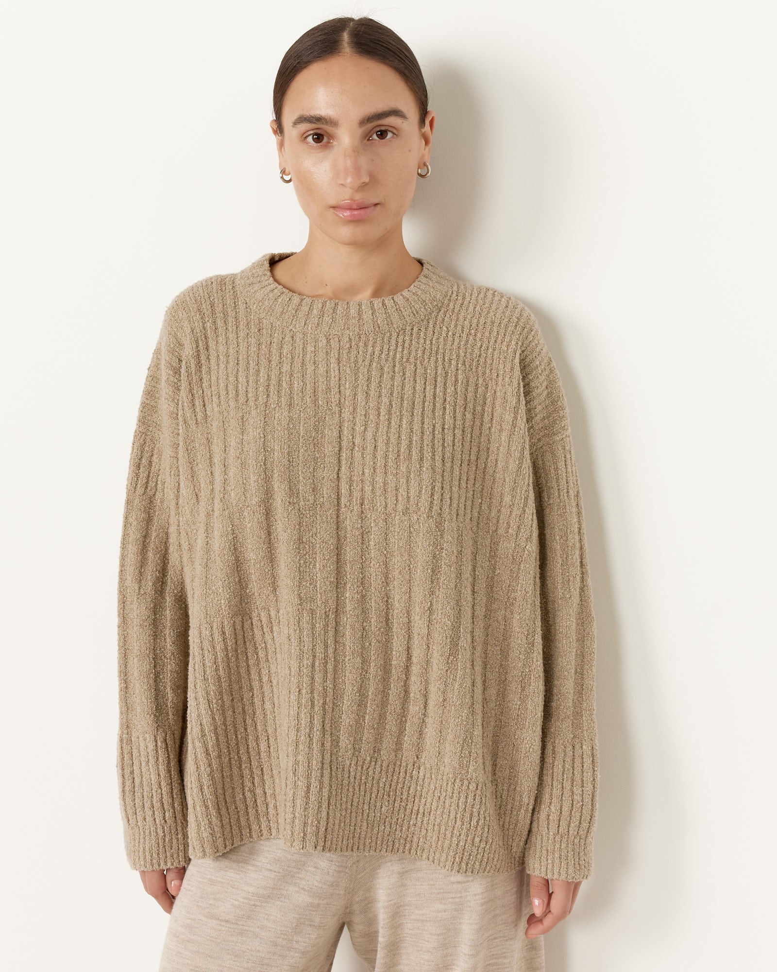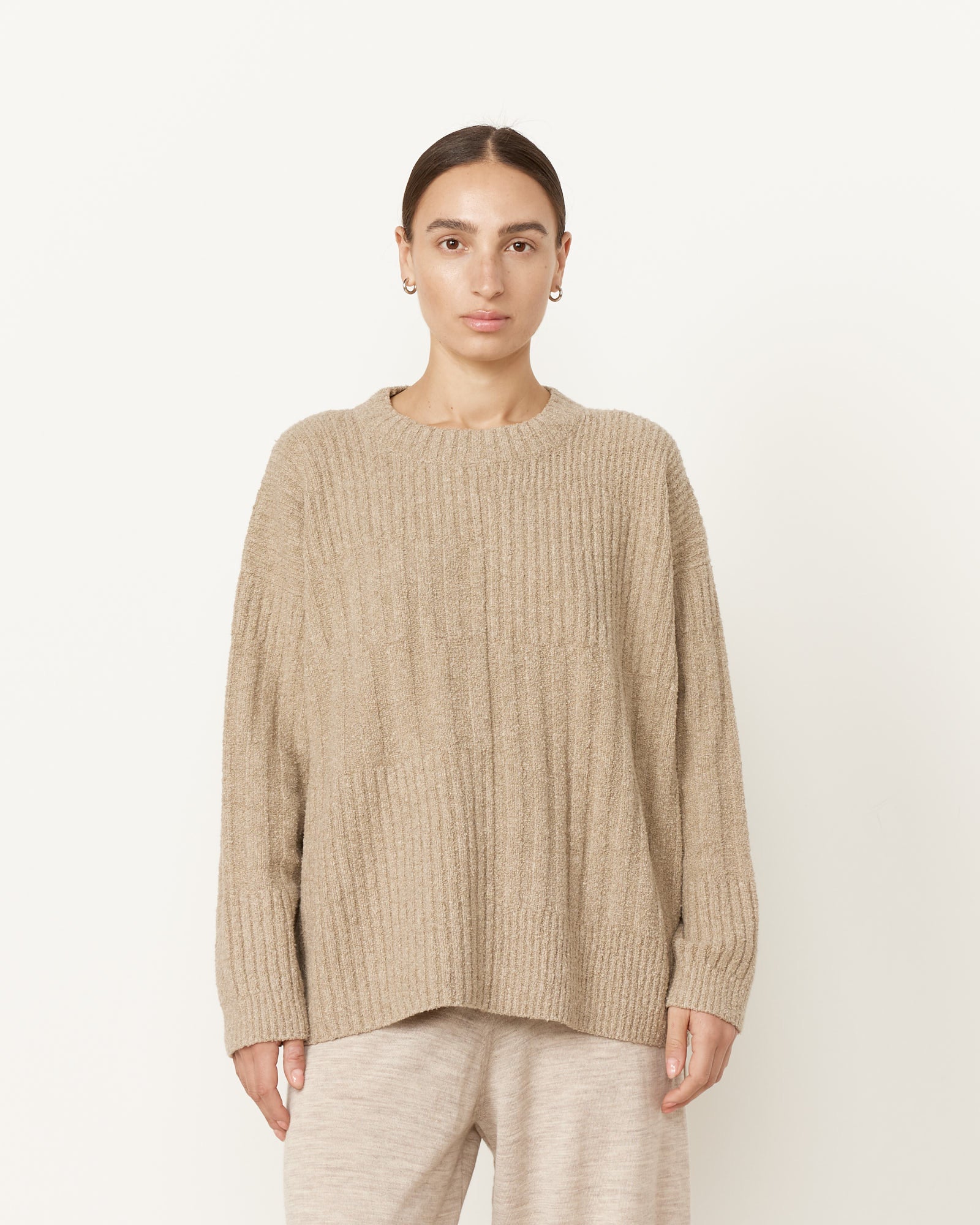 Lauren Manoogian's Collage Pullover features a soft, hand-loomed micro boucle fabric with a mixed rib stitch, dropped shoulders, and a relaxed boxy silhouette.