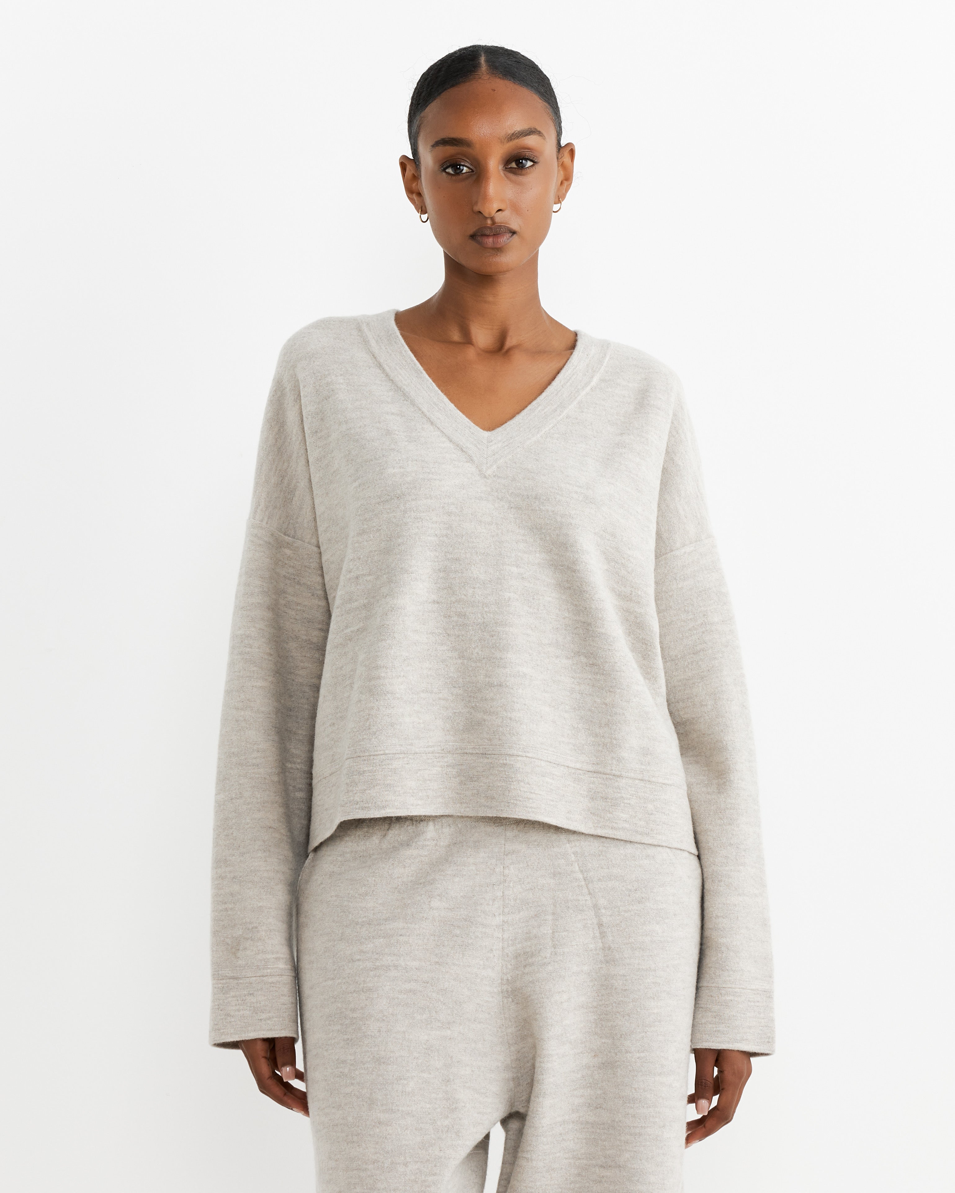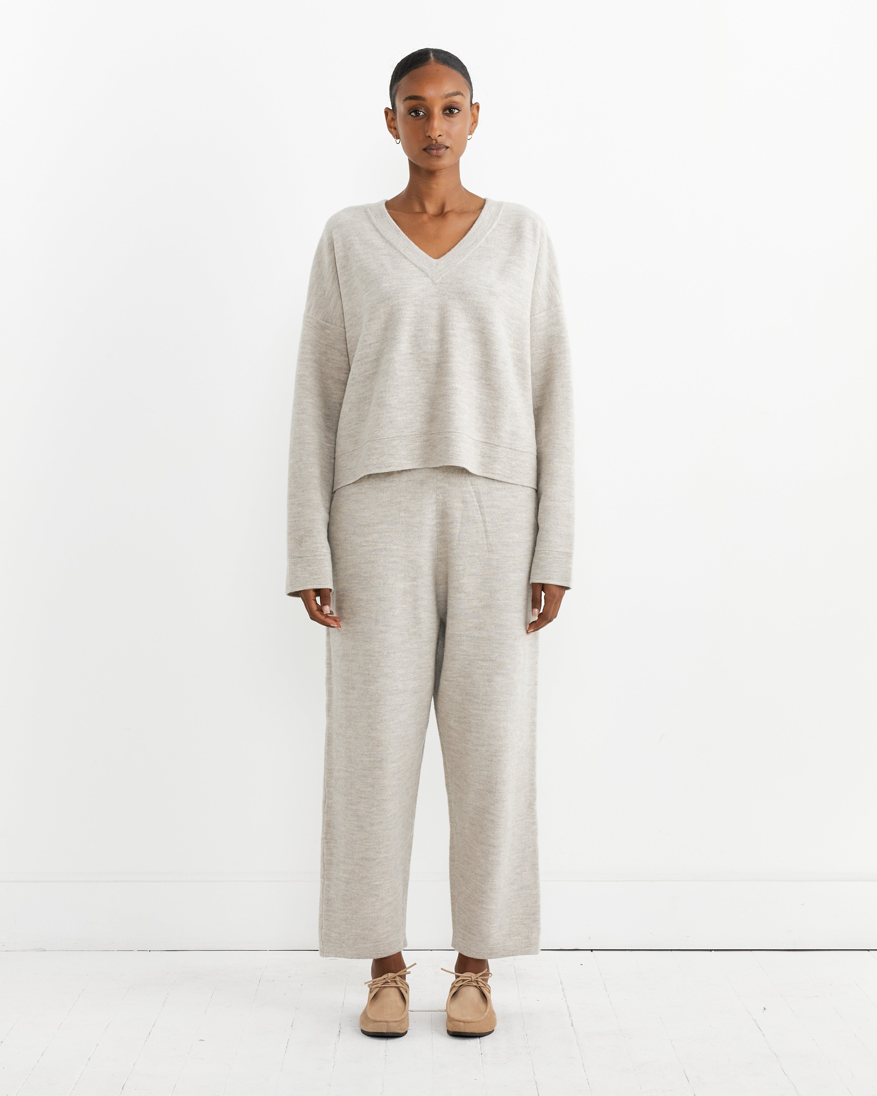 Lauren Manoogian's hand-loomed Wide V-Neck is made from a blend of merino, baby Alpaca, and lycra with a dry, fuzzy character and subtle stretch, and features a boxy silhouette with ribbed trim at the cuffs and hem.