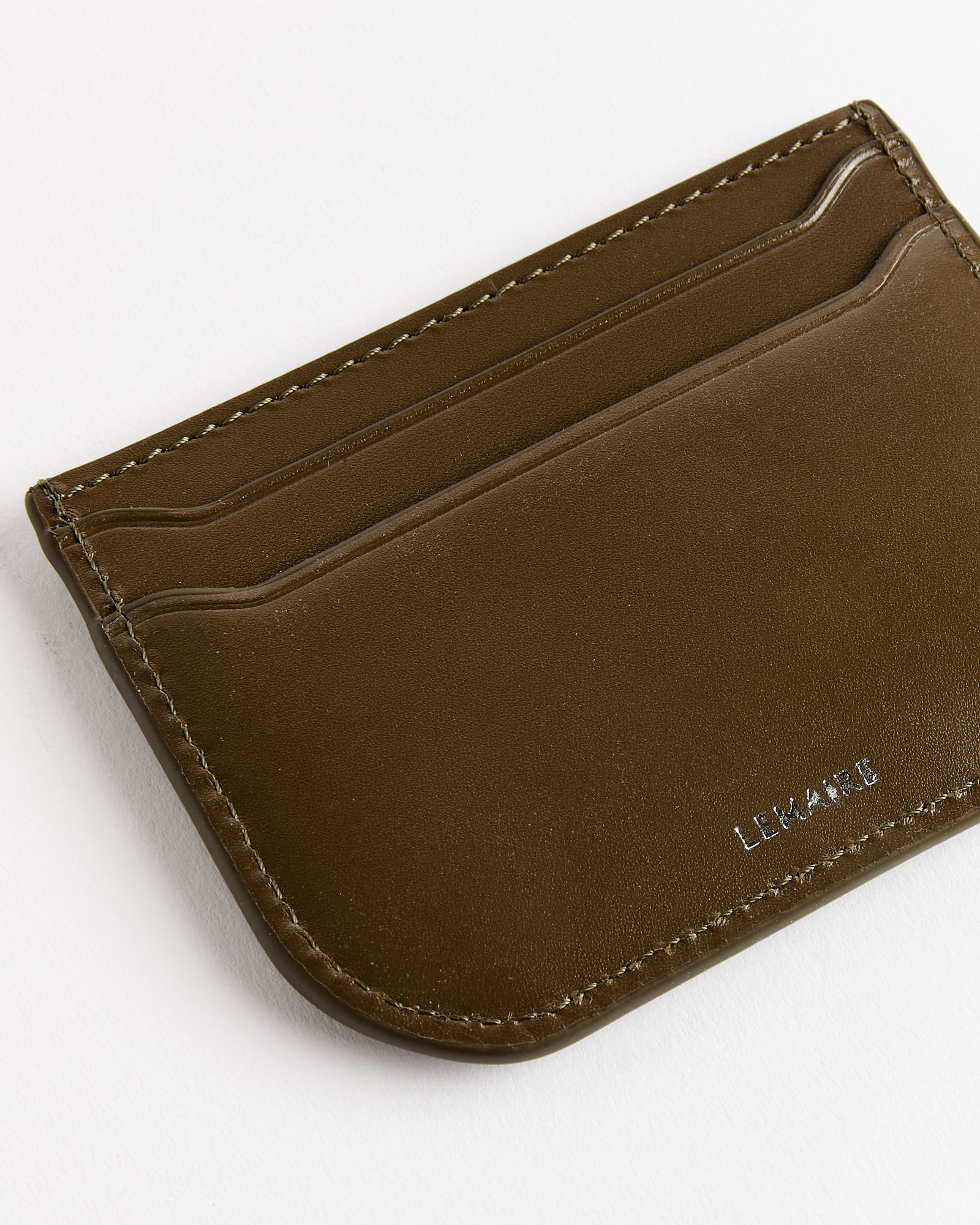 The Lemaire Calepin Card Holder in khaki moss is a minimalist accessory crafted from box calfskin leather, known for its smooth texture and durability. It features two card slots and a central compartment, providing ample space for essential cards and folded bills.