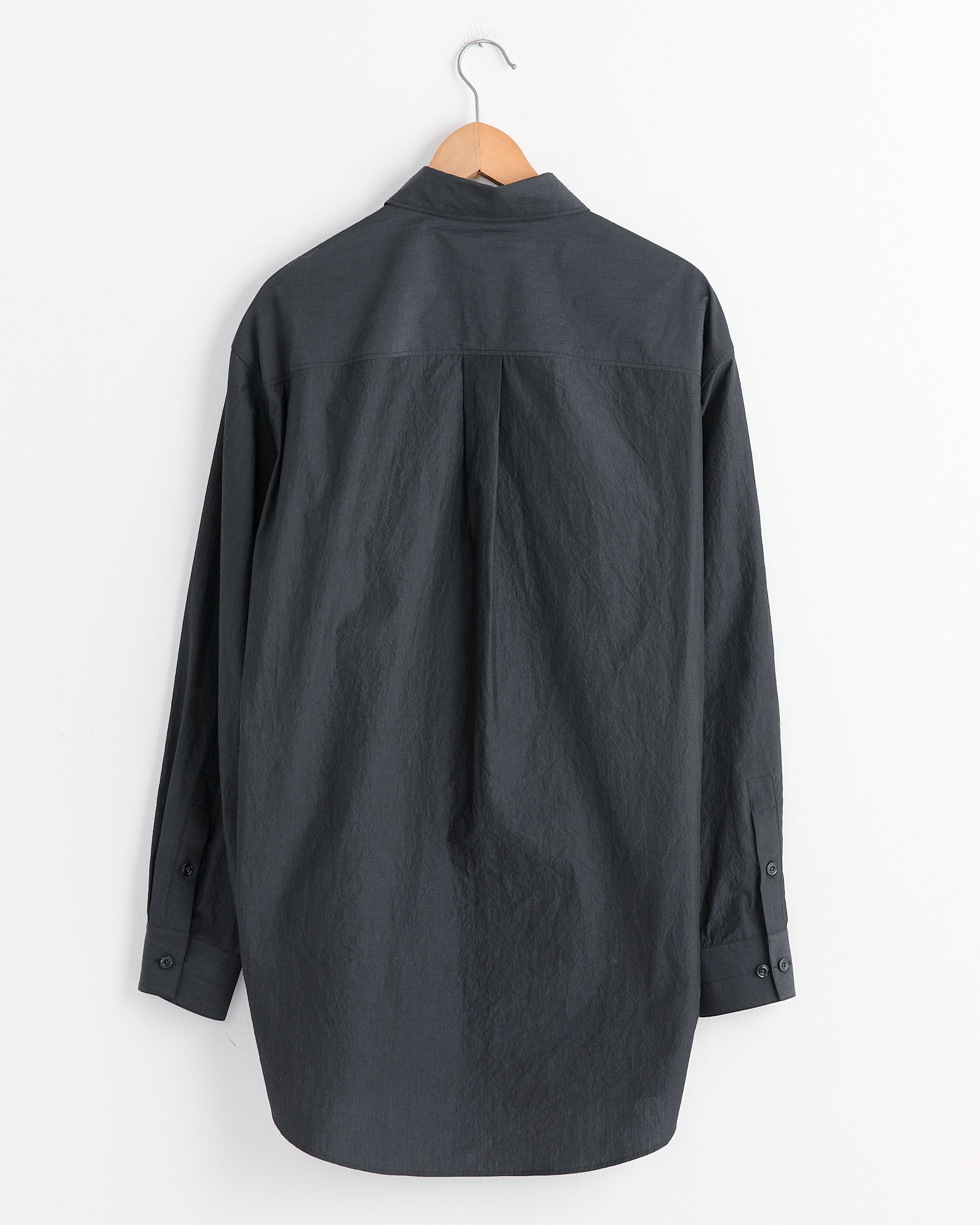 The Double Pocket Shirt has a relaxed fit and is crafted from a lightweight crinkled cotton-silk poplin blend for a textured yet breathable feel. It features a spread collar, a button closure, and a layered patch pocket for added detail. A shirttail hem, pleated barrel cuffs, and a box pleat at the back yoke enhance its structured yet fluid silhouette.