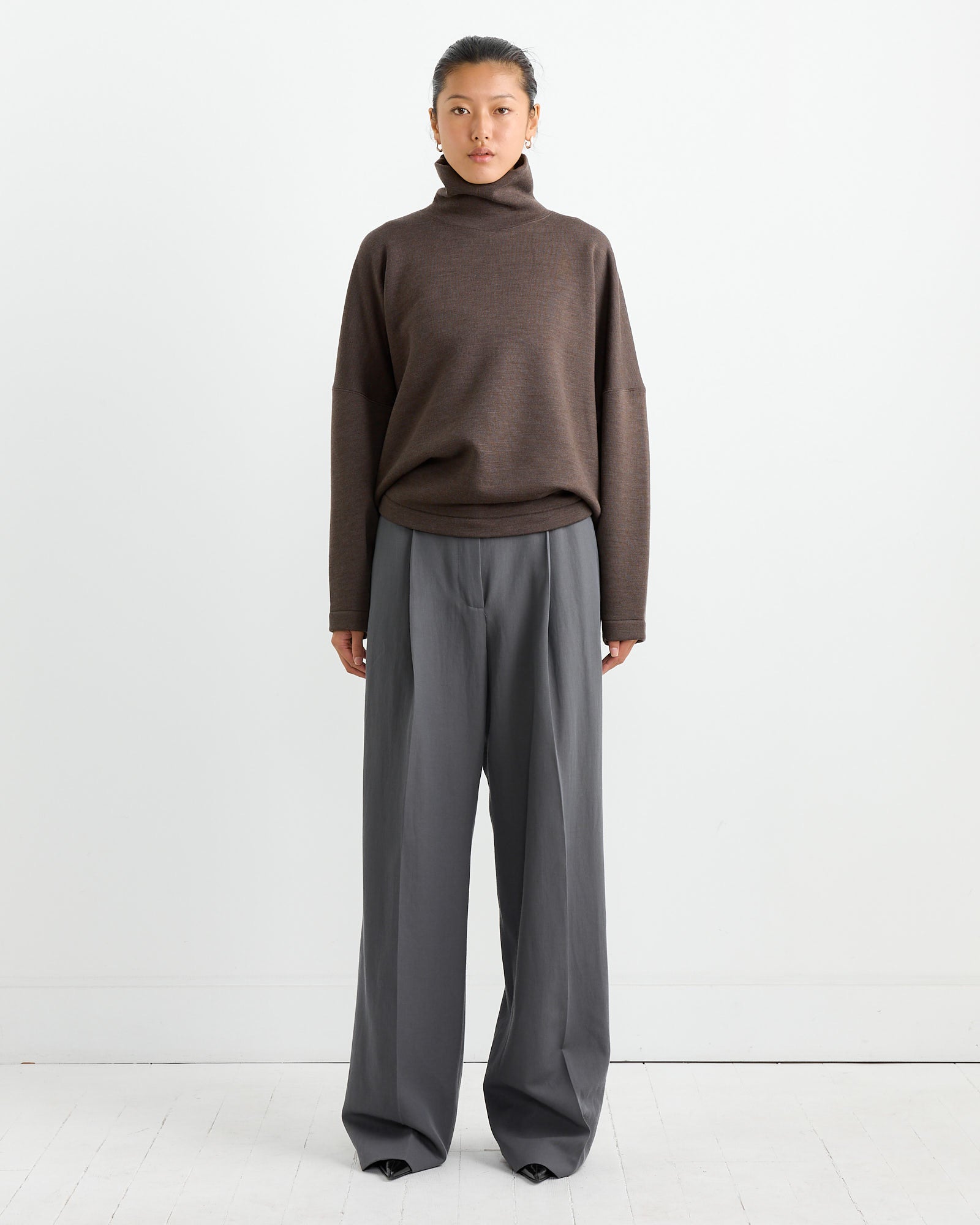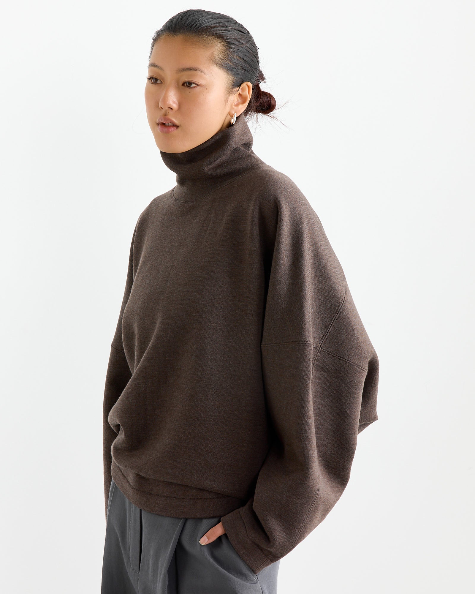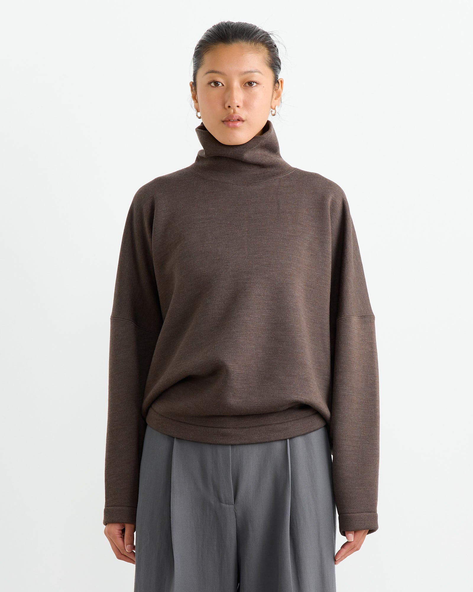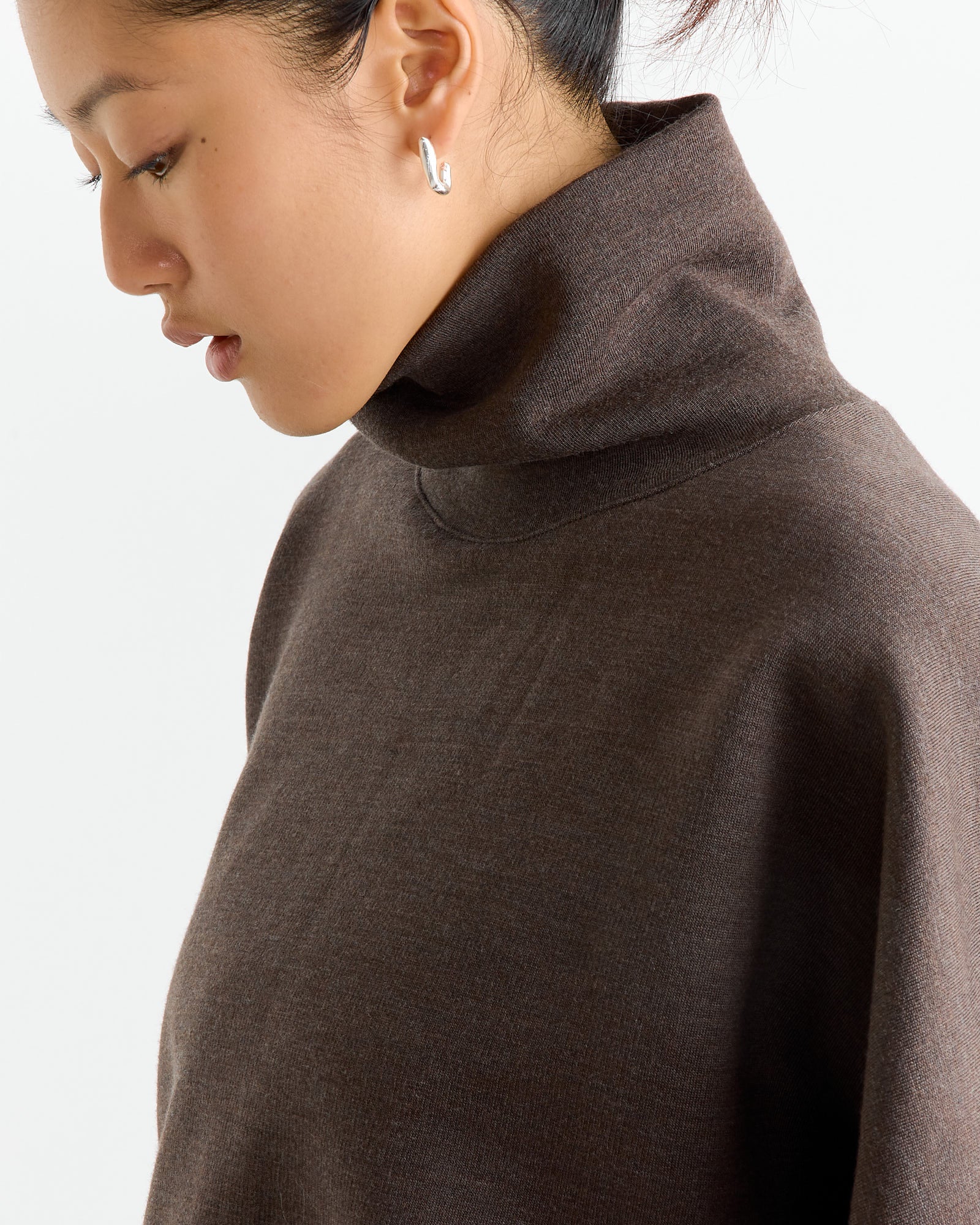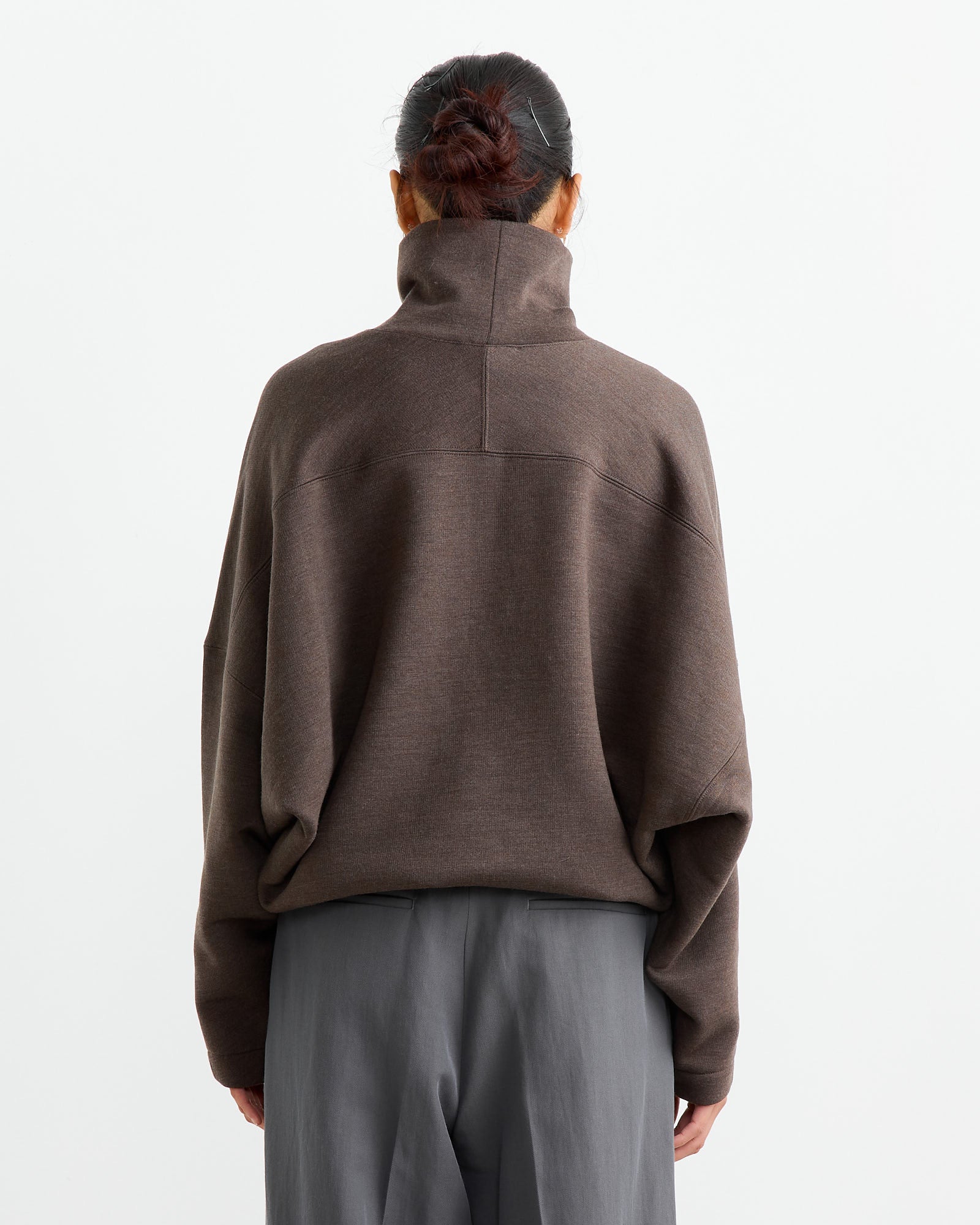 The Lemaire High Neck Sweatshirt in Dark Brown Melange is a sophisticated, relaxed-fit sweatshirt made from a plush wool and cotton blend. It features a high, spacious turtleneck that can be folded down, along with dropped shoulders, giving it a comfortable, slightly rounded silhouette. The soft fabric and elegant design make it ideal for cooler weather, effortlessly blending comfort with style.