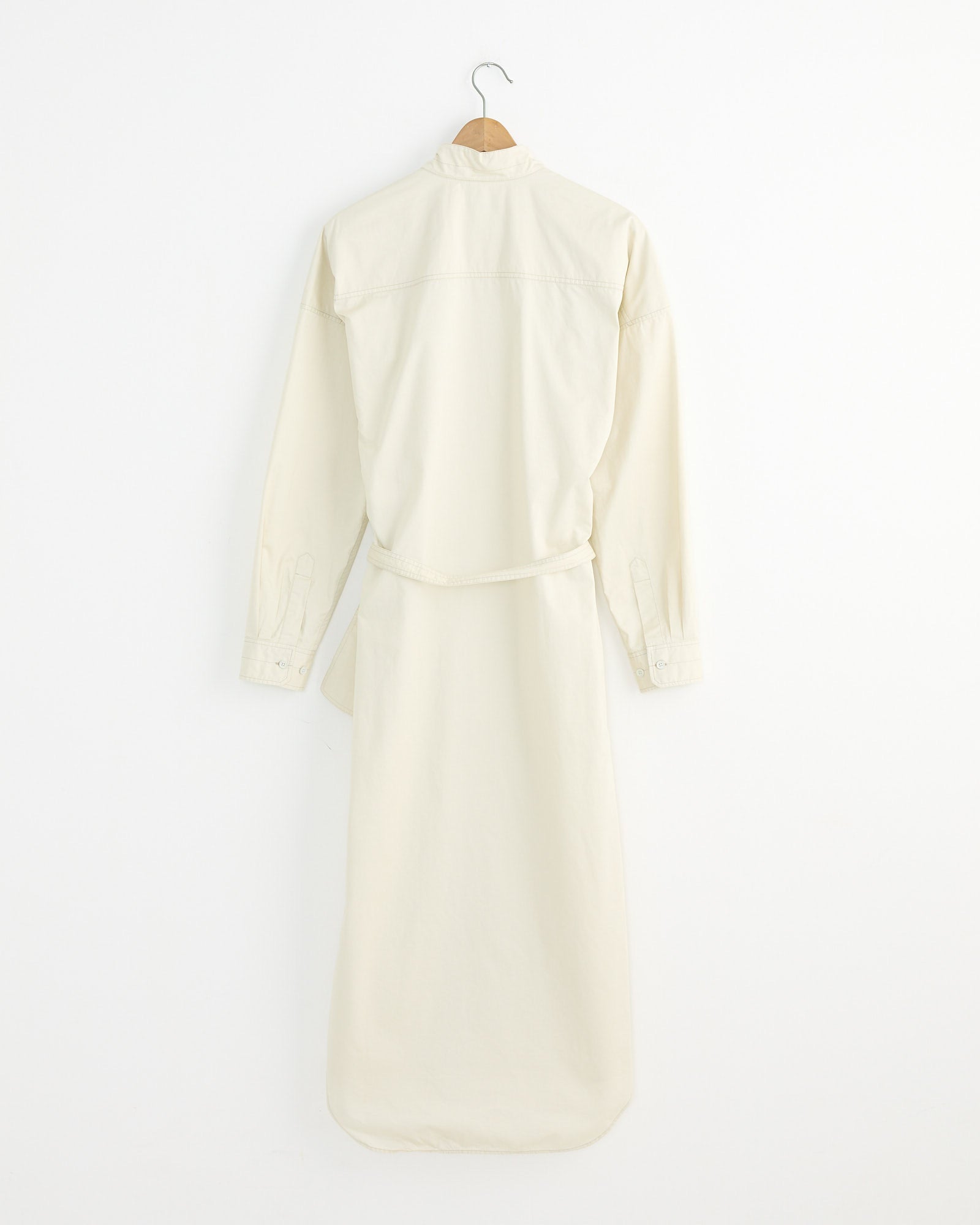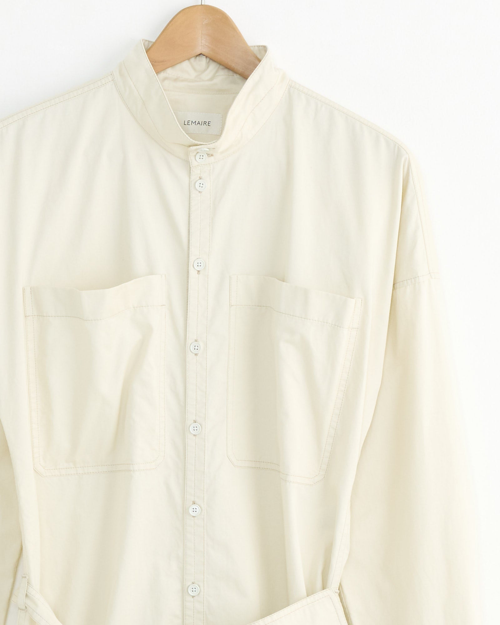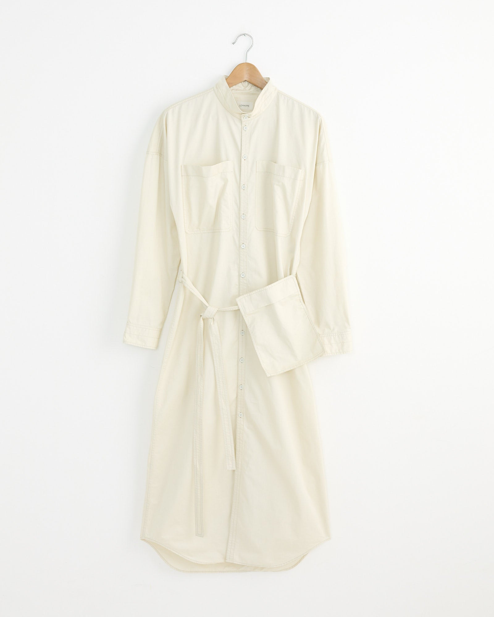 The Long Shirt Dress from Lemaire updates the brand’s signature shirting silhouette with an elongated length and refined details. Crafted from lightweight cotton satin with a soft sheen, it features a straight cut, a high buttoned neck, and a removable belt with an attached flap pocket. Finished with tonal stitching and mother-of-pearl buttons for a polished, versatile look.