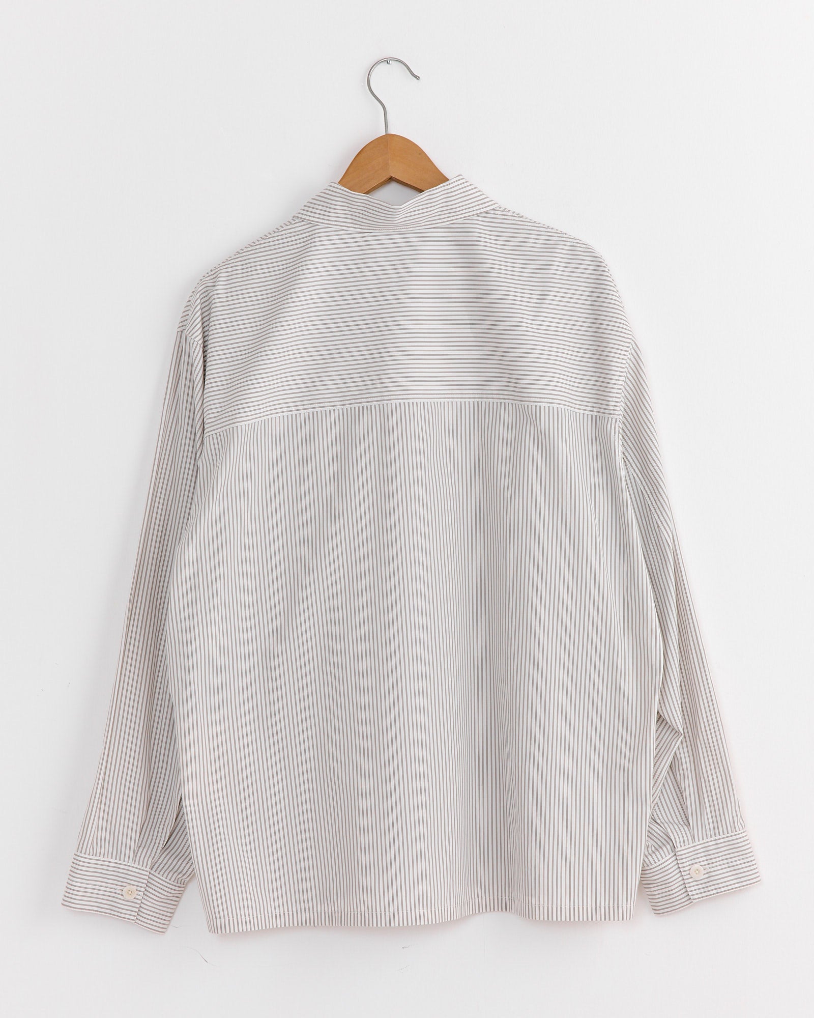 The Lemaire Pyjama Shirt in Creamy White/Taupe/Black embodies the brand’s signature "in & out" philosophy. Crafted from striped cotton poplin, this unisex style is both lightweight and soft for a relaxed feel. Designed with a boxy fit, it features a convertible collar, a wide front placket with corozo buttons, and a single patch pocket. The versatile design allows for a refined yet effortless look.