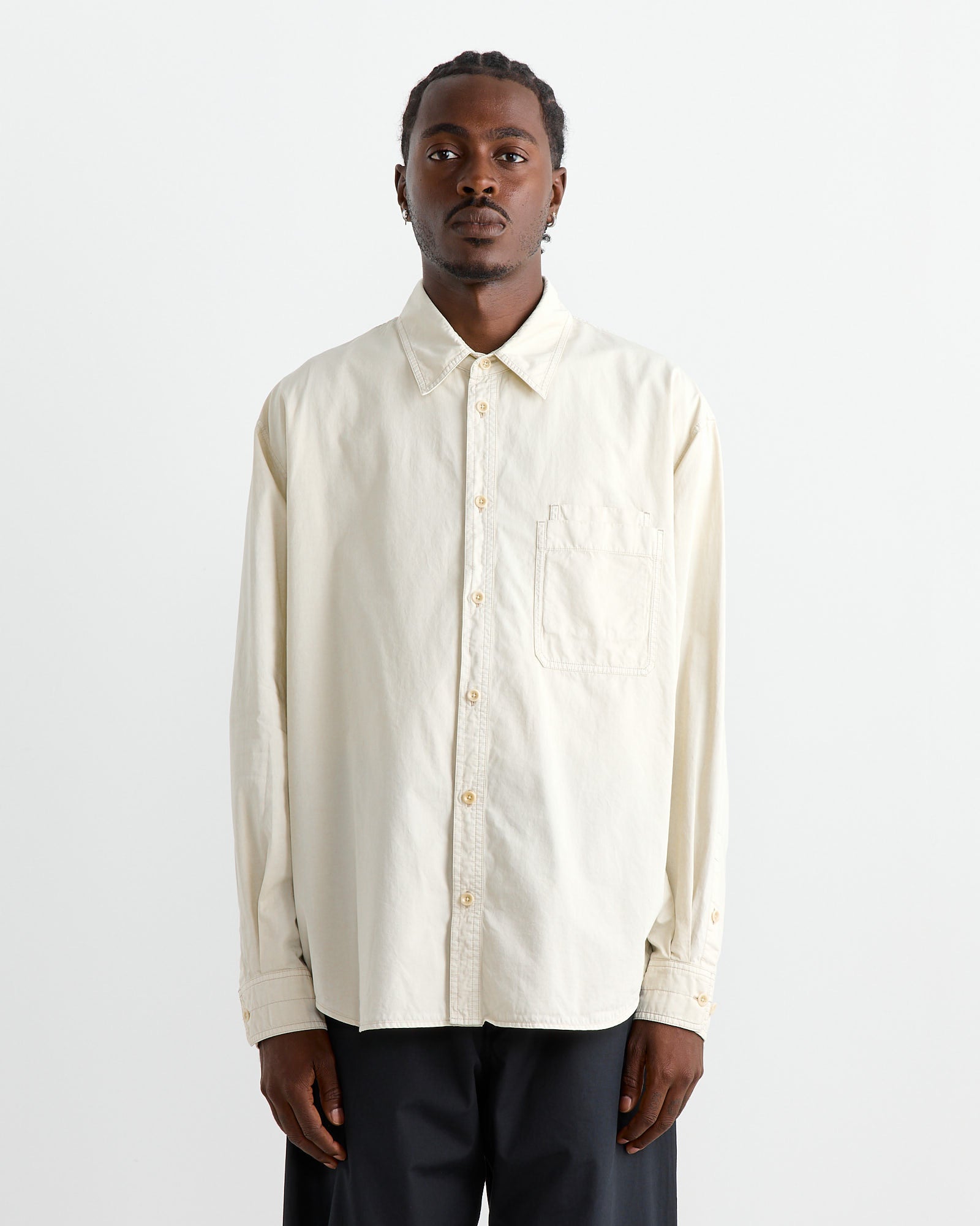 The Lemaire Relaxed Workwear Shirt in Creamy White is crafted from a light cotton-satin blend, giving it a fluid drape and a soft feel. The shirt is garment-dyed for a relaxed fit and features dropped shoulders, a workwear collar, and a button-down front with double chest pockets. It includes double topstitch detailing and a box pleat at the back yoke, adding to its relaxed yet refined look.