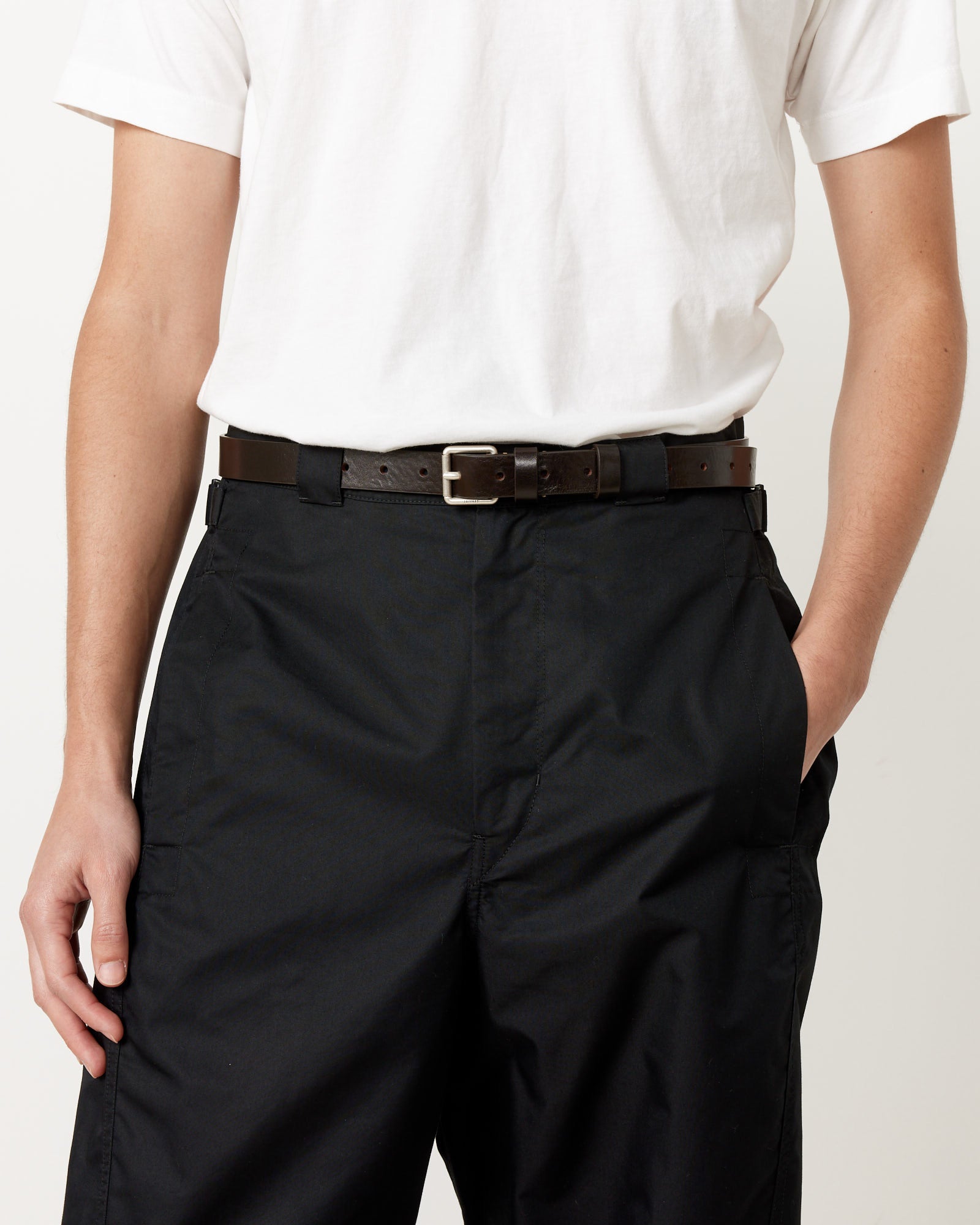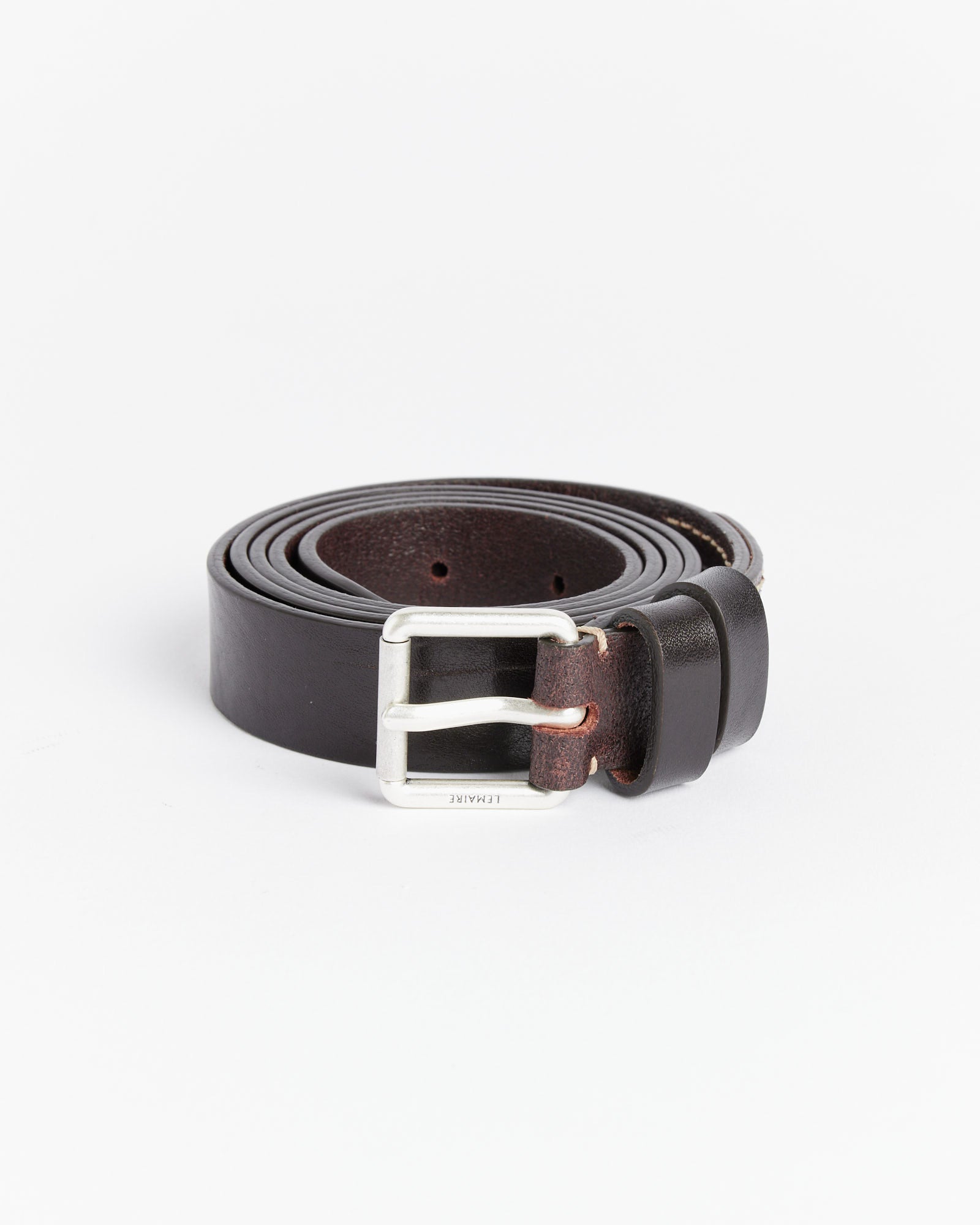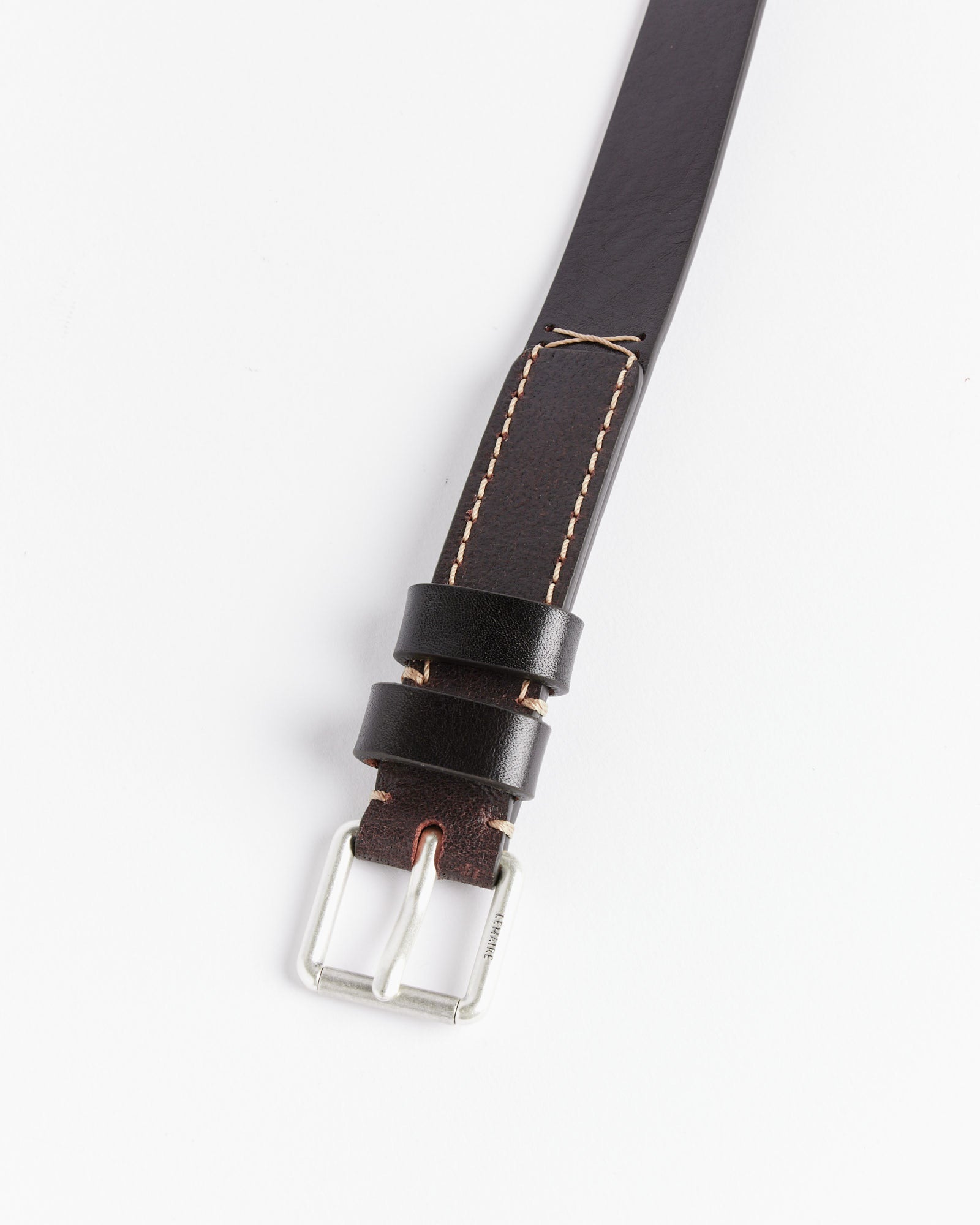 Lemaire's Reversed Belt 25 is a unisex style made from smooth vegetable leather with a shine and features a redesigned matte buckle, and its reverse is hand-stitched with contrasting thread.