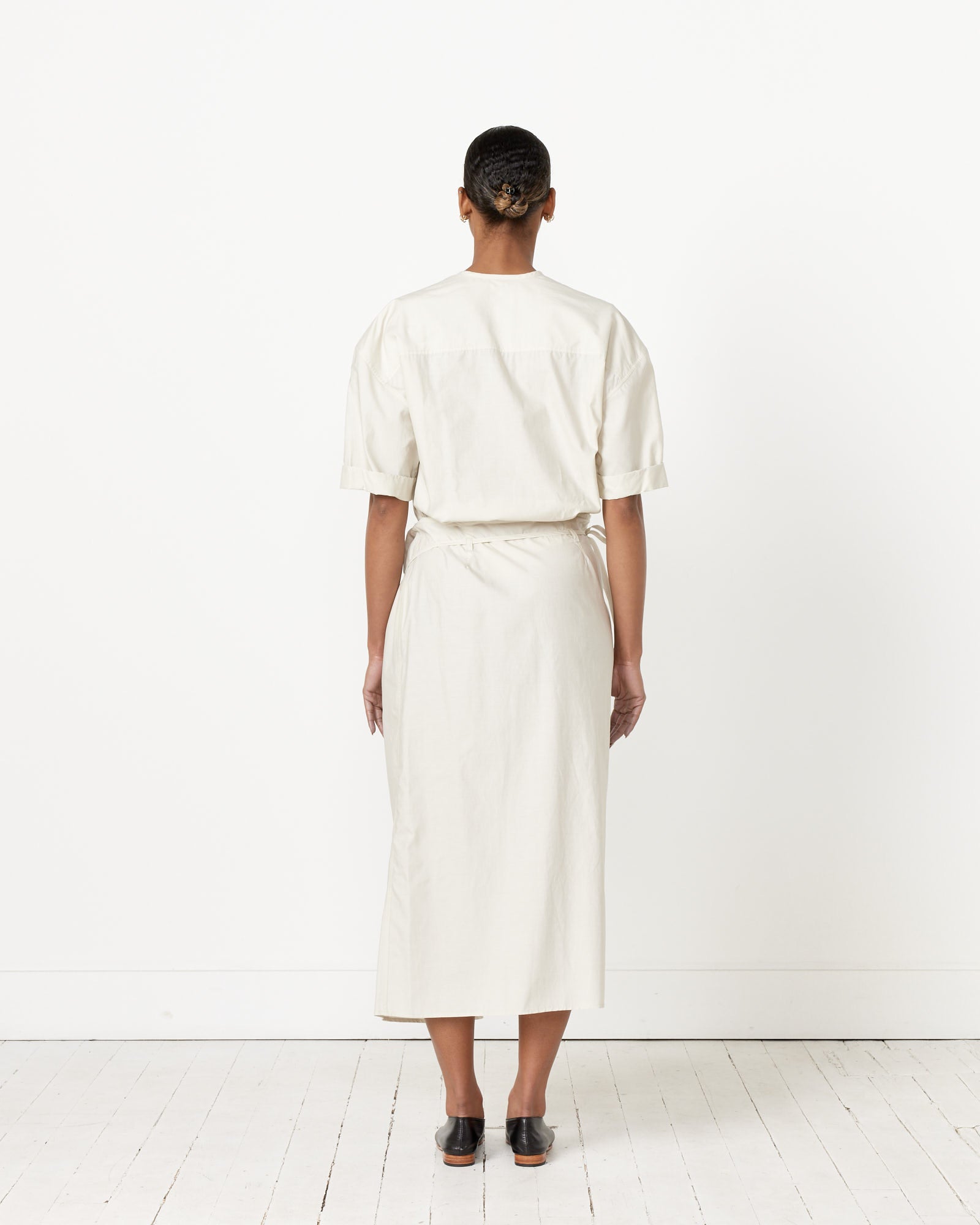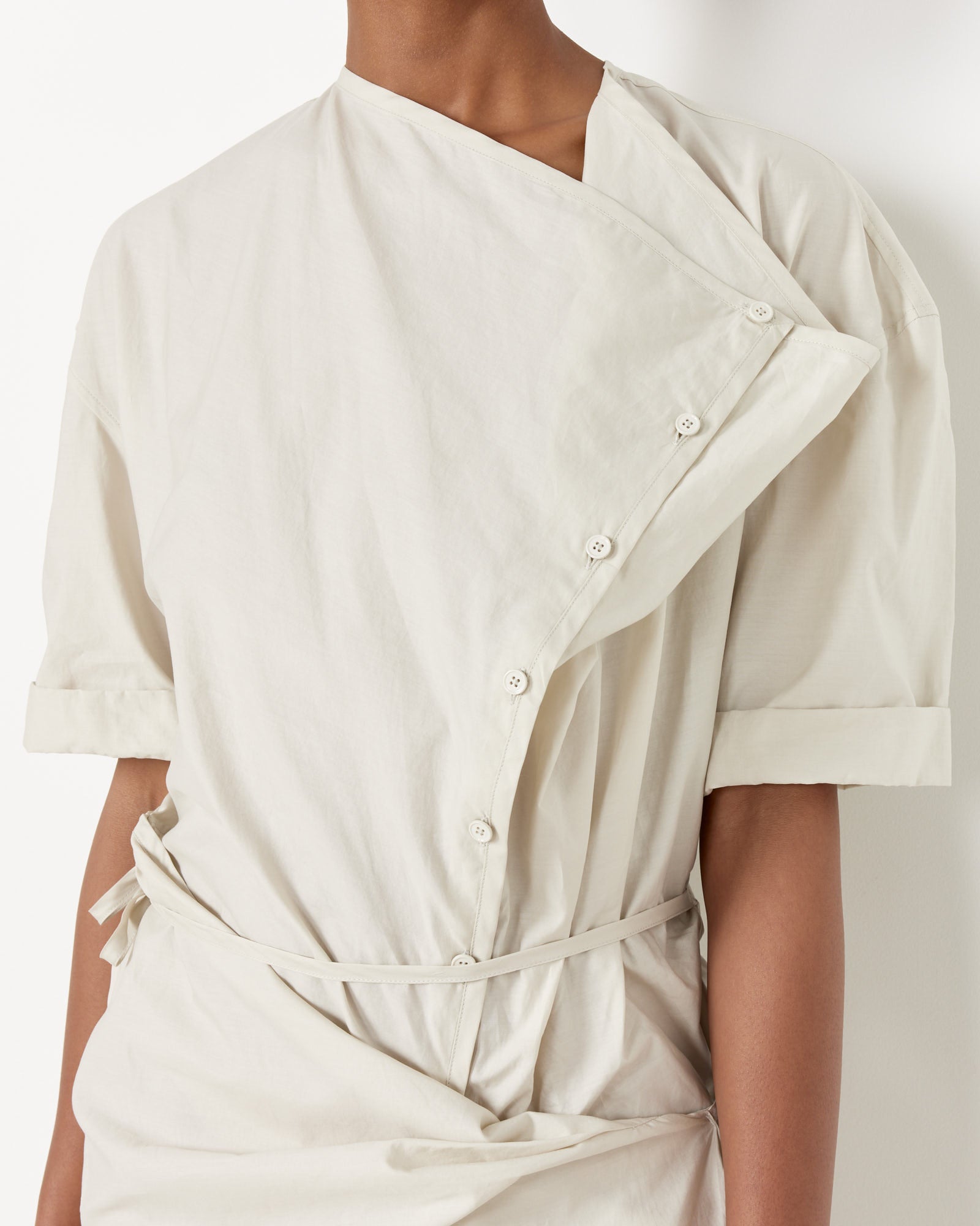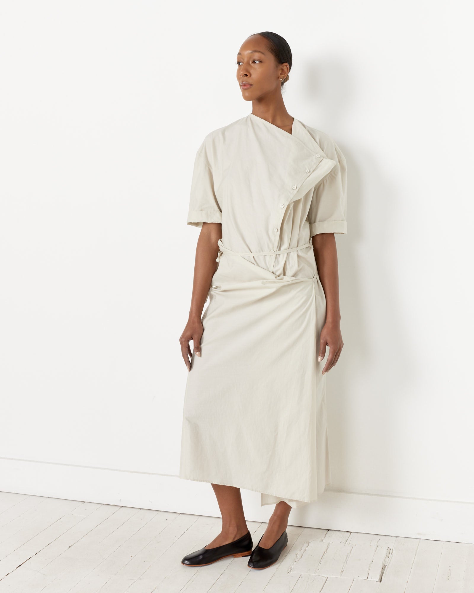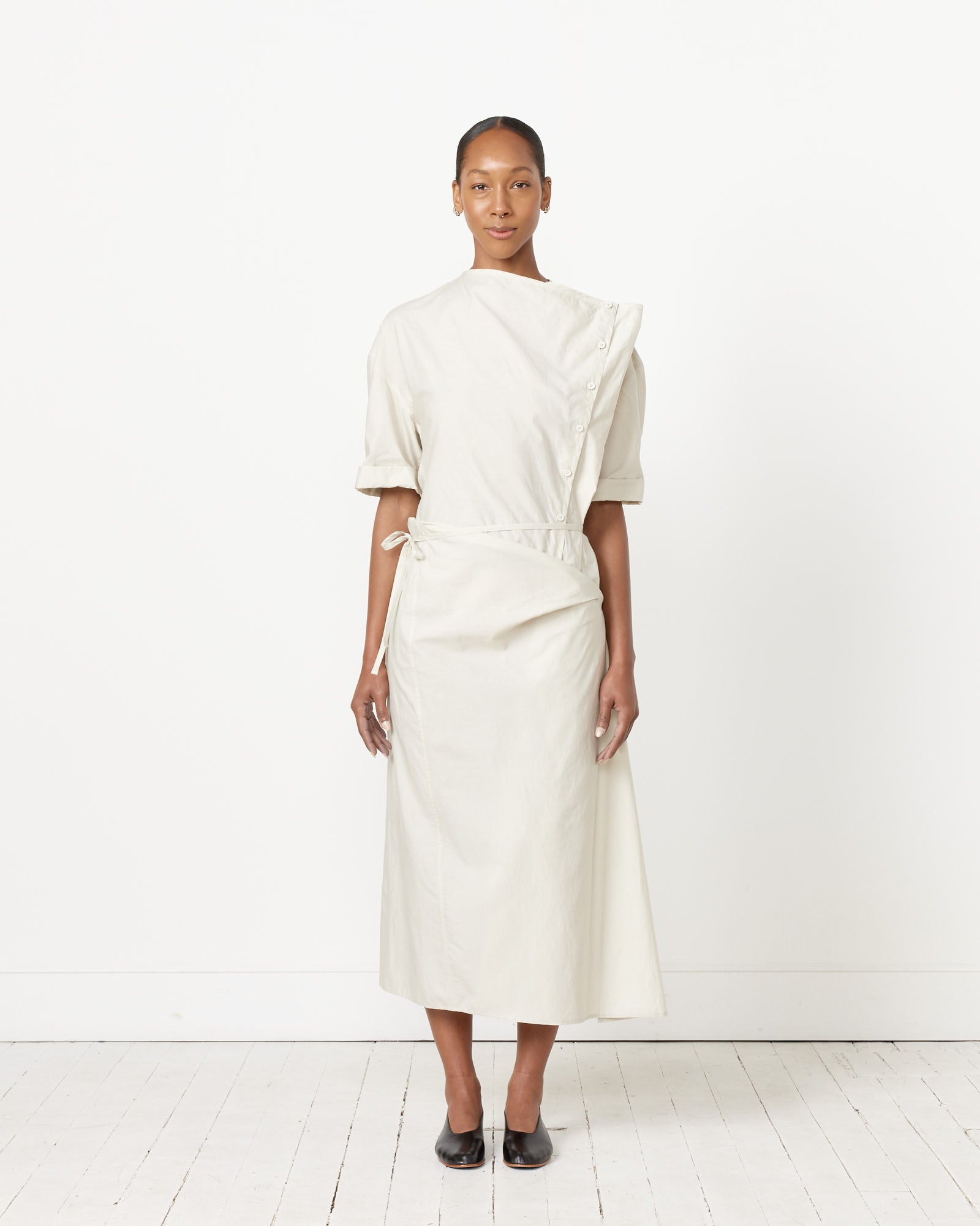 A new addition to the Lemaire wardrobe, the S/S Wrap Dress is made from lightweight cotton with a broken twill weave that provides a subtle yet textural design and is apron-inspired with a straight, sleeveless silhouette with an adjustable self-belt that wraps around the waist.