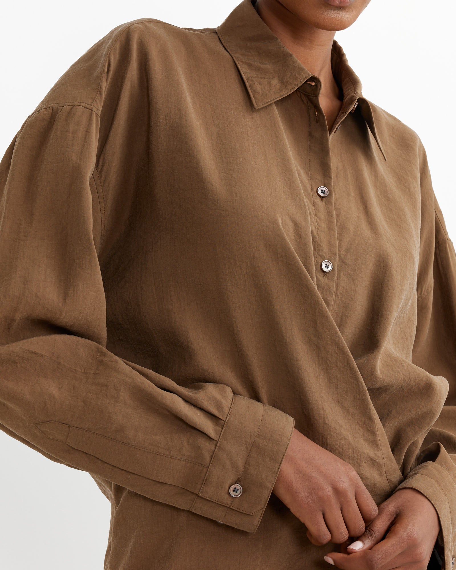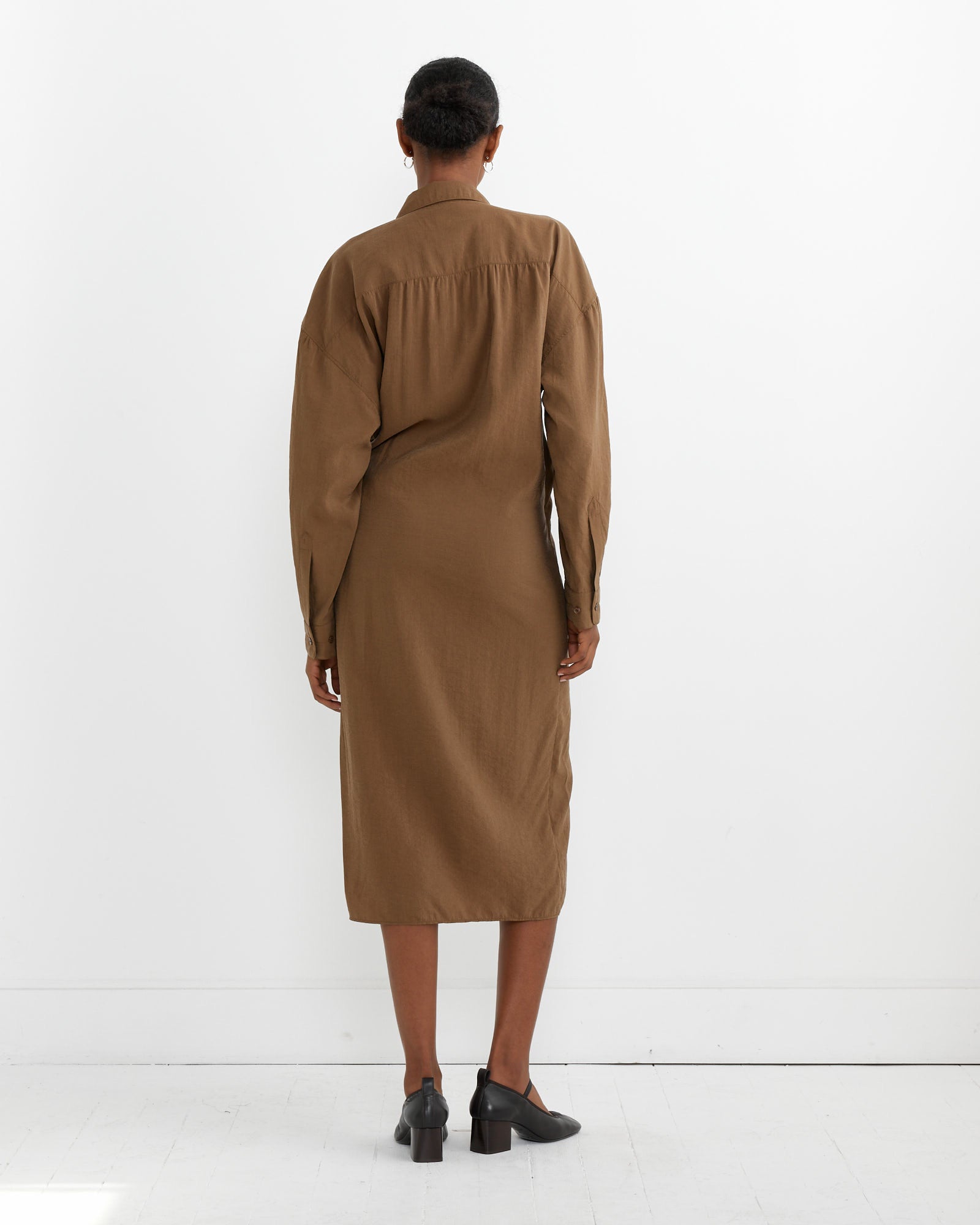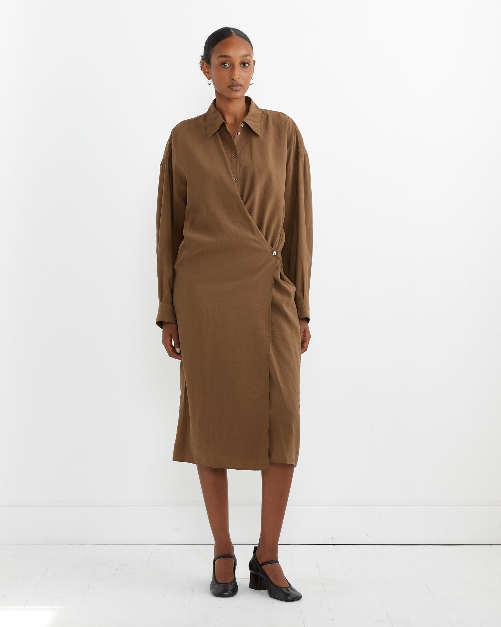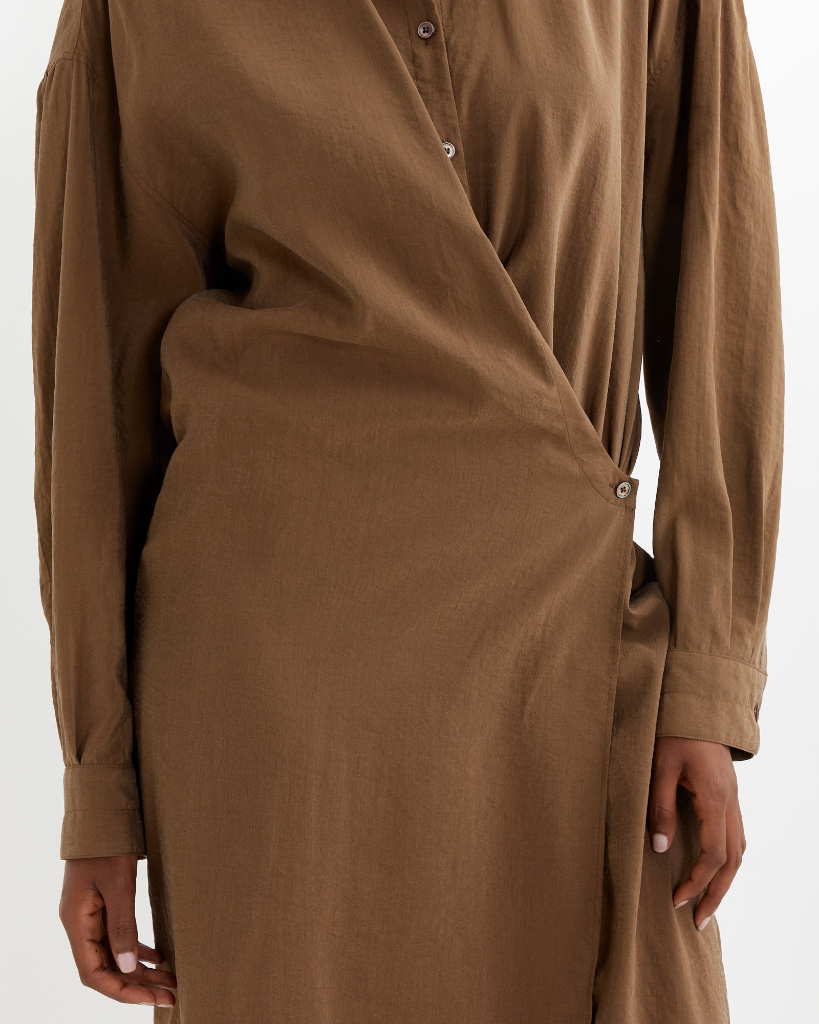 The Straight Collar Twisted Dress in Havana is a staple of the Lemaire wardrobe cut from a dry silk blend with a soft hand and tonic texture, and detailed with an asymmetric button placket that closes over the hip, wrapping around the body from the waist to just below the knee.