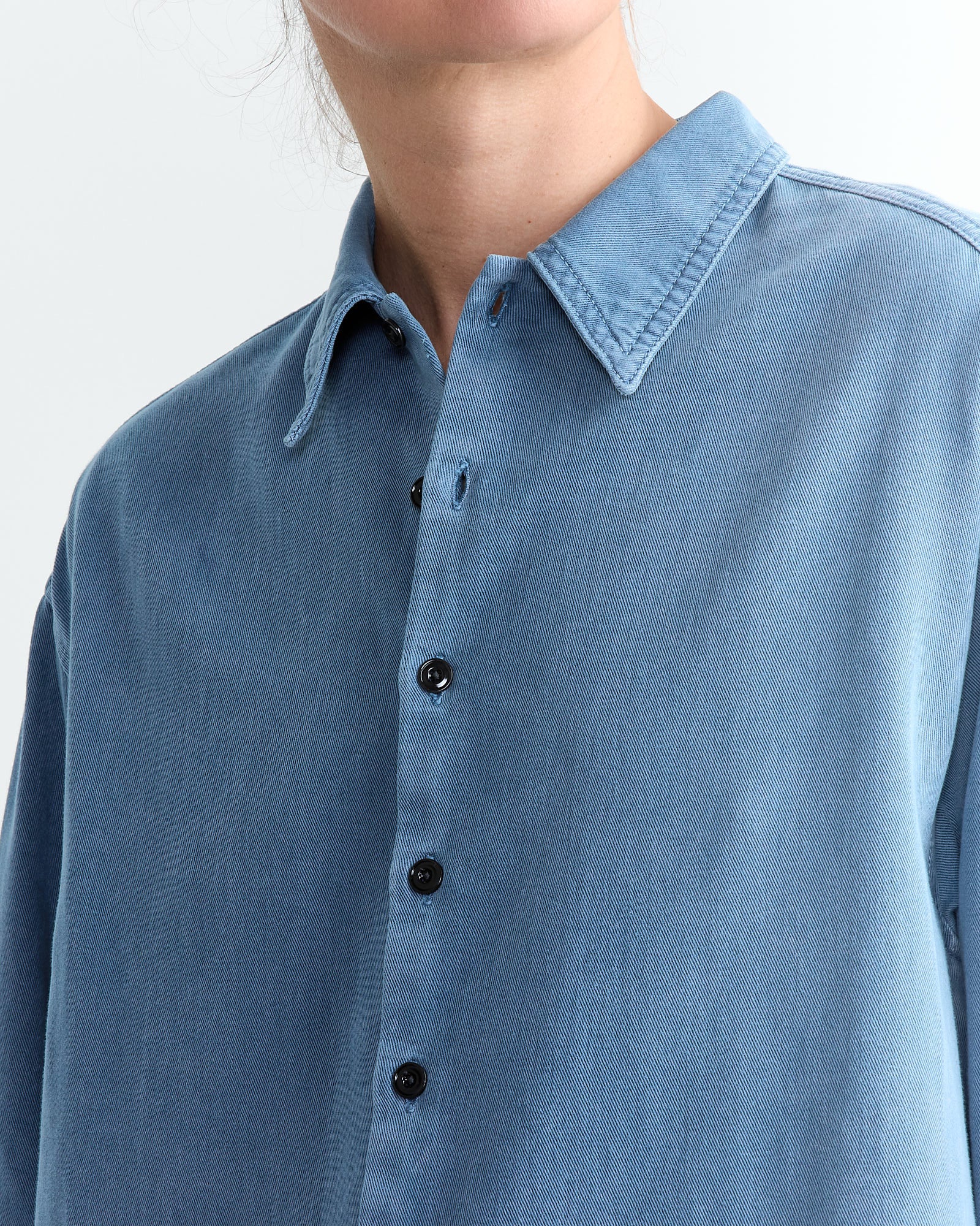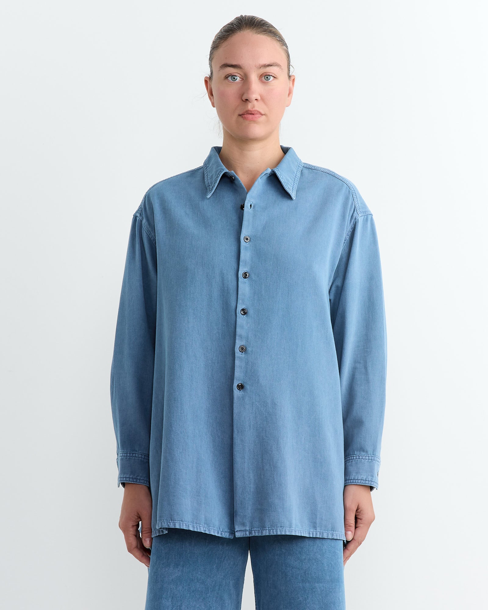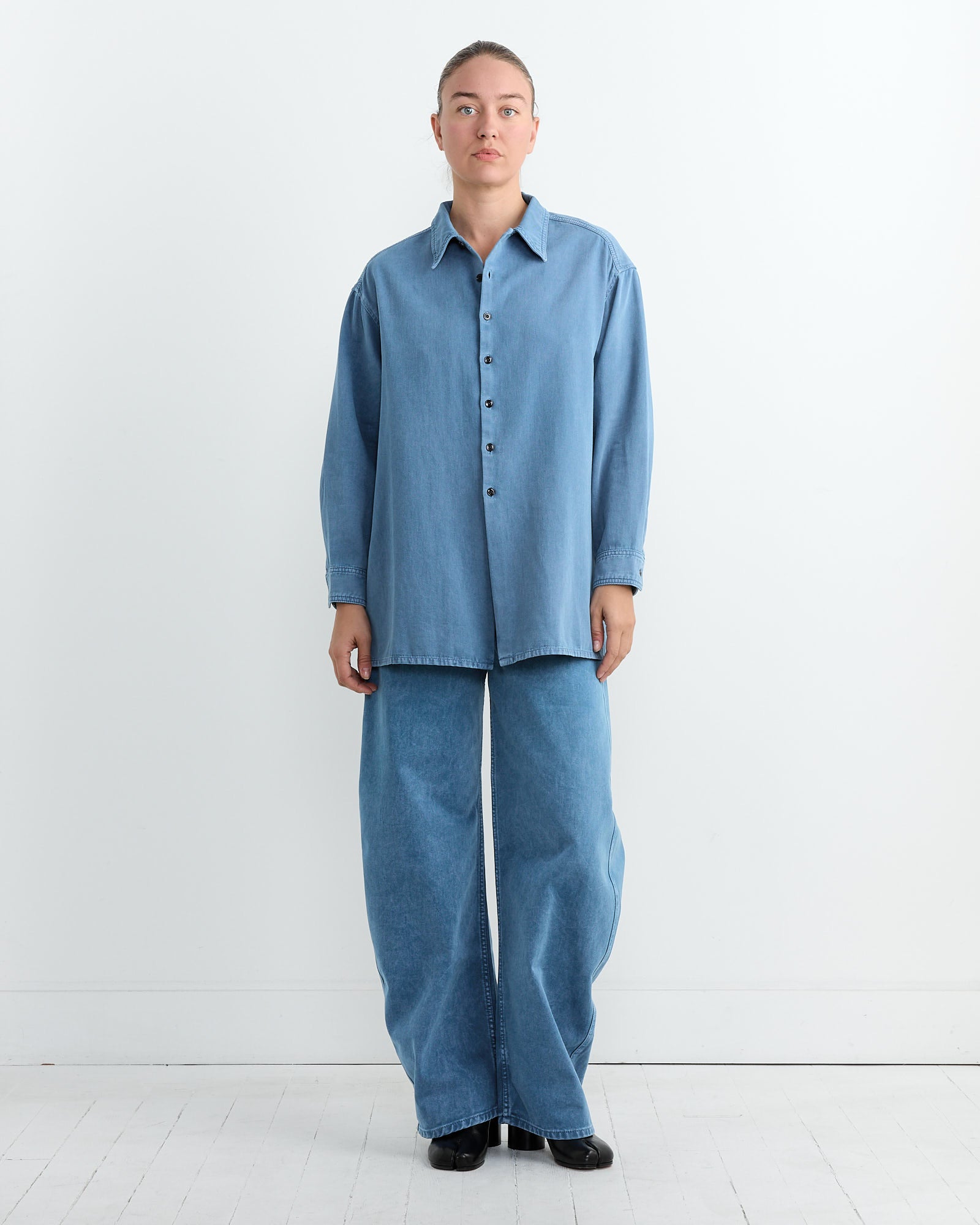 The Lemaire Twisted Denim Shirt in Snow Blue is a boxy-fit, non-stretch denim shirt featuring a unique wrap construction. It includes a spread collar, button closure, and adjustable single-button barrel cuffs. The shirt also has button fastenings at the side seams, allowing for alternate styling options.