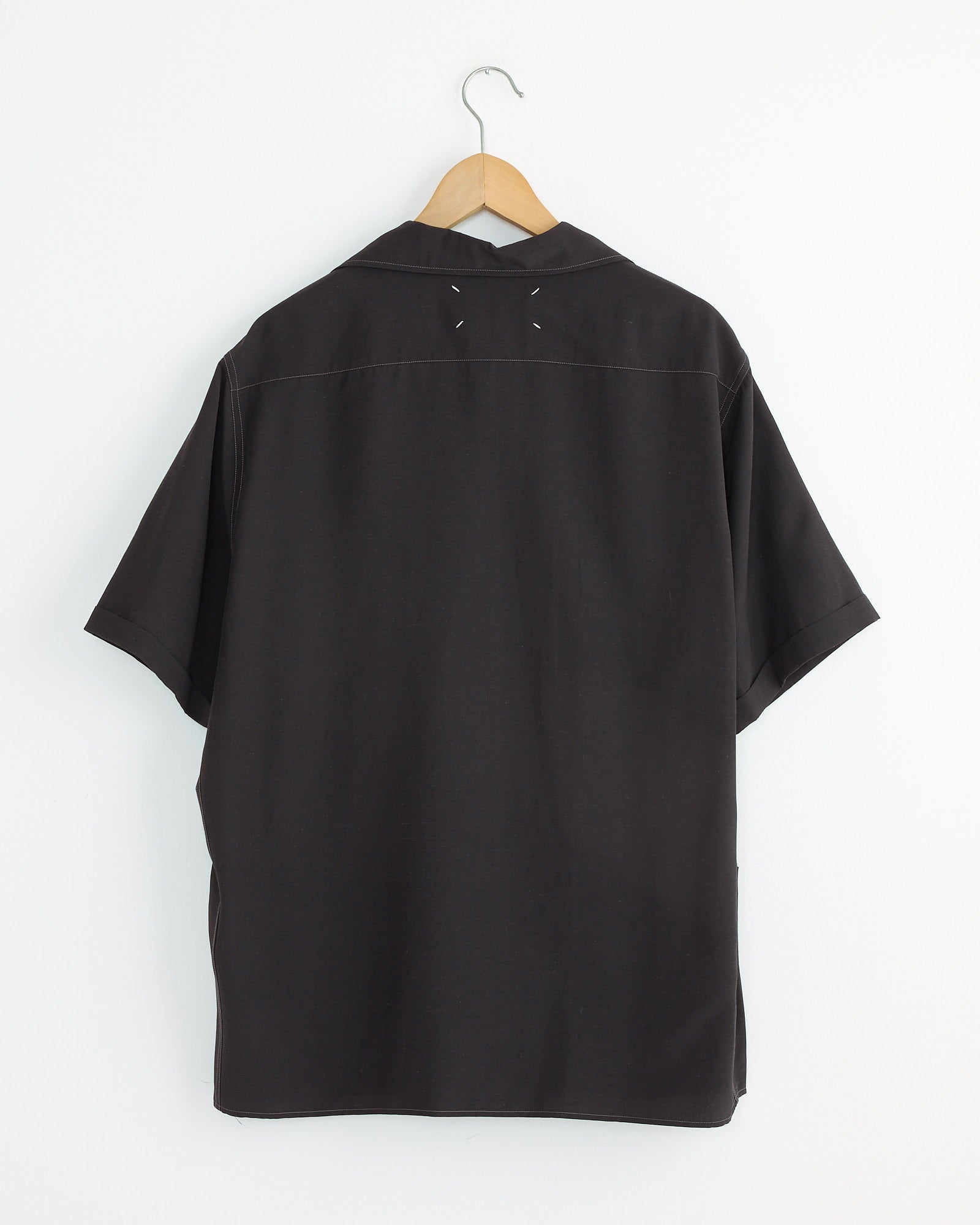 The Short-Sleeve Shirt from Maison Margiela is cut from a striped blend of acetate, cotton, and linen with a soft drape and subtle sheen. Designed with a flat collar, button front, and three patch pockets, it’s finished with a straight hem and the house’s signature four white stitches at the back.