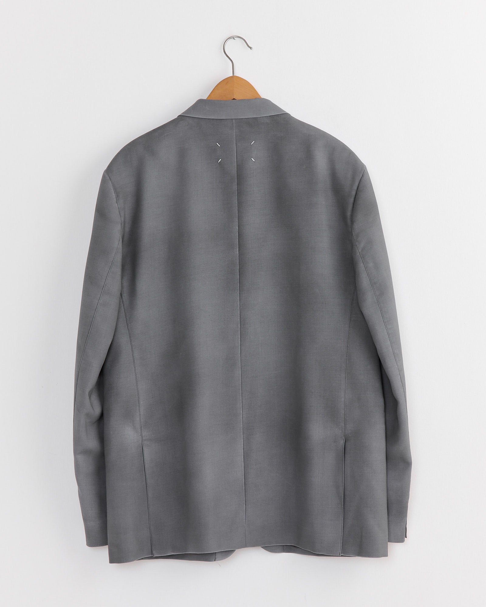 The Maison Margiela Wool Mohair Suit Jacket is crafted from a wool-mohair blend and treated with a hand-applied greasy patina technique for a worn, uneven finish. It features a notch lapel, a single-breasted closure, and a welt chest pocket with flap pockets. Designed without a back vent for a clean silhouette, it is finished with the brand’s signature Four Stitches at the back.
