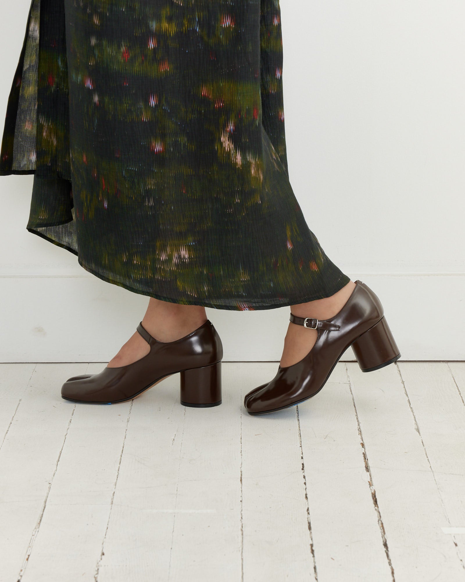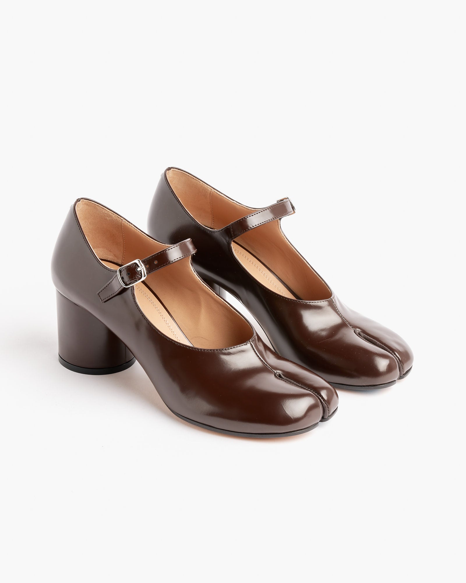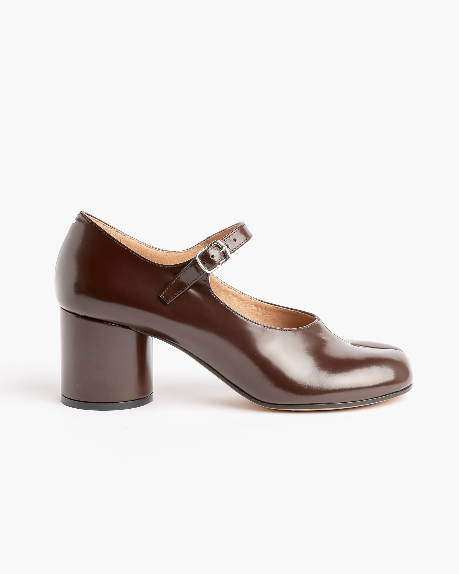 Maison Margiela's Tabi Mary Jane features a tabi split toe inspired by the traditional 15th-century Japanese sock bearing the same name, a three-inch cylindrical heel, and an adjustable pin-buckle strap at the vamp. The pair captures the avant-garde and insubordinate spirit of the Maison and exists as a heritage classic, continuously explored in each collection.