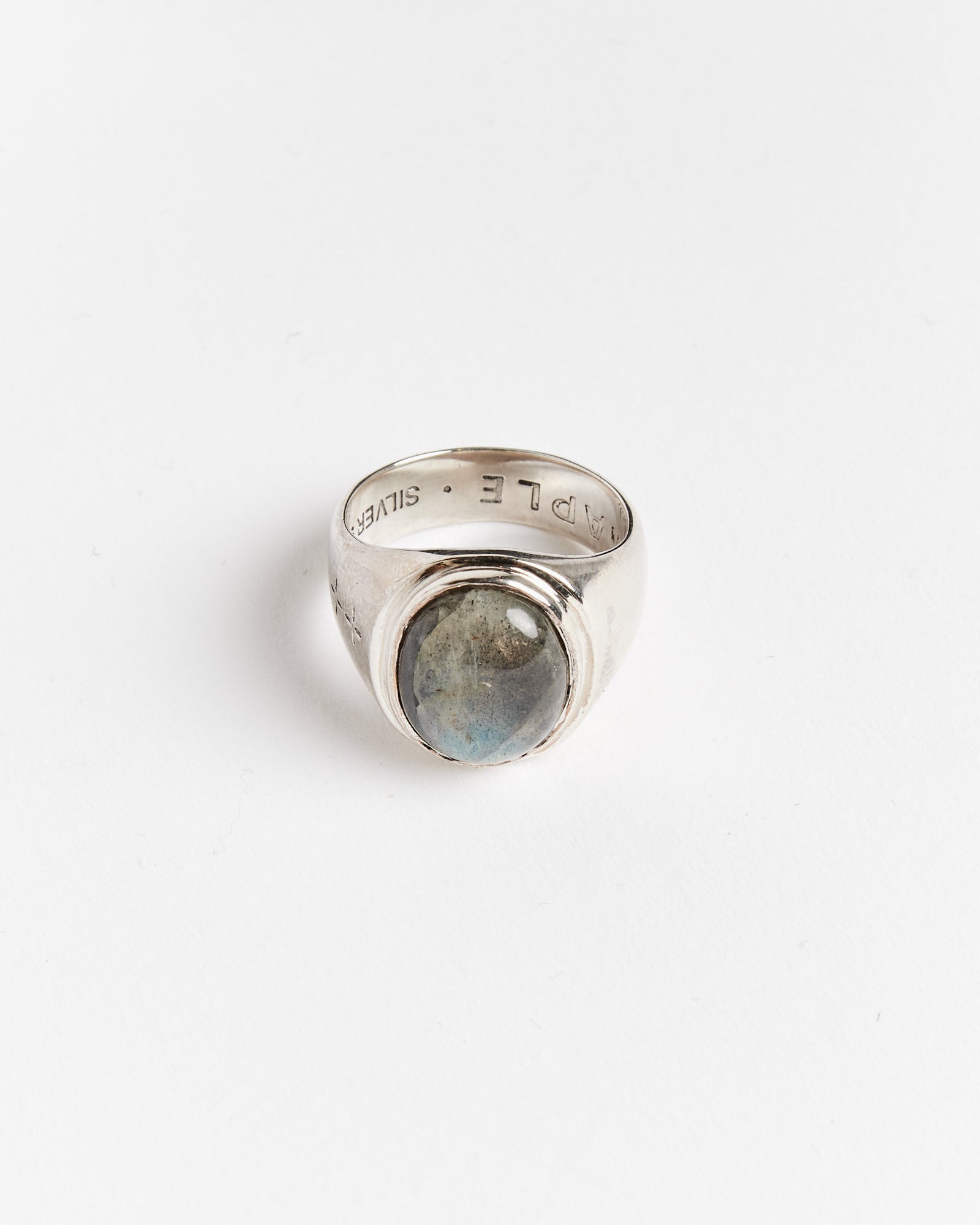 Maple's Tommy Signet Ring is a classic oval signet made from 925 sterling silver with labradorite inset at the face, a bandana pattern accenting the side, and a maple logo at the interior.