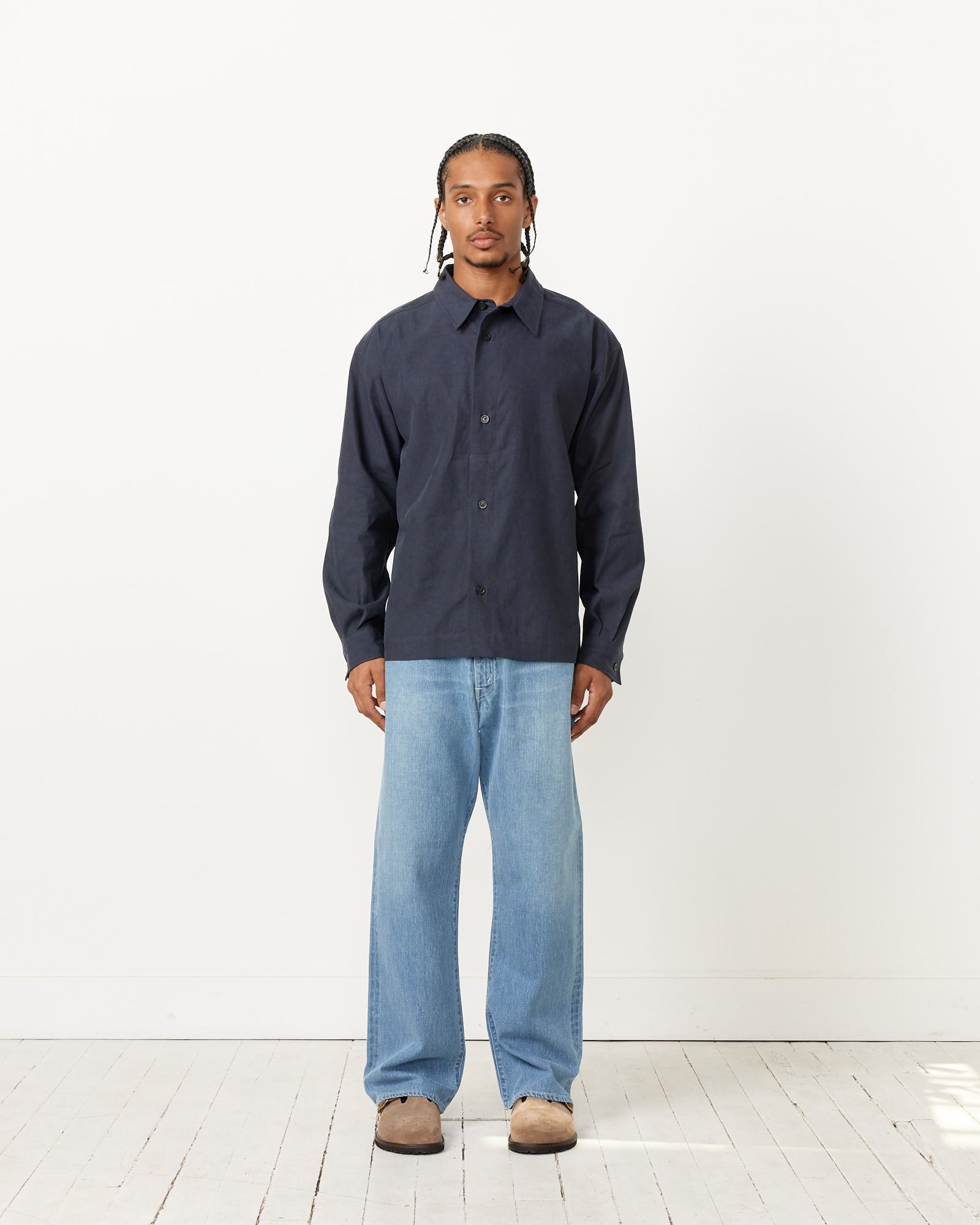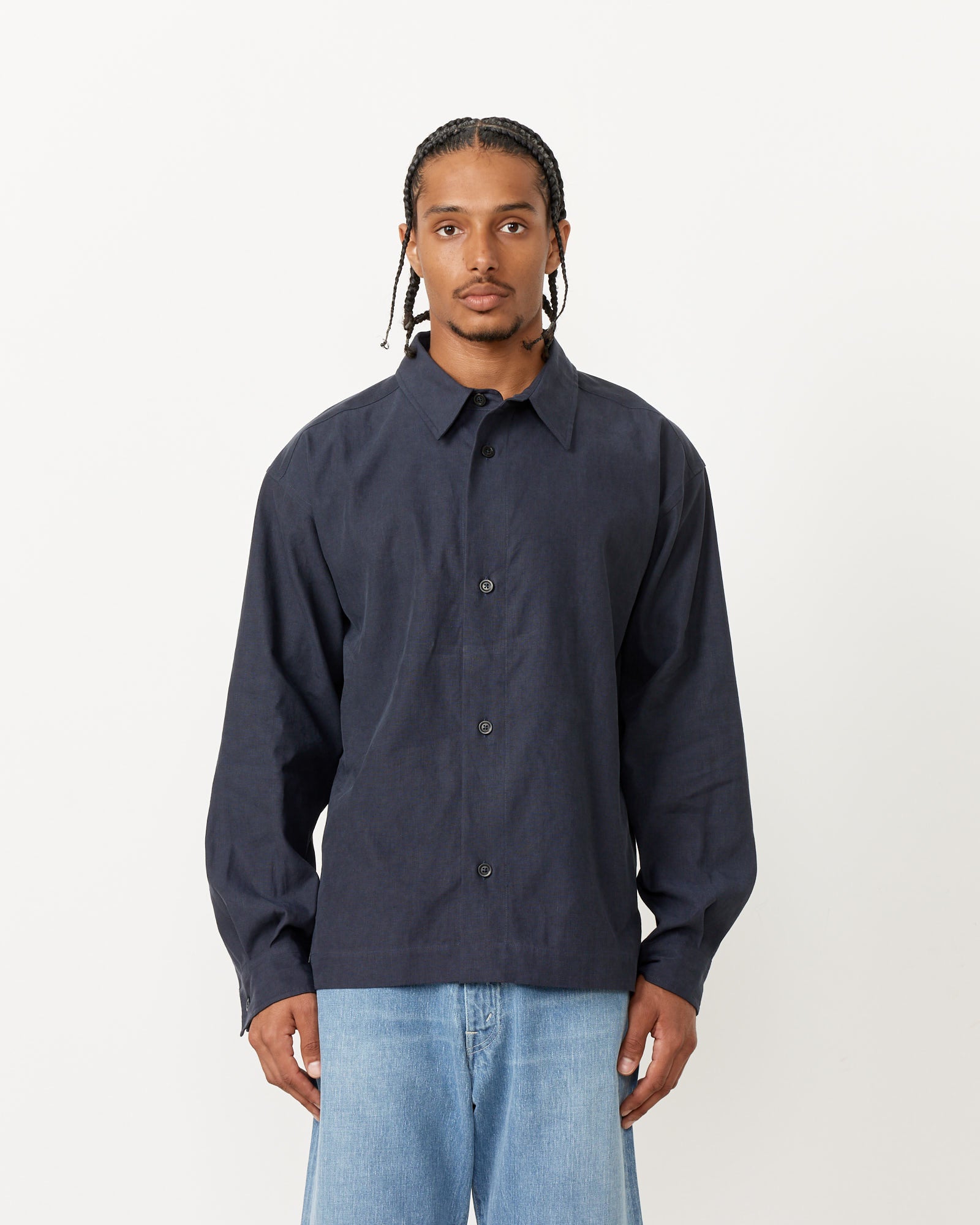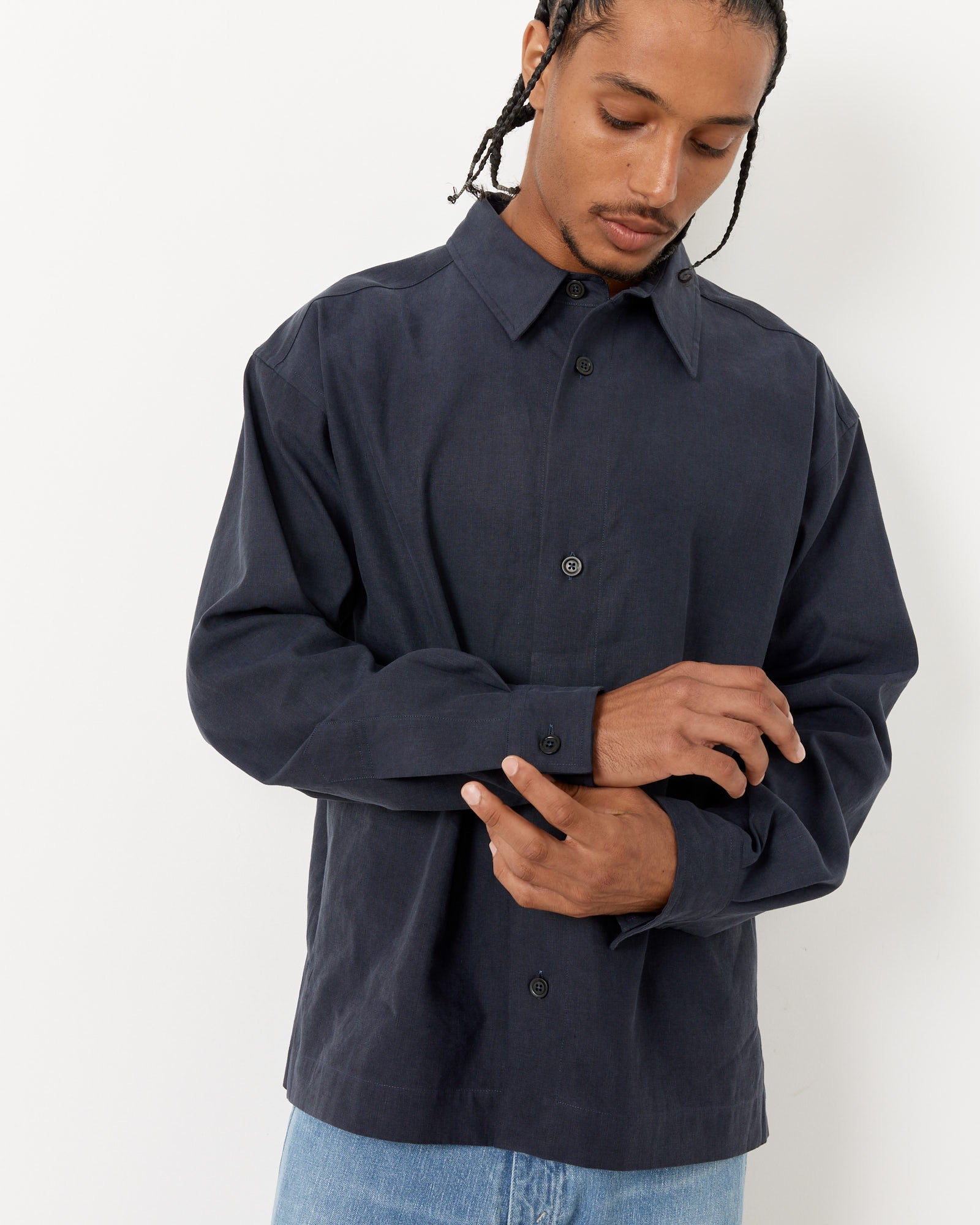Margaret Howell's Minimal Boxy Shirt is fabricated in a midweight poplin blend cut in a boxy silhouette with a wide stitch-through placket, horn buttons, a side split hem, and a box pleat at the back.