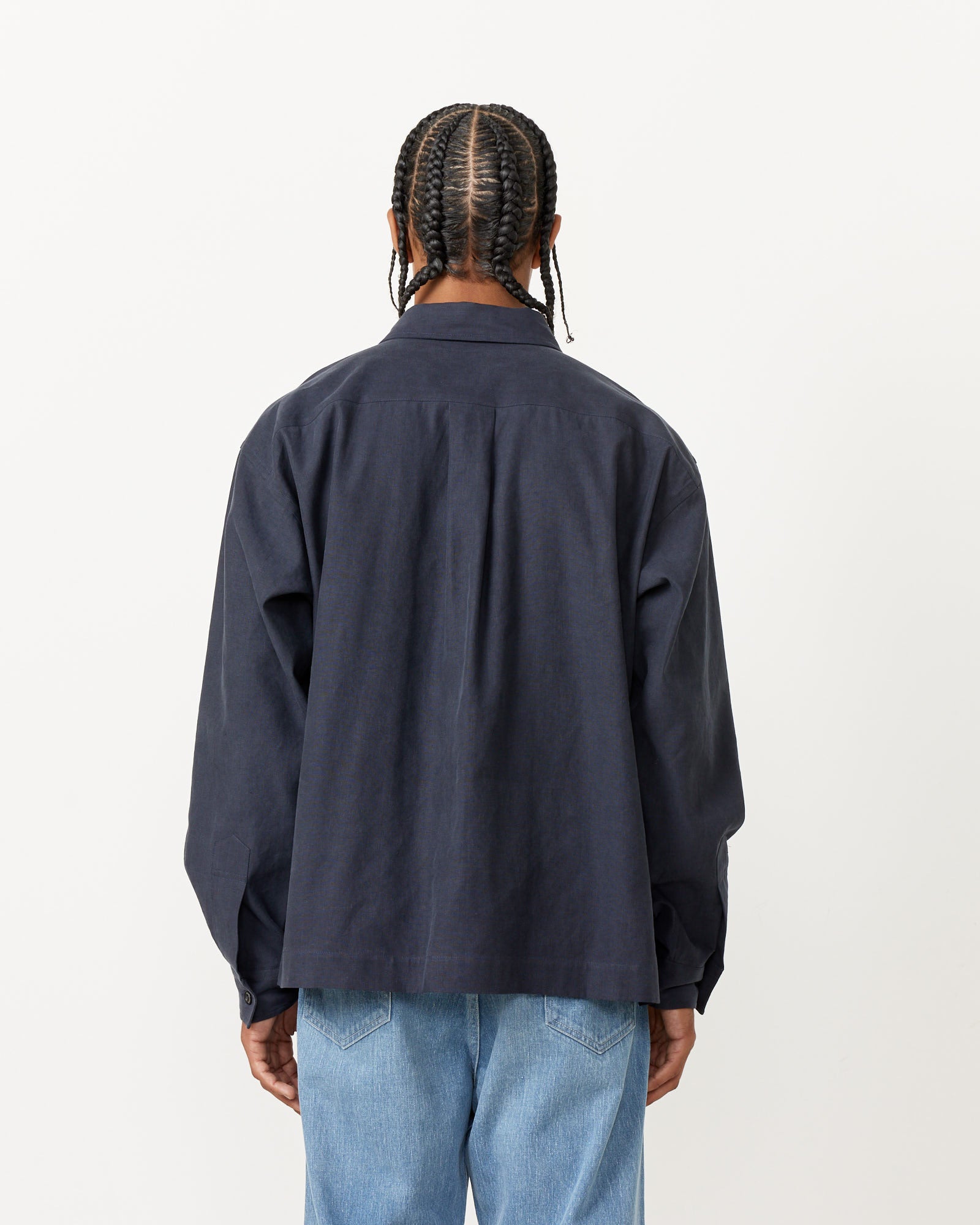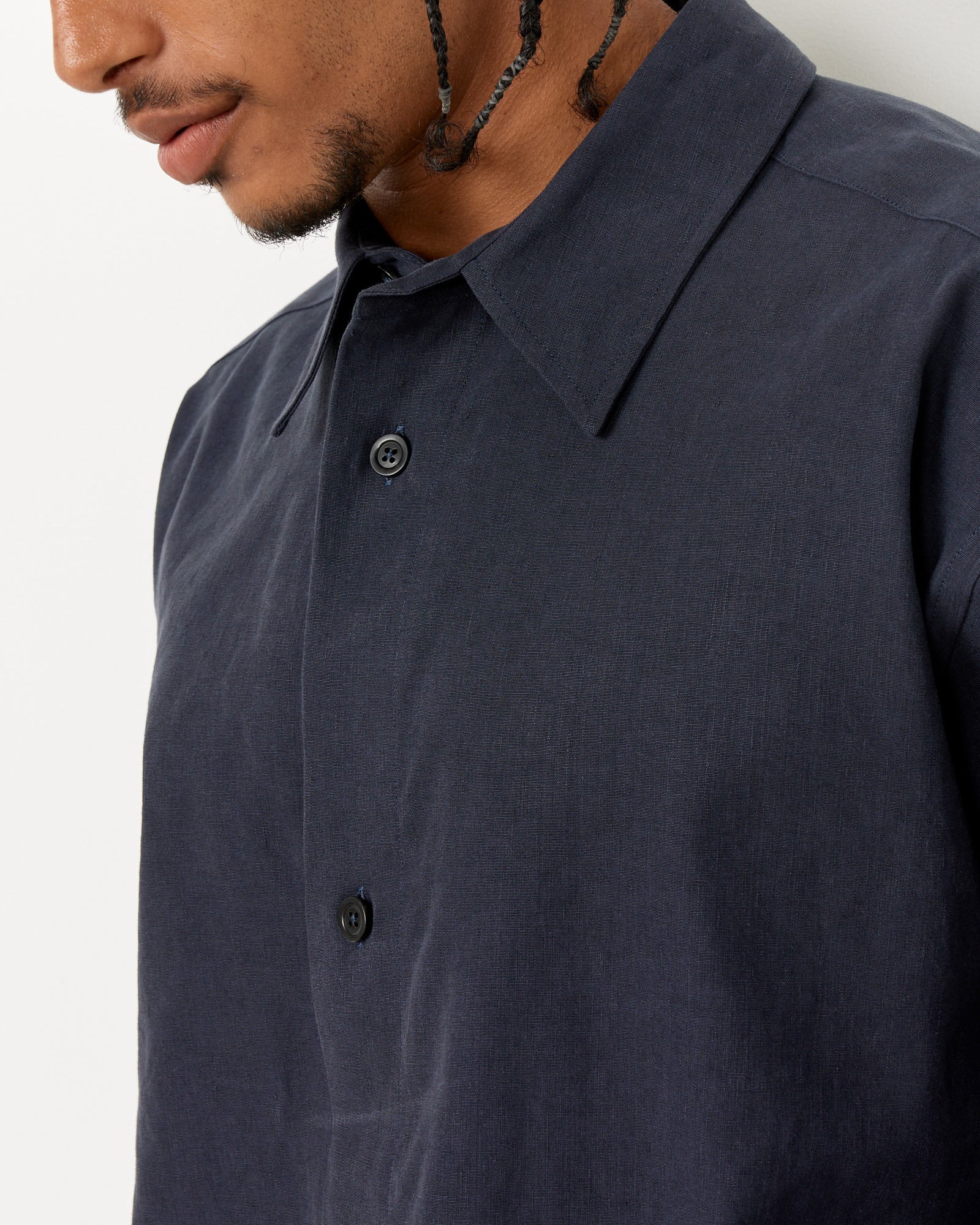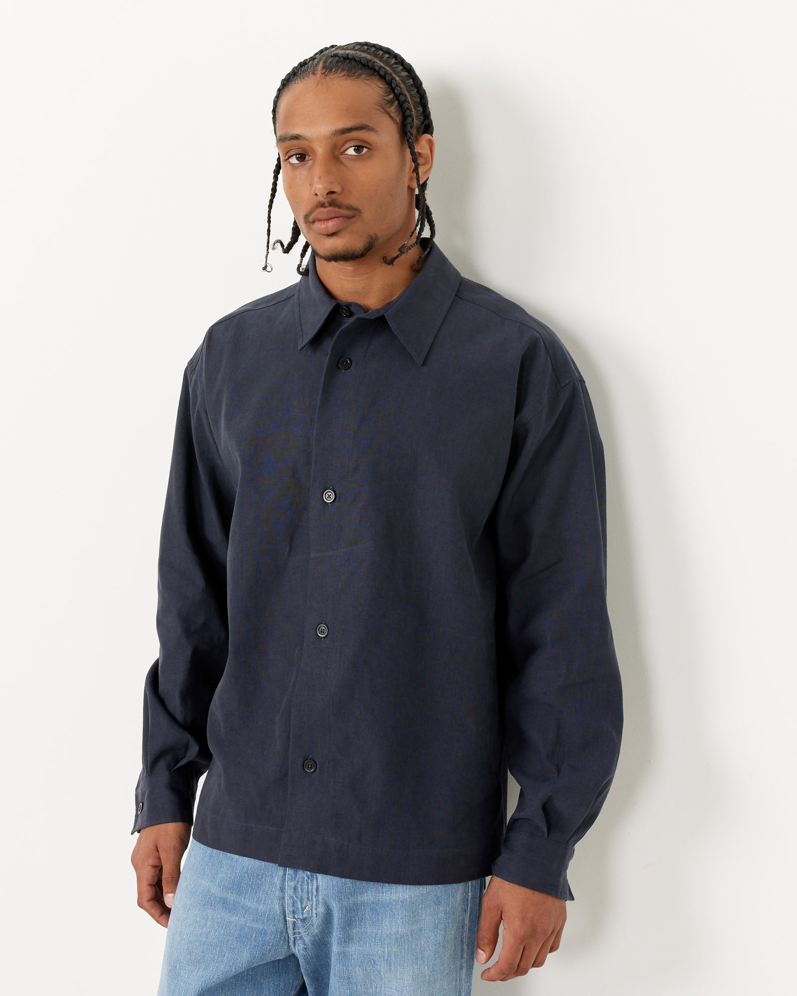 Margaret Howell's Minimal Boxy Shirt is fabricated in a midweight poplin blend cut in a boxy silhouette with a wide stitch-through placket, horn buttons, a side split hem, and a box pleat at the back.