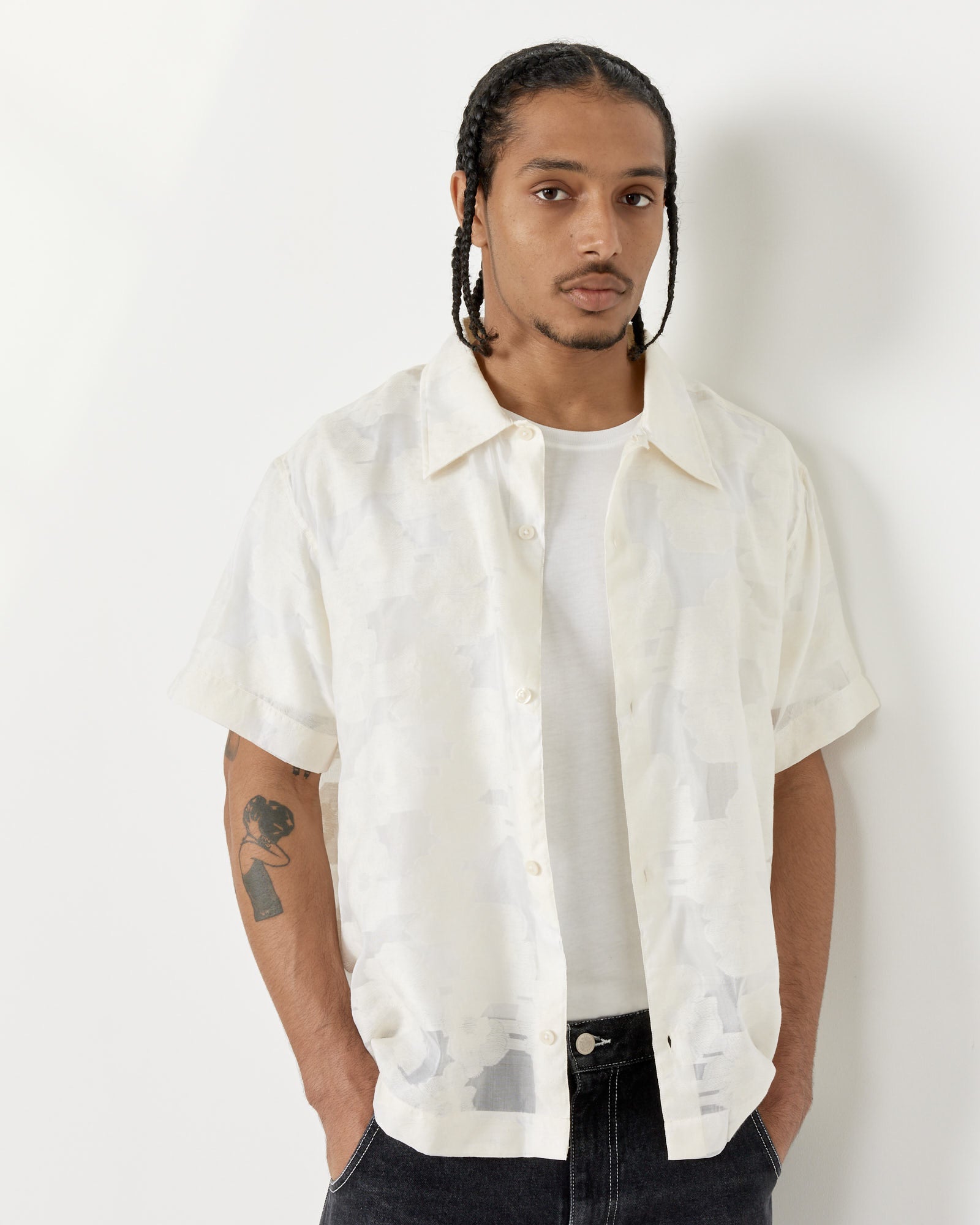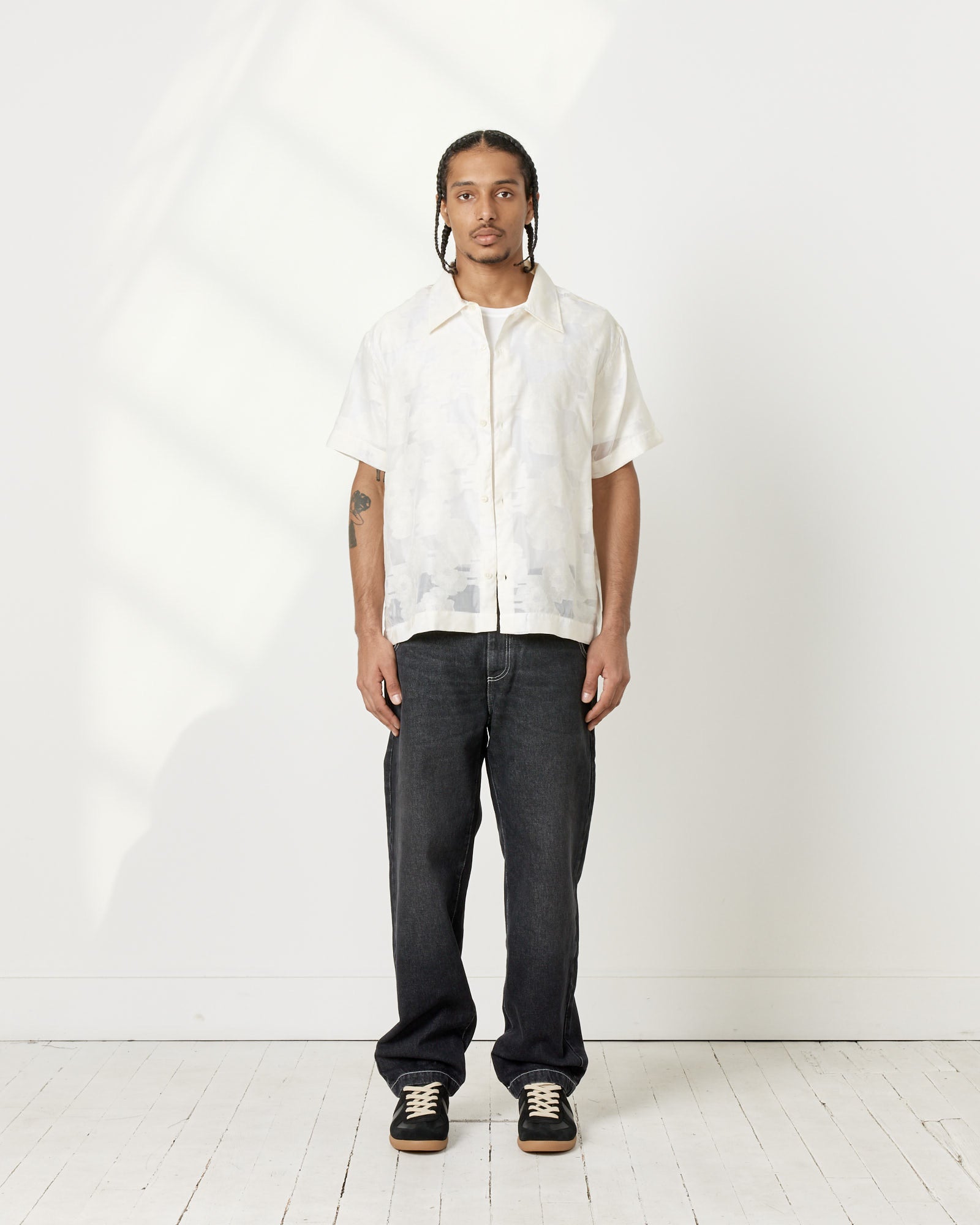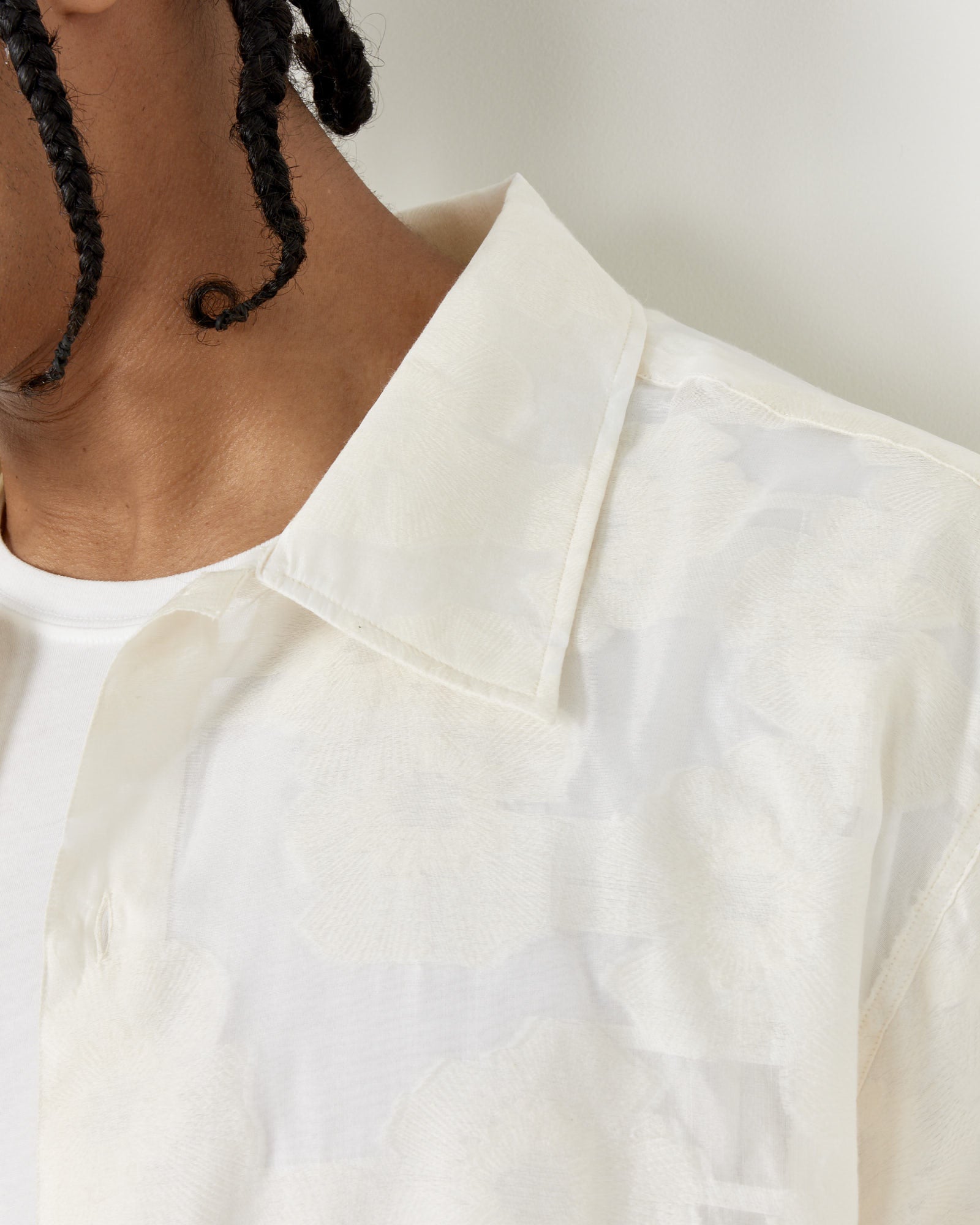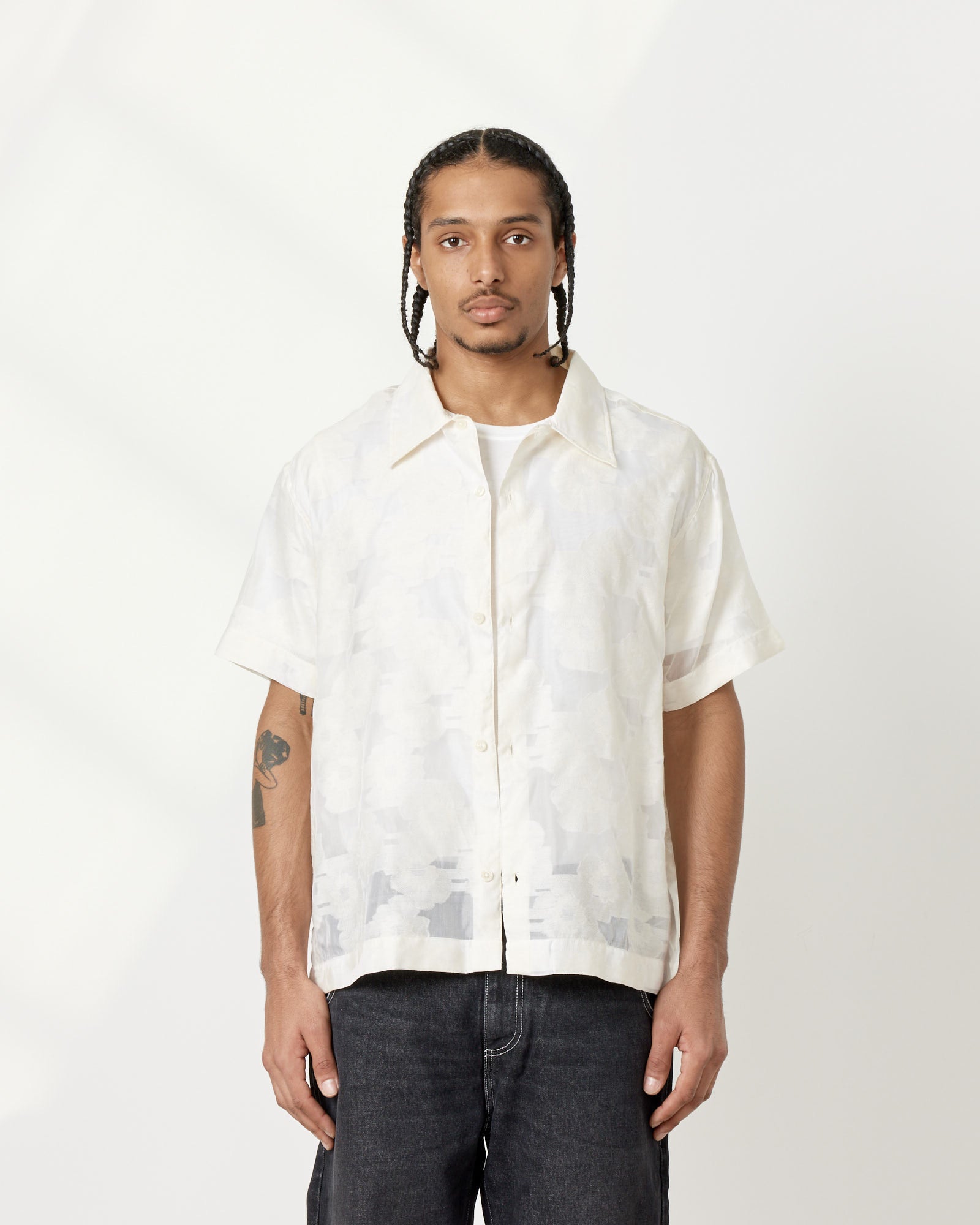 A chic shirt for both casual and dressed-up settings, mfpen's Holiday Shirt features a lightweight semi-sheer blend of cotton, silk, and polyester done in a beautiful floral jacquard with a point collar, dropped shoulders, and a boxy silhouette.