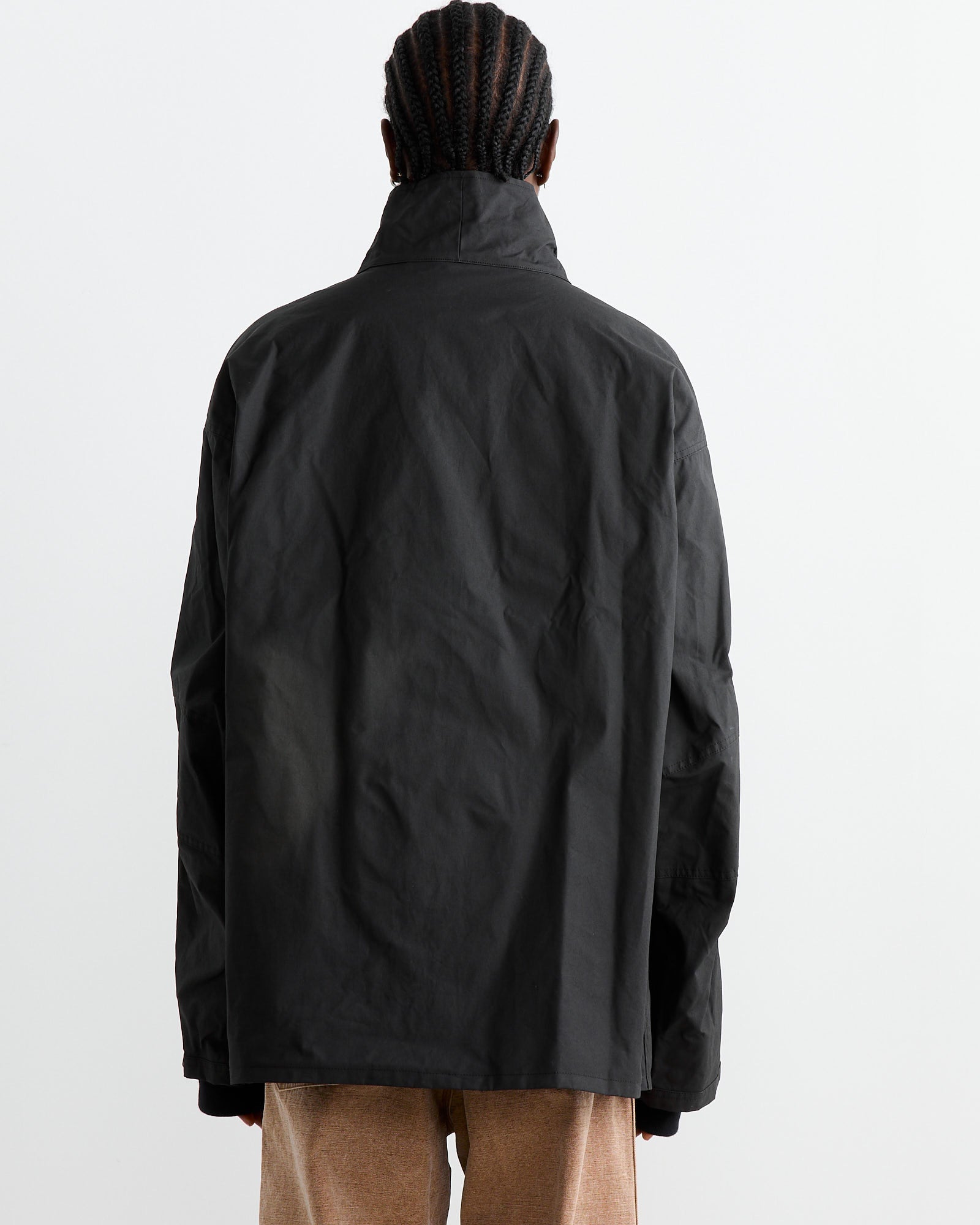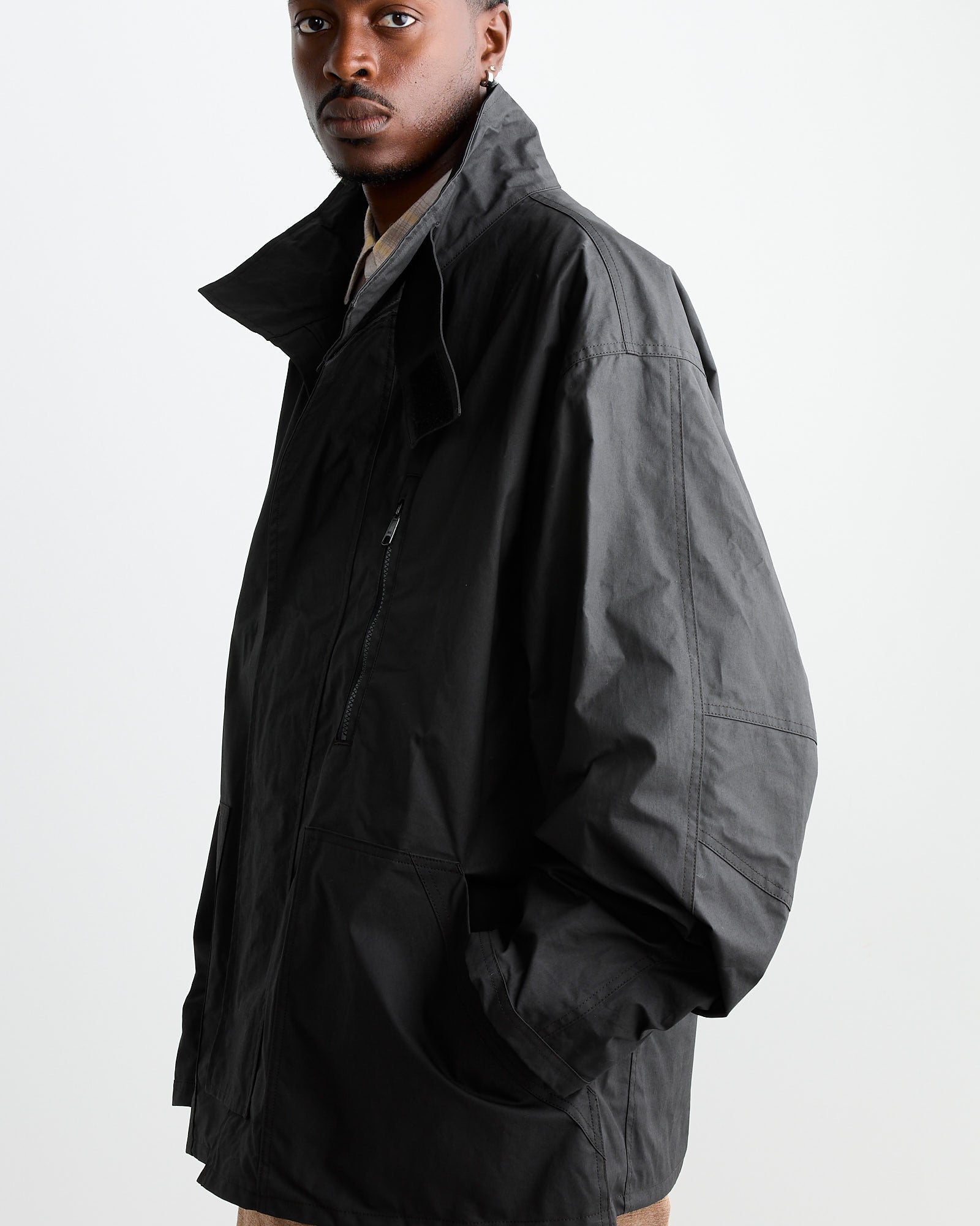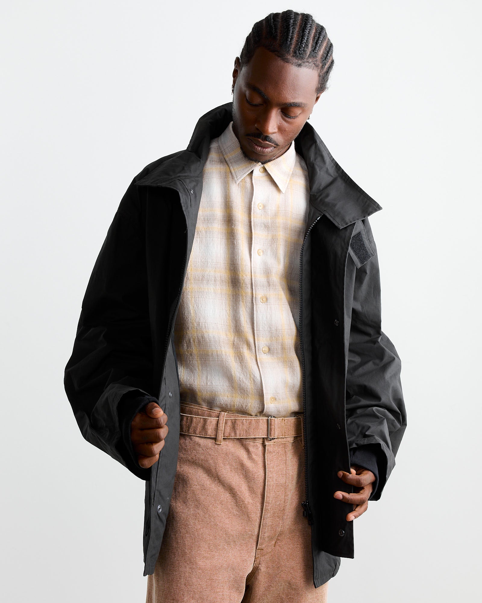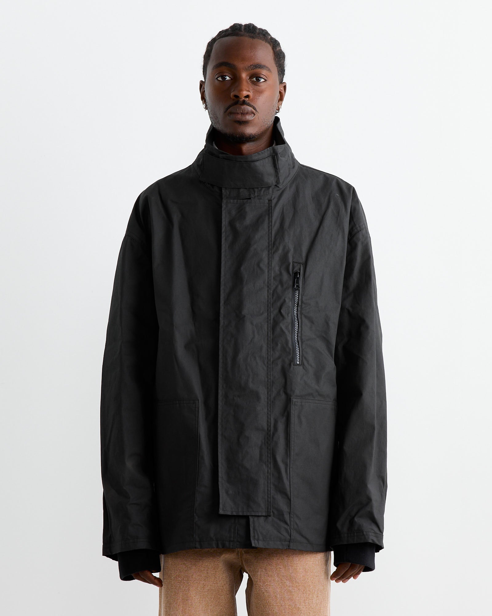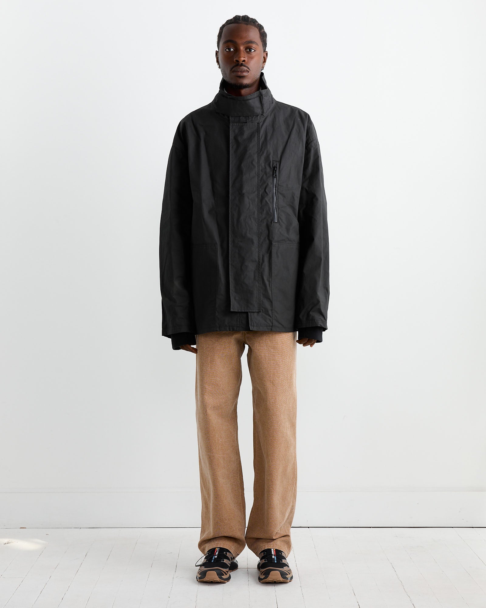 The MHL Firemans Coat in Ebony is crafted from a coated cotton plainweave, offering durability and weather resistance. It features an oversized fit with a two-way zip and herringbone tape puller, complemented by a popper-fastening storm flap for extra protection. The coat's design is inspired by traditional fireman's gear, making it both practical and stylish for everyday wear.