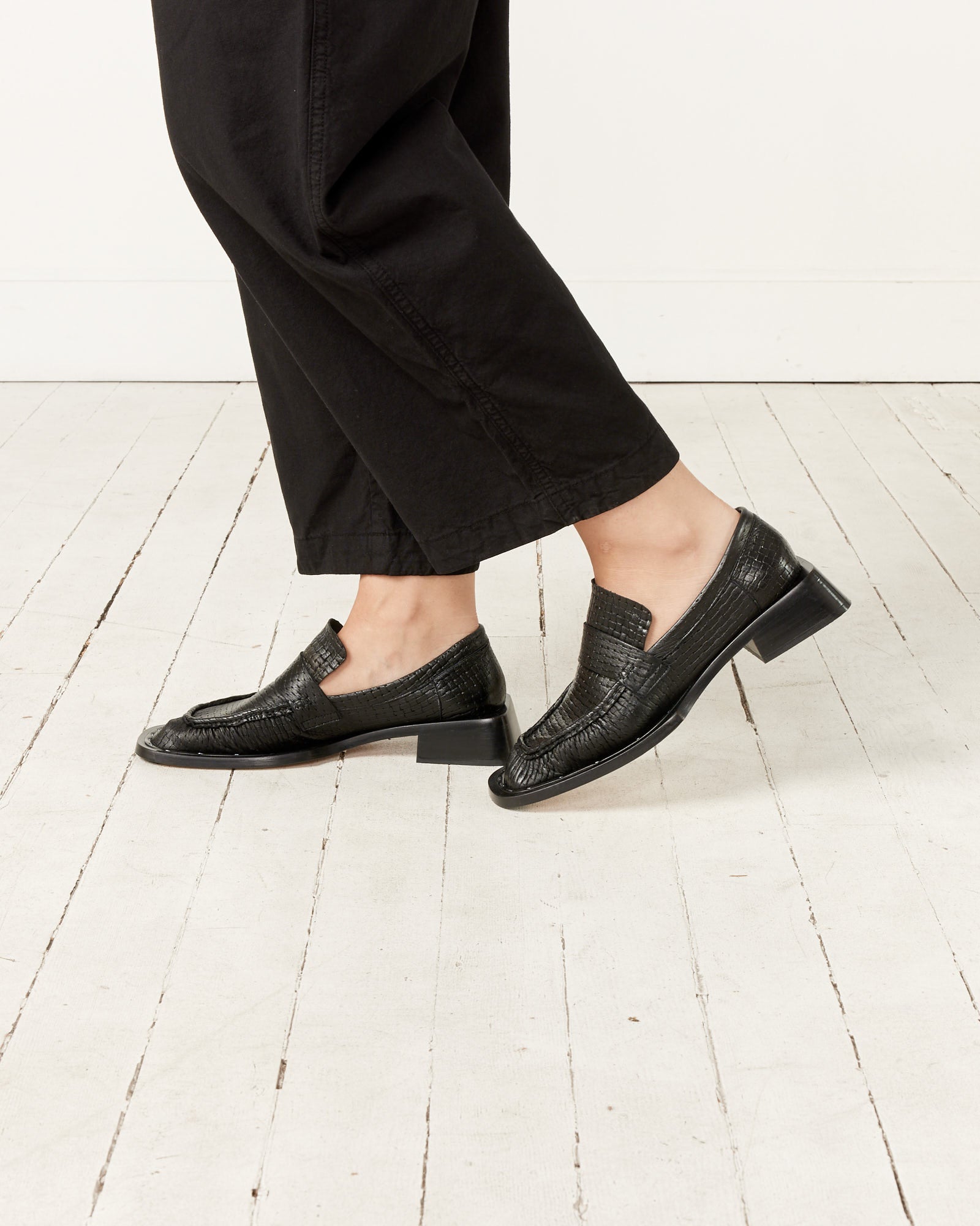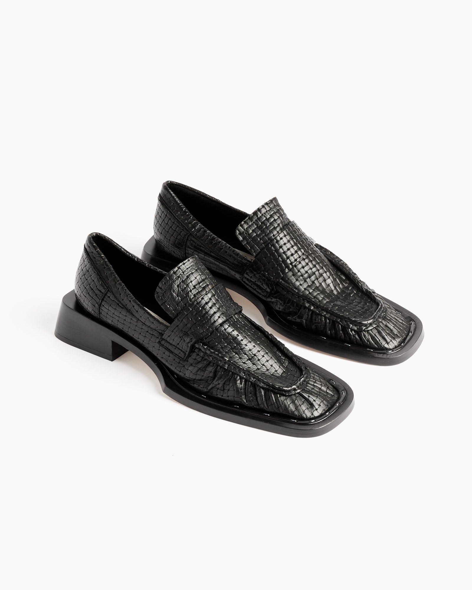 Miista's Airi Loafers feature a woven leather upper, a flared stacked-leather heel with a rubber heel cap for traction, a rubber-invected toe to protect the sole, and an ultra-cusioned memory foam insole for extra comfort.