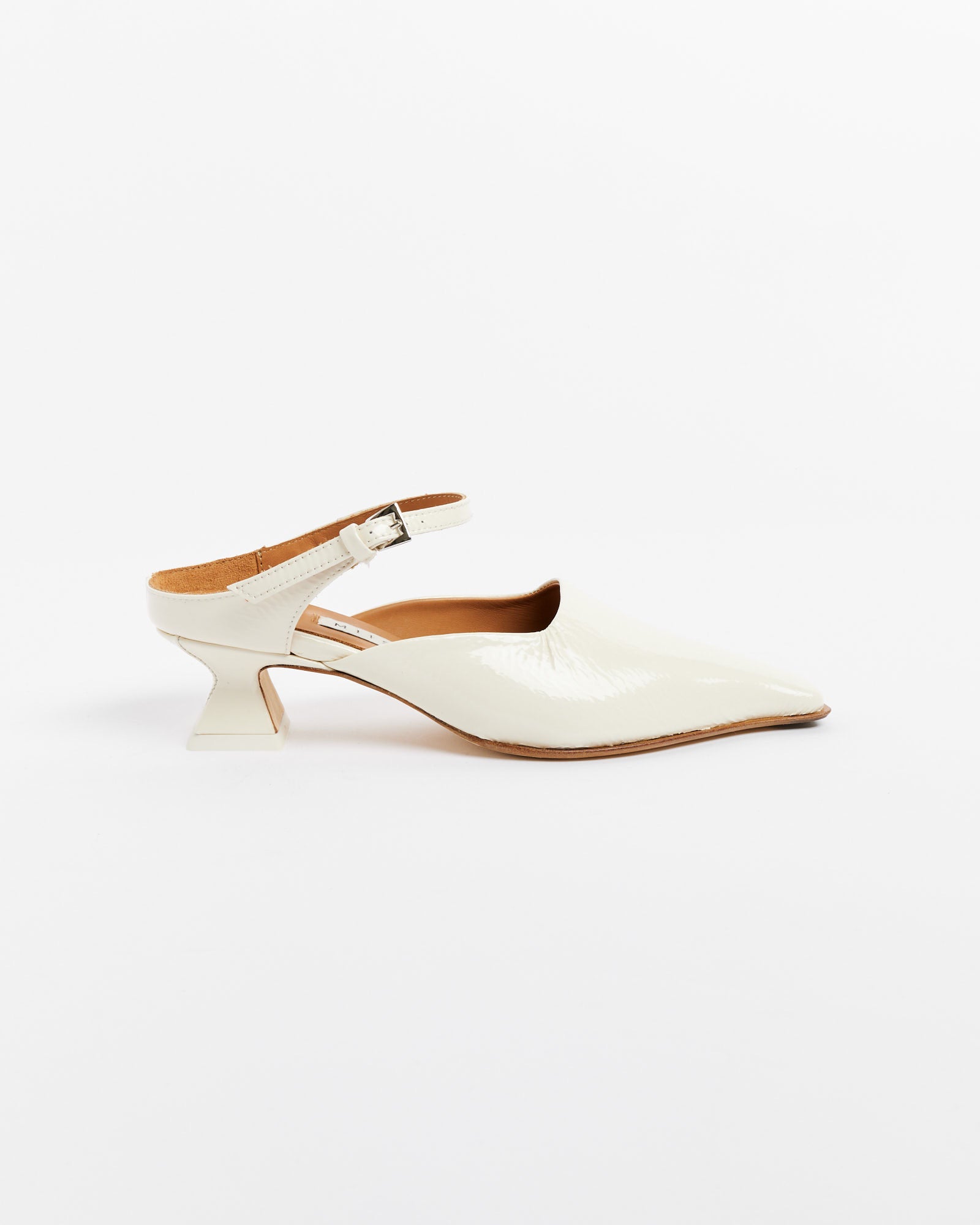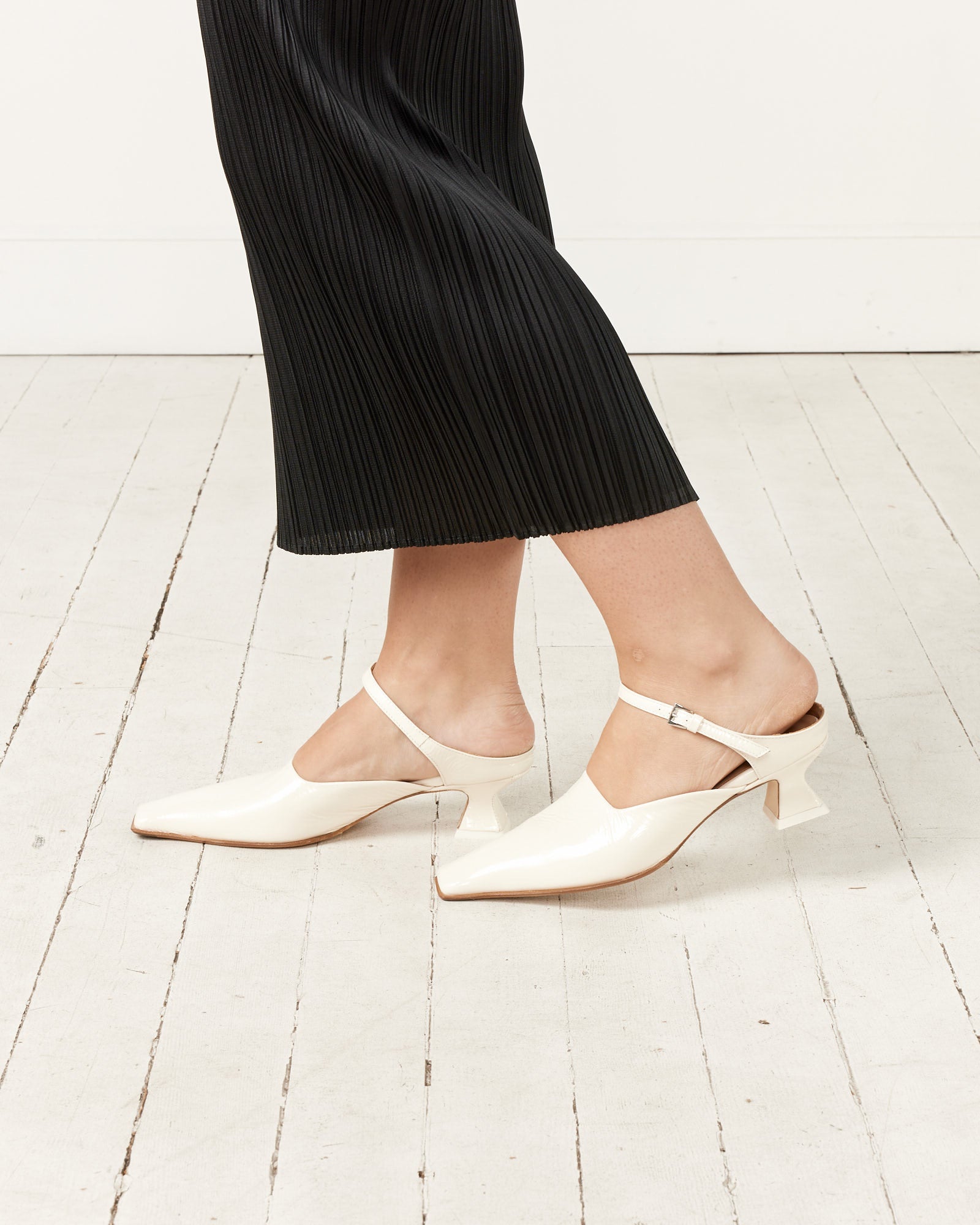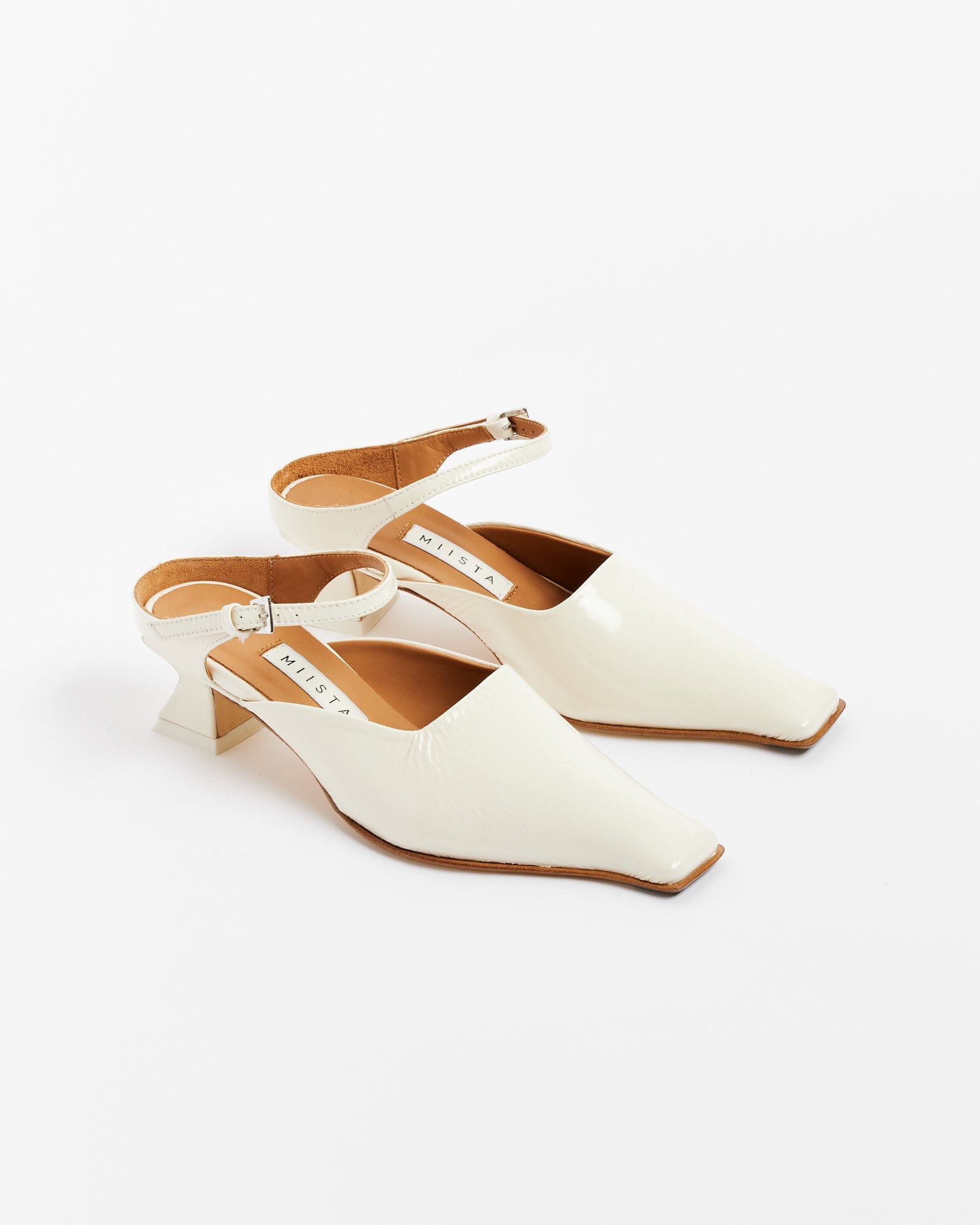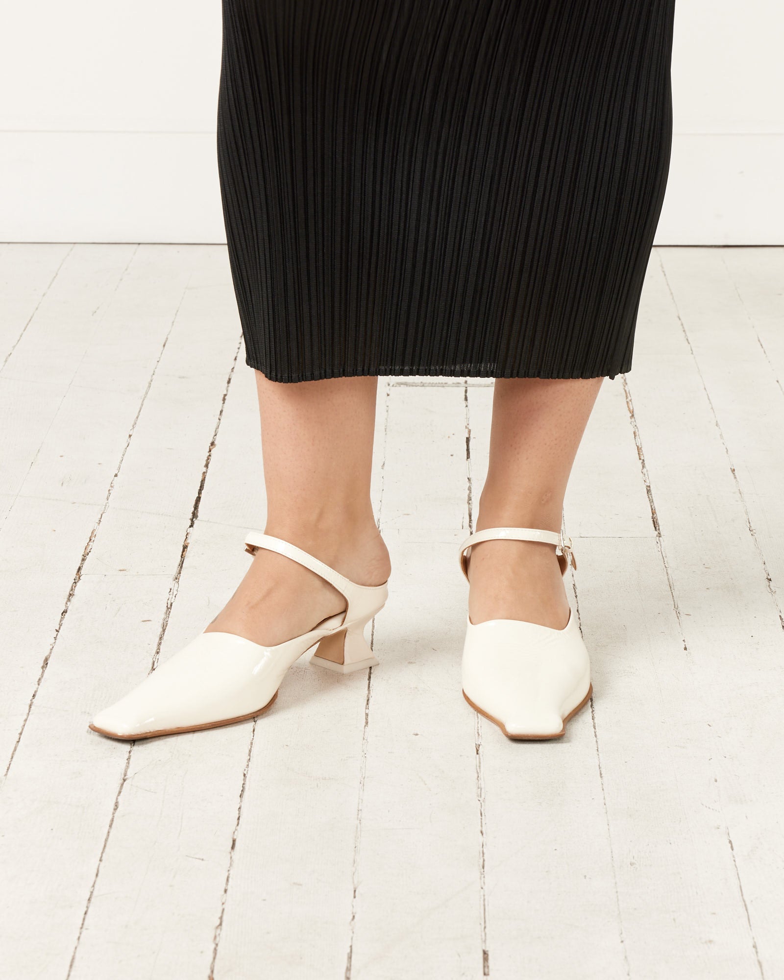 Miista's Delf Court Heel features a patent leather sheepskin upper, a toe that elongates to a square point, a stitched leather heel, and is finished with memory foam insoles and vegetable tan cow leather lining for enhanced comfort, and a rubber heel and a rubber-invected toe for traction and durability.