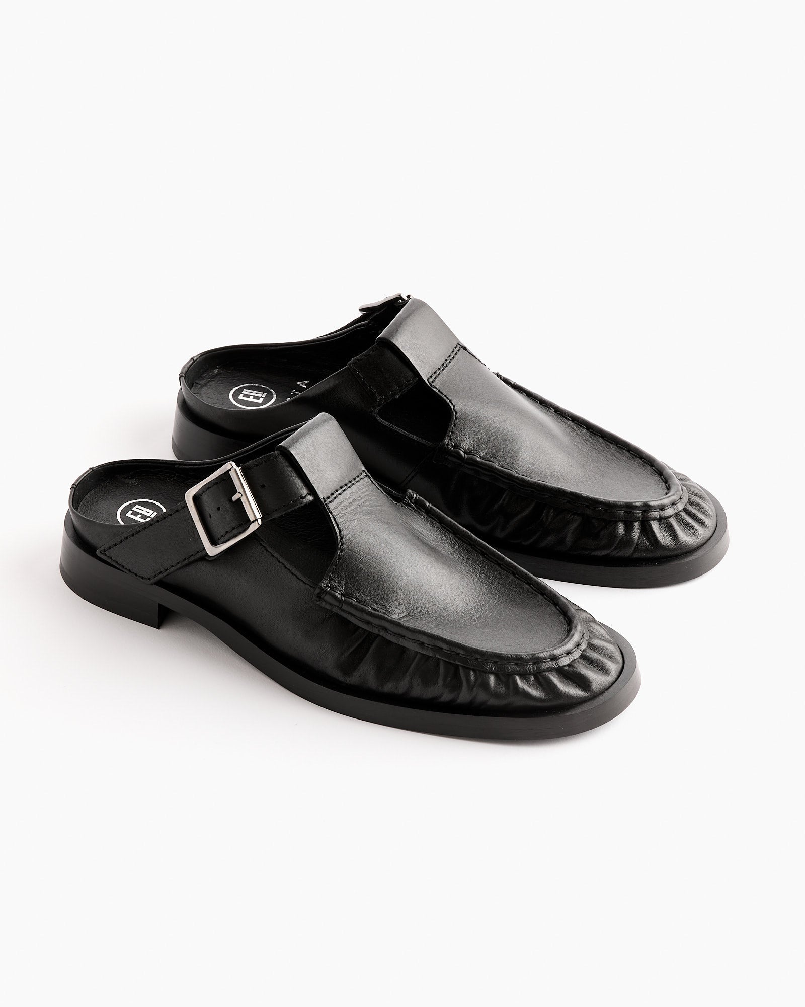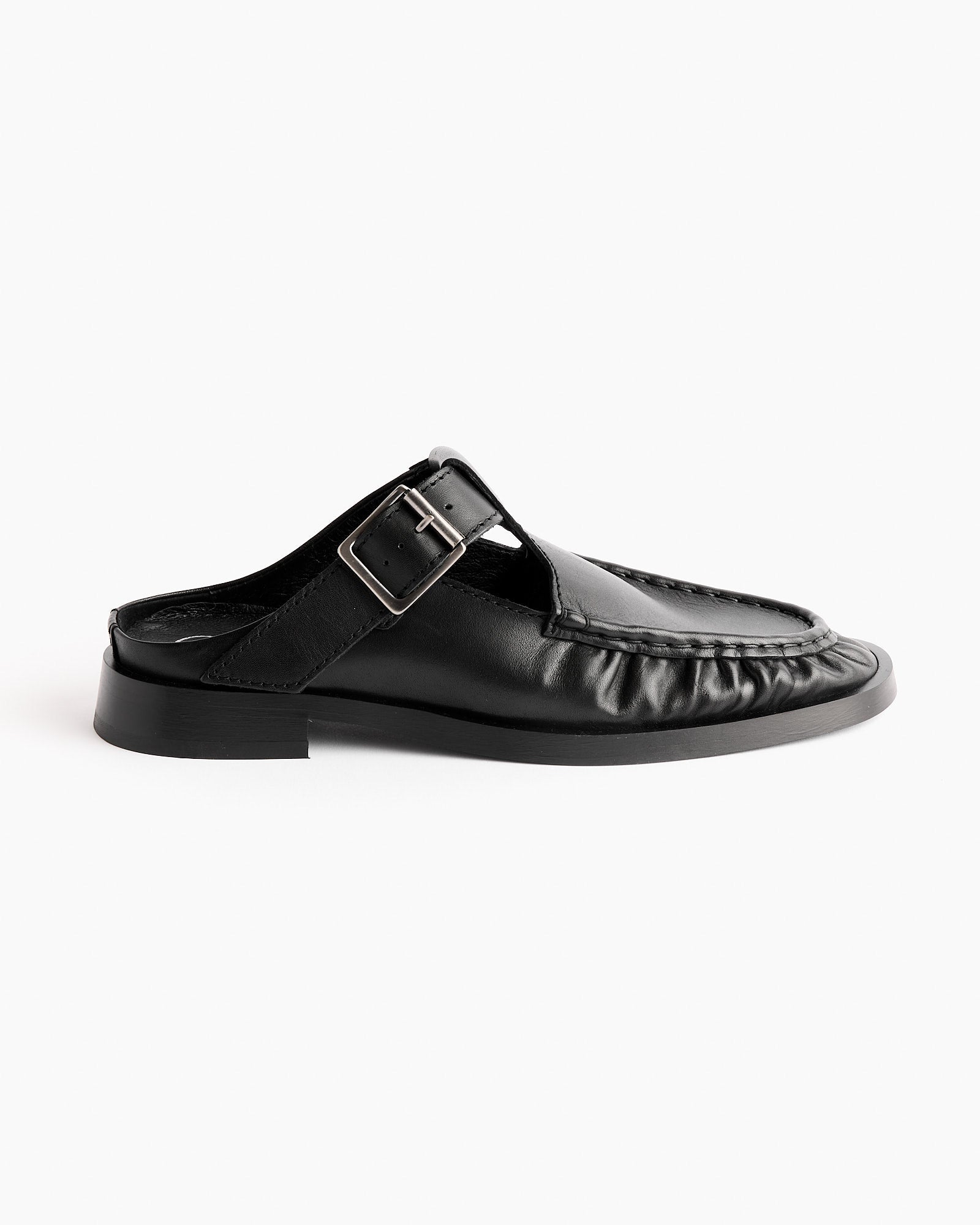 The Miista Gianna Open Back Mary Janes in Black offer a modern take on a classic silhouette. Designed with a closed toe and open back, the leather upper is paired with an adjustable strap for a secure fit. Set on a low stacked heel, the style features a mix of cow and vegan leather lining for comfort and a rubber outsole for durability.
