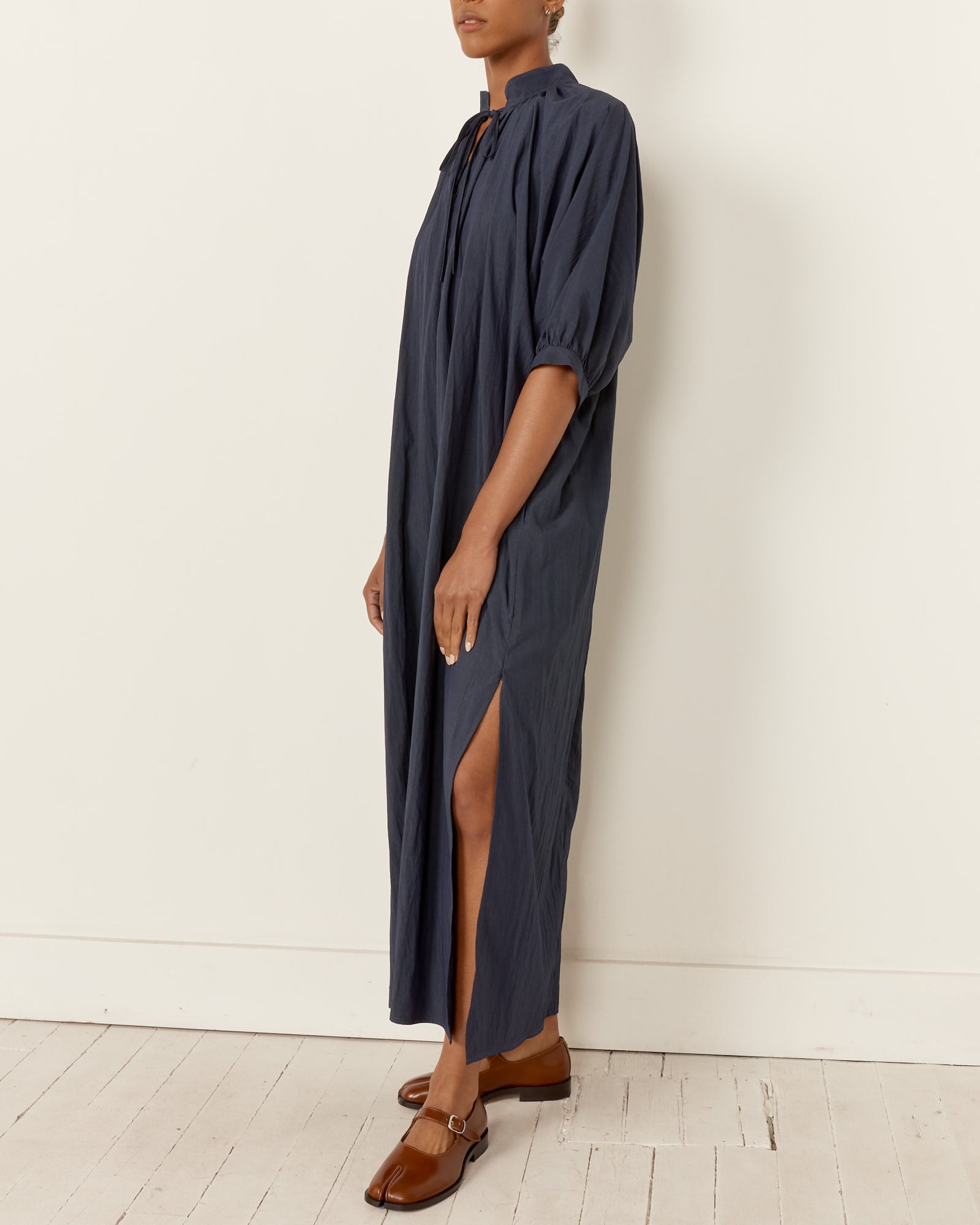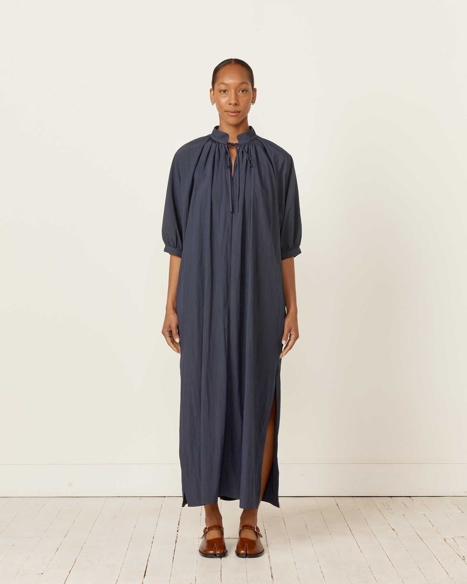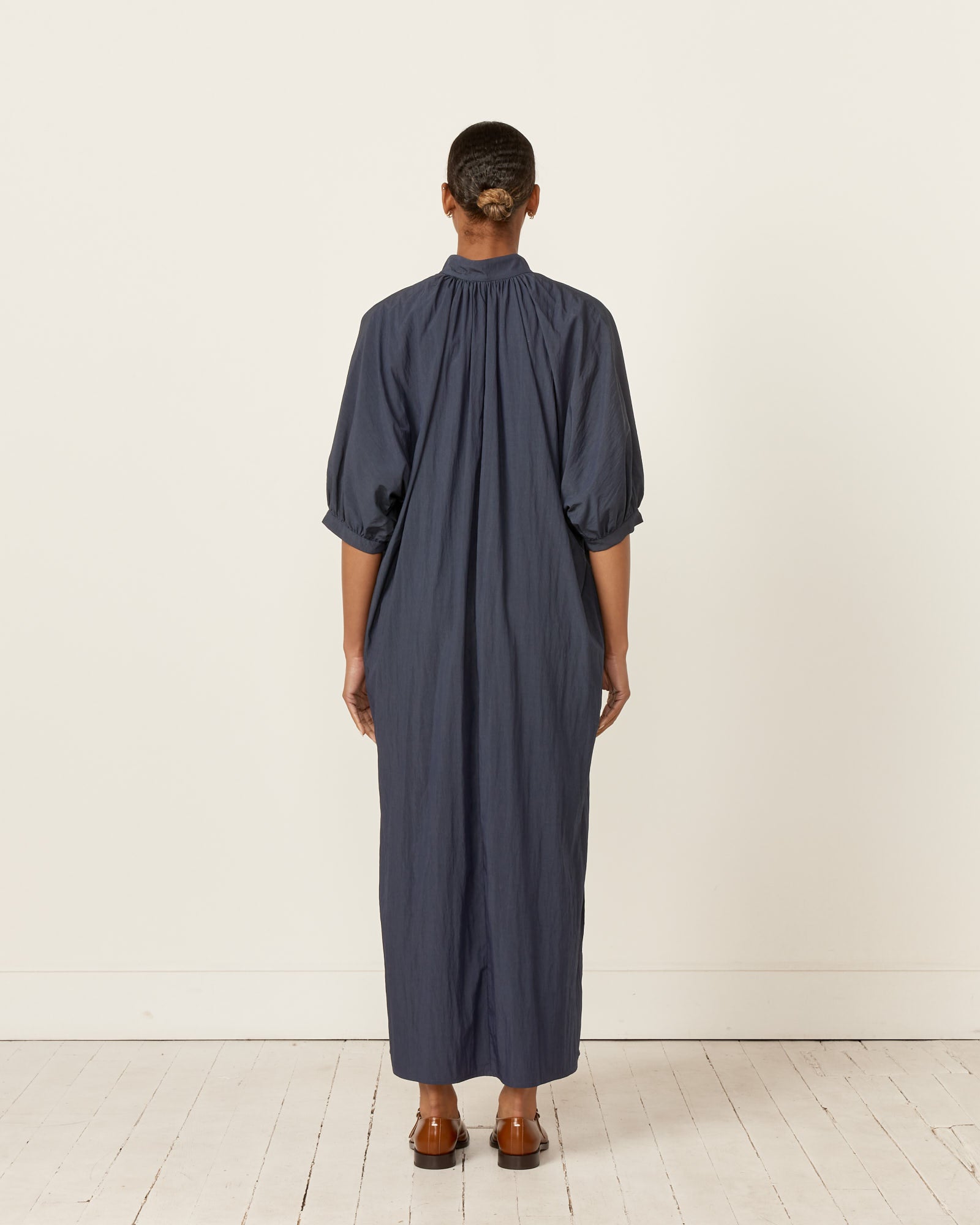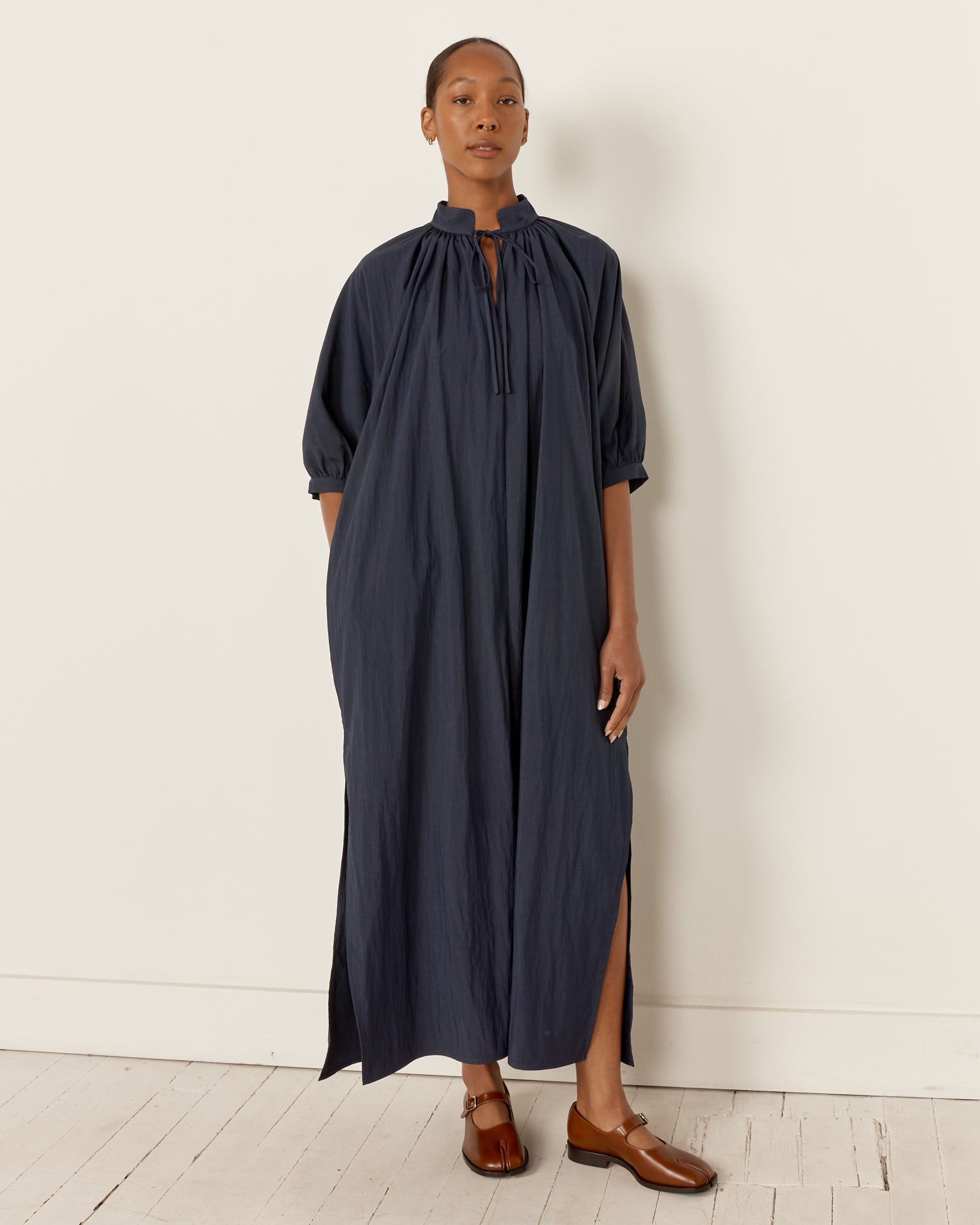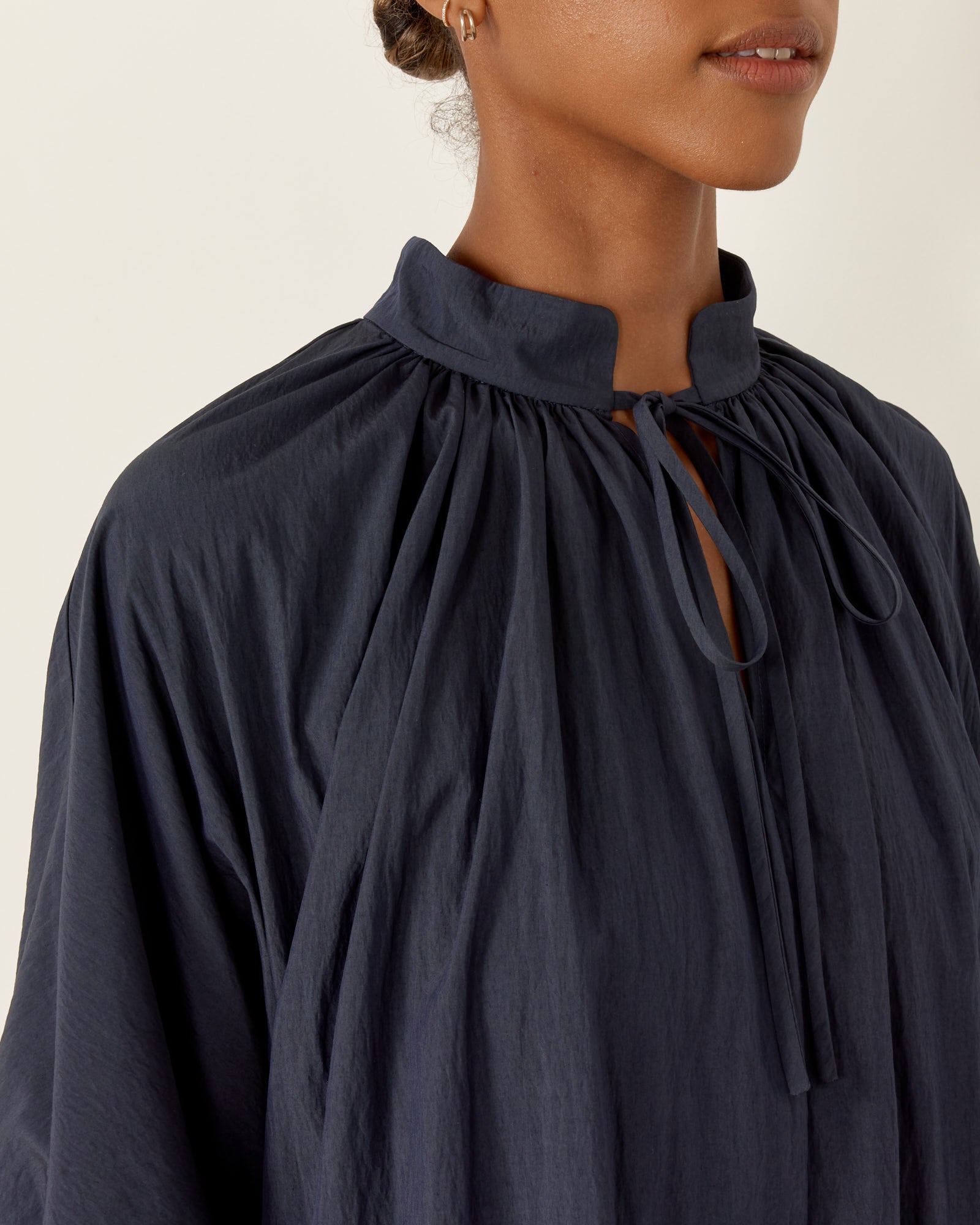 Done in a smooth blend of rayon and nylon, Mijeong Park's unlined Shirred Dress leans on an oversized silhouette to accentuate beautiful gathering along its open band collar, back neckline, and banded cuffs, and is finished with vented side seams, side seam pockets, and a drawstring closure at its v-neckline.